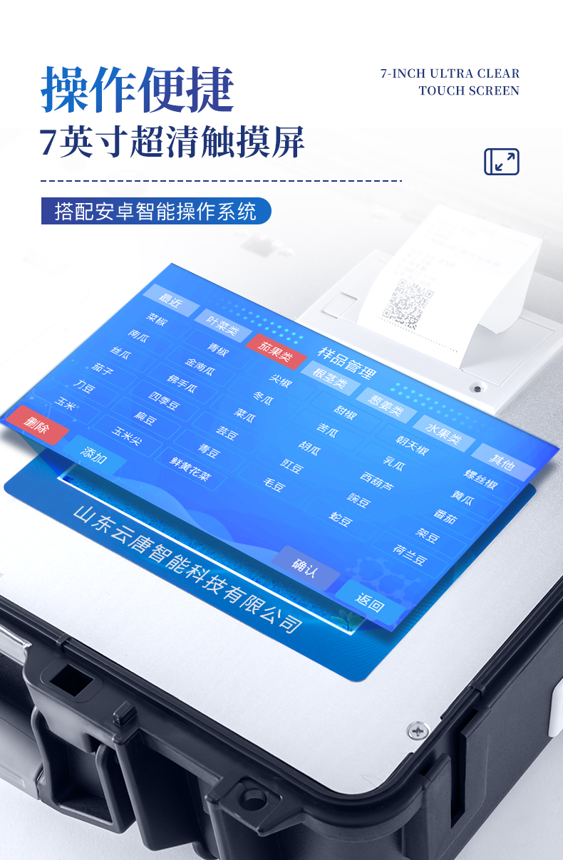 | 機(jī)箱采用工業(yè)級(jí)ABS工程塑料箱,方便攜帶,穩(wěn)固耐用,便于流動(dòng)測(cè)試。 | 安卓智能操作系統(tǒng),采用更加**的UI交互界面,具有wifi聯(lián)網(wǎng)上傳、4G聯(lián)網(wǎng)傳輸、GPRS無(wú)線遠(yuǎn)傳、網(wǎng)線連接功能,快速批量上傳數(shù)據(jù)。 | 一體化主機(jī),包含多通道光電檢測(cè)模塊、膠體金免疫層析檢測(cè)模塊。 | 膠體金模塊檢測(cè)方式:軌道式自動(dòng)傳輸掃描,檢測(cè)完成后自動(dòng)退出檢測(cè)卡。 | CT線自動(dòng)識(shí)別,無(wú)需手動(dòng)調(diào)整,檢測(cè)完成自動(dòng)顯示CT坐標(biāo)曲線。 | 儀器具有自檢功能:具有開(kāi)機(jī)自檢和調(diào)零功能,具有自動(dòng)檢測(cè)重復(fù)性功能。 | 新一代高速熱敏打印機(jī),檢測(cè)完成可自動(dòng)打印或批量打印檢測(cè)報(bào)告和二維碼。 | 儀器帶有監(jiān)管平臺(tái),數(shù)據(jù)可局域網(wǎng)和互聯(lián)網(wǎng)數(shù)據(jù)上傳,檢測(cè)結(jié)果直接傳至食品安全監(jiān)管平臺(tái)。進(jìn)行區(qū)域食品安全監(jiān)管及大數(shù)據(jù)分析處理與數(shù)據(jù)統(tǒng)計(jì),檢測(cè)區(qū)域農(nóng)產(chǎn)品安全長(zhǎng)短期動(dòng)態(tài),達(dá)到食品安全問(wèn)題預(yù)估、預(yù)警 | 內(nèi)置強(qiáng)大的數(shù)據(jù)庫(kù),具有多品類多種類樣品菜單功能,可靈活選擇檢測(cè)樣品,不同的檢測(cè)通道可同時(shí)檢測(cè)不同的樣品項(xiàng)目。也可在儀器上直接編輯錄入樣品名稱、檢測(cè)指標(biāo)、送檢單位等信息并保存進(jìn)樣品數(shù)據(jù)庫(kù)。 | 產(chǎn)品內(nèi)置操作演示視頻,是您身邊的化驗(yàn)指導(dǎo)專家。 | 樣品處理簡(jiǎn)單省力,整體操作快速、安全、便捷。 | 高靈敏度,高檢測(cè)精度,高重復(fù)性精度,掃描式高精度光學(xué)傳感器。 | 結(jié)果判定線可修改,對(duì)照值標(biāo)定值可保存,斷電不丟失數(shù)據(jù)。 | 兼容市場(chǎng)上所有的膠體金卡,使用耗材不受限制。 | 儀器具有重新校準(zhǔn)、鎖定、恢復(fù)出廠設(shè)置功能。 |