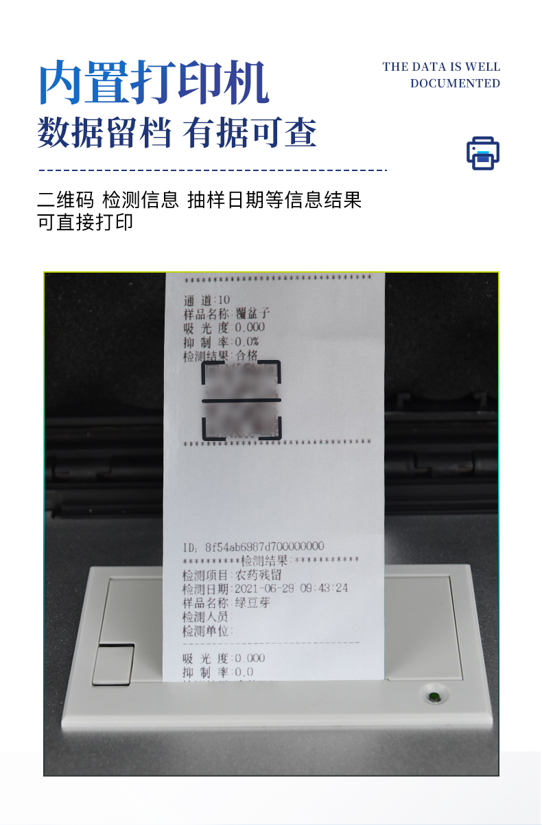顯示方式:≥5英寸液晶觸摸屏顯示,人性化中文操作界面,讀數(shù)直觀、簡(jiǎn)單。配備嵌入式高速熱敏打印機(jī),可選擇手動(dòng)打印或者自動(dòng)打印,三分鐘出打印結(jié)果。光源采用進(jìn)口超高亮發(fā)光二極管,具有低功耗、穩(wěn)定性強(qiáng)、高靈敏度,高檢測(cè)精度,高重復(fù)性精度,光源可控、響應(yīng)速度快等優(yōu)點(diǎn)。采用標(biāo)準(zhǔn)USB接口設(shè)計(jì),免驅(qū)動(dòng)安裝,方便數(shù)據(jù)的存貯和移動(dòng),并可隨時(shí)與計(jì)算機(jī)直接相連,并且可用計(jì)算機(jī)控制儀器。實(shí)現(xiàn)數(shù)據(jù)查詢、瀏覽、分析、統(tǒng)計(jì)、打印等。智能化程度高,儀器具有自檢功能:具有開(kāi)機(jī)自檢和調(diào)零功能,具有自動(dòng)檢測(cè)重復(fù)性功能內(nèi)置強(qiáng)大的數(shù)據(jù)庫(kù),可在儀器上直接選擇樣品名稱(chēng)、檢測(cè)指標(biāo)、送檢單位等信息,也可在儀器上直接編輯錄入樣品名稱(chēng)、檢測(cè)指標(biāo)、送檢單位等信息并保存進(jìn)樣品數(shù)據(jù)庫(kù)。支持Wifi網(wǎng)絡(luò),數(shù)據(jù)可局域網(wǎng)和互聯(lián)網(wǎng)數(shù)據(jù)上傳,檢測(cè)結(jié)果直接傳至食品安全監(jiān)管平臺(tái)。進(jìn)行區(qū)域食品安全監(jiān)管及大數(shù)據(jù)分析處理,檢測(cè)區(qū)域食品安全長(zhǎng)短期動(dòng)態(tài),達(dá)到食品安全問(wèn)題預(yù)估、預(yù)警