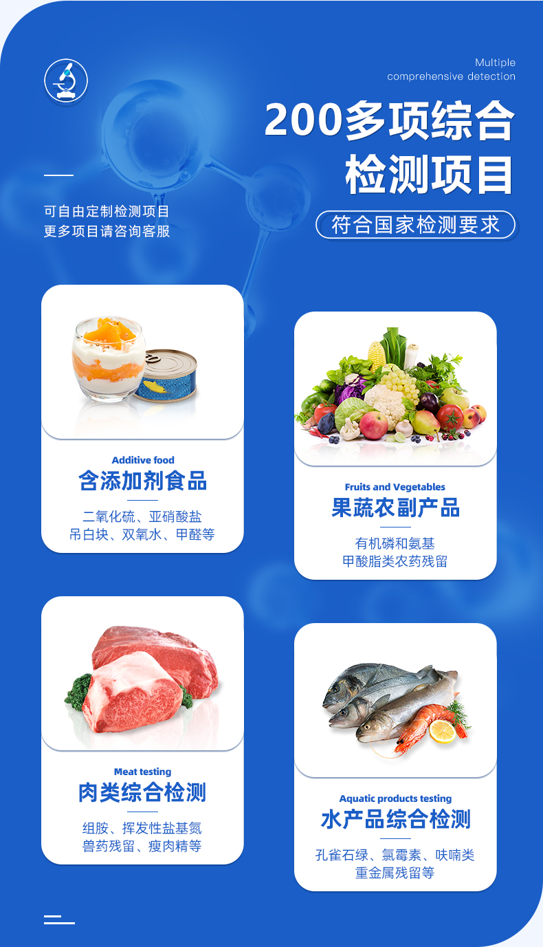 | 食品添加劑:二氧化硫、雙氧水、亞硝酸鹽、硝酸鹽、苯甲酸鈉、山梨酸、糖精鈉、甜蜜素、安賽蜜、硫酸鎂等 | 有毒有害物質(zhì):甲醛、吊白塊、硼砂、過氧化苯甲酰、溴酸鉀、羅丹明B、三聚氰胺、蘇丹紅等 | 果蔬中:有機(jī)磷和氨基甲酸酯類農(nóng)藥殘留; | 病害肉診斷:組胺、揮發(fā)性鹽基氮、肉制品酸價(jià)、水發(fā)產(chǎn)品中組胺 | 重金屬含量:鉛、鎘、鉻、汞、砷、錫、鎳、鋁等;食用油脂檢測:過氧化值、酸價(jià)、油脂丙二醛等。 | 瘦肉精激素類(獸藥):鹽酸克倫特羅、沙丁胺醇、萊克多巴胺、己烯雌酚、喹乙醇等 | 抗生素殘留類(獸藥):四環(huán)素類、硝基呋喃類、磺胺類、沙星類、喹諾酮類、慶大霉素、鏈霉素、阿莫西林、紅霉素等 | 水產(chǎn)品安全類:孔雀石綠、氯霉素、呋喃妥因代謝、呋喃西林代謝、呋喃它酮代謝、呋喃唑酮代謝等 | 真菌毒素類:食用油、糧食及飼料中黃曲霉毒素B1、奶中黃曲霉毒素M1、嘔吐毒素、玉米赤霉烯酮、赭曲霉毒素A等 | 水酒飲品分析:乳品及牛奶中蛋白質(zhì);酒中甲醇、乙醇、雜醇油;蜂蜜中果糖和葡萄糖、蔗糖、淀粉酶、酸度;水中氰化物、余氯,飲料中維C等 | 調(diào)味品成分:食醋的總酸、醬油的總酸、芝麻油純度、谷氨酸鈉、醬油氨基酸態(tài)氮、食鹽中亞鐵氰化鉀、食鹽中碘等 | 食用色素類:紅色色素(胭脂紅、莧菜紅、赤蘚紅、誘惑紅)、黃色色素(檸檬黃、日落黃)、藍(lán)色色素(亮藍(lán))等 | 動(dòng)物疫病類:豬藍(lán)耳病毒、豬瘟病毒、豬偽狂犬病毒、豬偽狂犬病毒gE蛋白、豬口蹄疫3ABC蛋白、豬口蹄疫病毒IgG、豬細(xì)小病毒、雞禽流感等 |