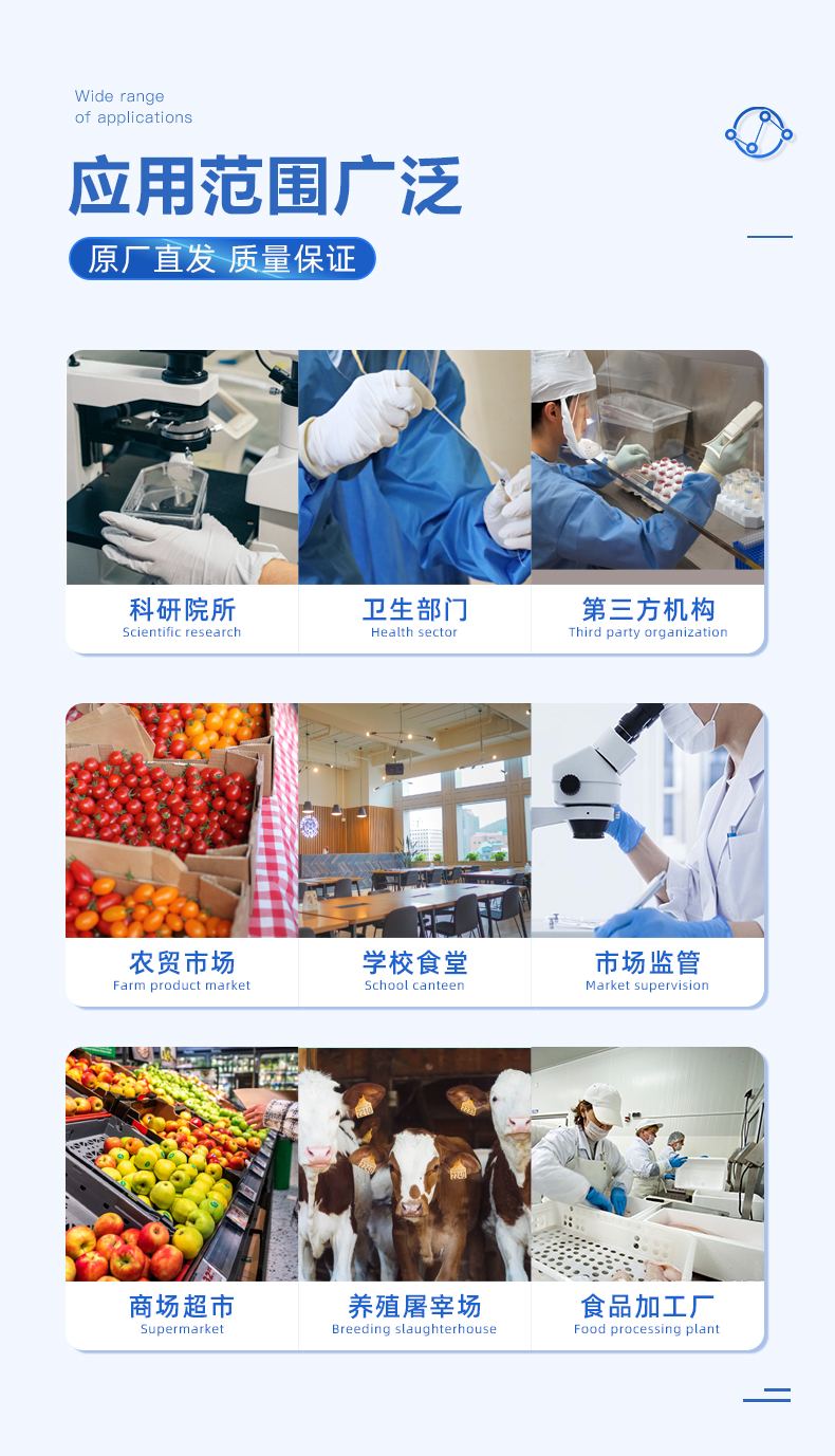 | 食品添加劑:二氧化硫、雙氧水、亞硝酸鹽、硝酸鹽、苯甲酸鈉、山梨酸、糖精鈉、甜蜜素、安賽蜜、硫酸鎂等 | 有毒有害物質(zhì):甲醛、吊白塊、硼砂、過(guò)氧化苯甲酰、溴酸鉀、羅丹明B、三聚氰胺、蘇丹紅等 | 果蔬中:有機(jī)磷和氨基甲酸酯類農(nóng)藥殘留; | 病害肉診斷:組胺、揮發(fā)性鹽基氮、肉制品酸價(jià)、水發(fā)產(chǎn)品中組胺 | 重金屬含量:鉛、鎘、鉻、汞、砷、錫、鎳、鋁等;食用油脂檢測(cè):過(guò)氧化值、酸價(jià)、油脂丙二醛等。 | 瘦肉精激素類(獸藥):鹽酸克倫特羅、沙丁胺醇、萊克多巴胺、己烯雌酚、喹乙醇等 | 抗生素殘留類(獸藥):四環(huán)素類、硝基呋喃類、磺胺類、沙星類、喹諾酮類、慶大霉素、鏈霉素、阿莫西林、紅霉素等 | 水產(chǎn)品安全類:孔雀石綠、氯霉素、呋喃妥因代謝、呋喃西林代謝、呋喃它酮代謝、呋喃唑酮代謝等 | 真菌毒素類:食用油、糧食及飼料中黃曲霉毒素B1、奶中黃曲霉毒素M1、嘔吐毒素、玉米赤霉烯酮、赭曲霉毒素A等 | 水酒飲品分析:乳品及牛奶中蛋白質(zhì);酒中甲醇、乙醇、雜醇油;蜂蜜中果糖和葡萄糖、蔗糖、淀粉酶、酸度;水中氰化物、余氯,飲料中維C等 | 調(diào)味品成分:食醋的總酸、醬油的總酸、芝麻油純度、谷氨酸鈉、醬油氨基酸態(tài)氮、食鹽中亞鐵氰化鉀、食鹽中碘等 | 食用色素類:紅色色素(胭脂紅、莧菜紅、赤蘚紅、誘惑紅)、黃色色素(檸檬黃、日落黃)、藍(lán)色色素(亮藍(lán))等 | 動(dòng)物疫病類:豬藍(lán)耳病毒、豬瘟病毒、豬偽狂犬病毒、豬偽狂犬病毒gE蛋白、豬口蹄疫3ABC蛋白、豬口蹄疫病毒IgG、豬細(xì)小病毒、雞禽流感等 |