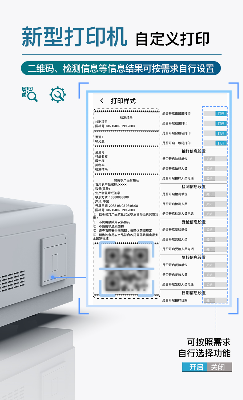 | 1、儀器采用臺式一體化系統(tǒng)檢測技術(shù),將分光光度模塊、膠體金檢測模塊、新型農(nóng)殘檢測模塊、數(shù)字化管理模塊、無線通訊模塊高度集成于一體,支持檢測200種食品安全檢測項目,同時預(yù)留升級檢測方法。 | 2、儀器檢測模塊標(biāo)準(zhǔn)化、智能化,檢測項目可隨意自由組合。檢測箱體內(nèi)置多個標(biāo)準(zhǔn)檢測單元,檢測模塊可以調(diào)整配置。 | 3、顯示屏幕:儀器采用10.1英寸豎向液晶觸摸屏顯,搭配運行安卓智能操作系統(tǒng),主控芯片采用ARM Cortex-A7,RK3288/4核處理器,主頻1.88Ghz,操作方便,性能更強。 | 4、檢測通道:≥12通道;采用精密旋轉(zhuǎn)比色池設(shè)計,使用同芯片同光源校準(zhǔn)精度,解決不同光源之間的誤差值,更加準(zhǔn)確**。(1-12通道間誤差0.1%,***:**202022821055.2) | 5、儀器光源:高精度進口四波長冷光源,每個通道均配置 410、520、590、630nm 波長光源,標(biāo)配**的光路切換裝置,專利光路切換功能可實現(xiàn)64波長,并且所有檢測項目可實現(xiàn)所有通道同時檢測。 | 6、設(shè)備可一鍵校準(zhǔn),自動保存校準(zhǔn)數(shù)據(jù),自動對比校驗,得到精準(zhǔn)光源,采用Android SP存儲數(shù)據(jù),光源數(shù)據(jù)永不丟失,方便每一次使用。 | 7、通訊接口:配備無線通信模塊、4G(APN)通訊模塊、藍牙傳輸,同時具有雙USB接口以及RJ45網(wǎng)線接口,可以多方式實現(xiàn)數(shù)據(jù)保存及數(shù)據(jù)傳輸。 | 8、存儲方式:支持U盤存儲,標(biāo)準(zhǔn)USB接口,免驅(qū)動安裝。檢測結(jié)果存儲容量20萬條以上,可生成Excel表格進行拷貝,并具有登錄保護功能。 | 9、智能化操作系統(tǒng): | 9.1、操作系統(tǒng):儀器可在同一檢測界面自動對應(yīng)相關(guān)檢測通道,一次性選擇1-12個樣品名稱,無需退出界面,節(jié)省操作時間。并可以對每個通道屬性和樣品信息單獨進行編輯,例如送檢單位、人員,檢測人員等,打印時勾選打印顯示。 | 9.2、數(shù)據(jù)集成系統(tǒng):設(shè)備首頁自動匯總分析檢測數(shù)據(jù),包含:周檢測數(shù)據(jù)、月檢測數(shù)據(jù),全部檢測總數(shù)量,均包含檢測總數(shù),合格數(shù),不合格數(shù),以及相關(guān)柱形分析圖,各項檢測數(shù)據(jù)一目了然,無需電腦查詢,更加快捷直觀。 | 9.3、數(shù)據(jù)庫系統(tǒng):十幾項數(shù)據(jù)庫分類管理儀器:包含項目類型、項目數(shù)據(jù)、檢測數(shù)據(jù)、歷史記錄、國標(biāo)信息、曲線信息、采樣信息、檢測信息、受檢信息、復(fù)核信息、圖表信息、光源校準(zhǔn)信息、打印樣式信息、樣品庫信息等等,數(shù)據(jù)庫之間互相協(xié)調(diào)聯(lián)動保證數(shù)據(jù)的真實完整性。同時產(chǎn)品數(shù)據(jù)庫以及歷史檢測記錄支持一鍵檢索功能。 | 9.4、限量規(guī)判系統(tǒng):具有限量查詢、添加物質(zhì)合規(guī)判定系統(tǒng)。檢測出結(jié)果后,系統(tǒng)自動調(diào)用系統(tǒng)數(shù)據(jù)庫中相關(guān)國標(biāo)進行比對判定,客觀顯示判定結(jié)果是否合格。 | 9.5、項目預(yù)設(shè)系統(tǒng):儀器具有任務(wù)預(yù)設(shè)模塊,一鍵提前預(yù)設(shè),給出方便快捷的新檢測方案,每一個任務(wù)分別可以設(shè)置不同的樣品、批次、編號、來源、備注、抽樣信息、檢測信息、受檢信息、復(fù)核信息等更多信息。樣品送檢時一鍵調(diào)取保存信息,并可多次調(diào)取,大大提高檢測效率。 | 9.6、數(shù)據(jù)監(jiān)管系統(tǒng):同步對接監(jiān)管平臺,數(shù)據(jù)可局域網(wǎng)和互聯(lián)網(wǎng)數(shù)據(jù)上傳,檢測結(jié)果可選擇直接傳至食品安全監(jiān)管平臺。進行區(qū)域食品安全監(jiān)管及大數(shù)據(jù)分析處理與數(shù)據(jù)統(tǒng)計,檢測區(qū)域食品安全長短期動態(tài),達到食品安全問題預(yù)估、預(yù)警。 | 9.7.1、全新打印系統(tǒng):內(nèi)置全新打印機,新創(chuàng)自定義打印方式,可按需靈活勾選控制:產(chǎn)品合格證(國家農(nóng)業(yè)部標(biāo)準(zhǔn)要求),二維碼,抽樣信息、檢測信息,受檢信息、復(fù)核信息、抽樣日期、檢測日期等信息的打印。 | 9.7.2、A4紙版本報告打印功能(選配):設(shè)備擁有兩種結(jié)果展示方式,可以自動生成A4打印模板和小票打印模板兩種樣式,可通過WiFi及網(wǎng)線等方式鏈接外置打印機可進行打印。 | 10、供電模式:儀器交直流兩用,直流12V供電,可連接車載電源,可配6ah大容量充電鋰電池,電量可實時顯示,方便戶外流動測試。 | 11、膠體金檢測模塊:采用單通道CMOS成像處理技術(shù)及膠體金免疫層析技術(shù),可讀取膠體金卡數(shù)據(jù),自動采集、處理分析,將檢測結(jié)果顯示,并可根據(jù)參考限值自動判斷檢測結(jié)果,可檢測常見的獸藥殘留、生物毒素、抗生素、違禁添加物等。 | 11.1、探測技術(shù):CMOS成像探測; | 11.2、檢測通道:1個通道; | 11.3、檢測方式:消線法和比色法; | 11.4、顯示模式:陰性或陽性; | 11.5、曲線形式:直插式掃描方式,顯示金標(biāo)卡圖像,實時生成、識別CT曲線圖,無需手動調(diào)整,完成檢測后自動退出檢測卡。兼容市場上其他金標(biāo)卡,使用耗材不受限制。 | 12、儀器具備遠程升級功能,可定向分客戶分儀器更新,開機后自動更新,并可持續(xù)性免費更新系統(tǒng)版本,無需像傳統(tǒng)產(chǎn)