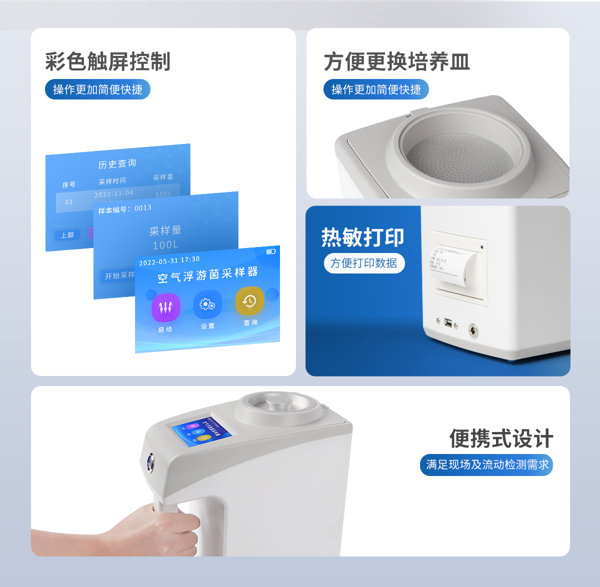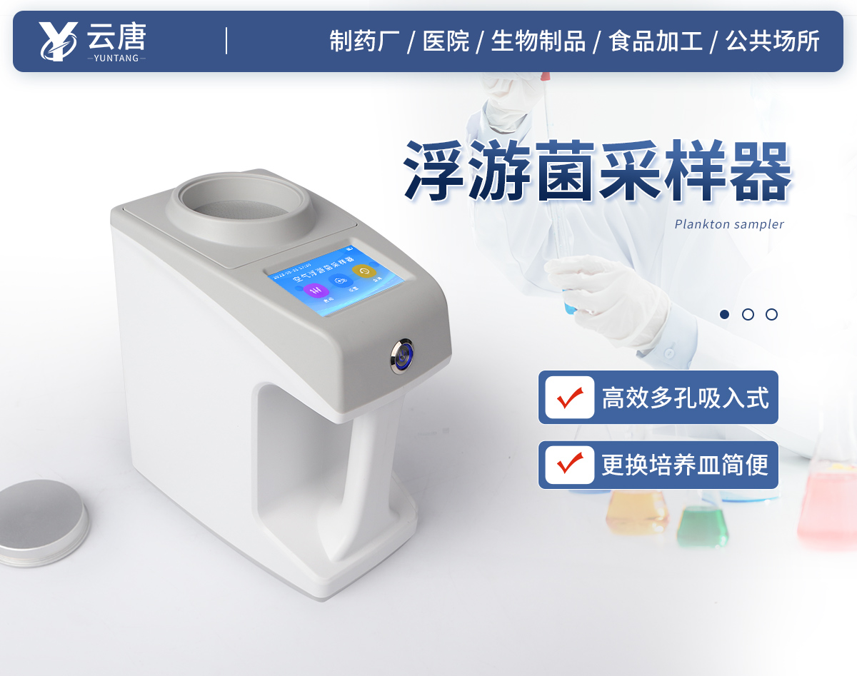 ●新型手持式外觀,美觀大方,使用方便。 ●彩色觸屏控制,操作更加**快捷。 ●LCD顯示采樣量,采樣時間等參數(shù)。 ●可將采樣量,采樣時間等參數(shù)按組儲存。 ●更換培養(yǎng)皿簡便,拿下采樣口即可更換培養(yǎng)皿。 ●帶熱敏打印機,方便打印數(shù)據(jù)。 ●帶上位機軟件,數(shù)據(jù)可導出電腦,方便歷史分析。 ●交直流兩用,內置6000mAh大容量鋰電池,可連續(xù)采樣8小時。 ●程序支持中文或英文。