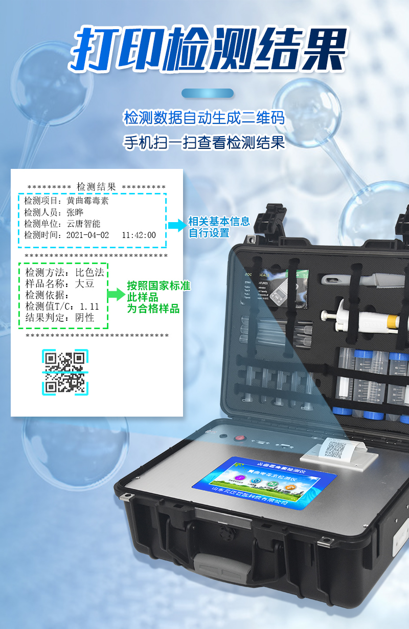 工作模式:安卓5.1系統(tǒng)模式軟件支持:安卓軟件平臺☆檢測項目:可檢測農(nóng)藥殘留、食品添加劑、色素、可現(xiàn)場快速檢測農(nóng)藥殘留、鹽酸克倫特羅、沙丁胺醇、萊克多巴胺、四環(huán)素類、硝基呋喃類、磺胺類、沙星類、氯霉素、孔雀石綠磺胺類,并且可以連接食品安全監(jiān)控系統(tǒng)。測量原理:光電池測量反射衰減信號強度;測量速度:≤5s;儲存功能:儲存至少20000個結(jié)果數(shù)據(jù),支持自定義查詢;藍(lán)牙模塊:藍(lán)牙4.2檢測精度:CV值小于1%(標(biāo)準(zhǔn)卡),批間差小于3%(標(biāo)準(zhǔn)卡);檢測輸出:支持色度檢測,CT比值檢測,T線檢測等多種擬合方式;內(nèi)置熱敏打印機☆數(shù)據(jù)輸出:內(nèi)置WIFI,支持無線數(shù)據(jù)上傳,標(biāo)準(zhǔn)RS232串口,網(wǎng)絡(luò)接口和USB2.0接口;☆內(nèi)置食品安全信息系統(tǒng),一鍵數(shù)據(jù)上傳。儀器外形尺寸:300*250*79mm☆操作系統(tǒng)配置:7吋液晶屏、4核處理器、1600萬像素凈重:2.0kg。