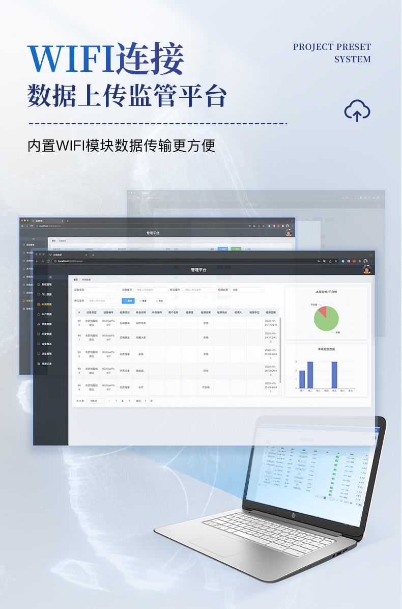 4、儀器帶有監(jiān)管平臺。數(shù)據(jù)可局域網(wǎng)和互聯(lián)網(wǎng)數(shù)據(jù)上傳,檢測結(jié)果直接傳至食品安全監(jiān)管平臺。進行區(qū)域食品安全監(jiān)管及大數(shù)據(jù)分析處理與數(shù)據(jù)統(tǒng)計,檢測區(qū)域食品安全長短期動態(tài),達到食品安全問題預估、預警。