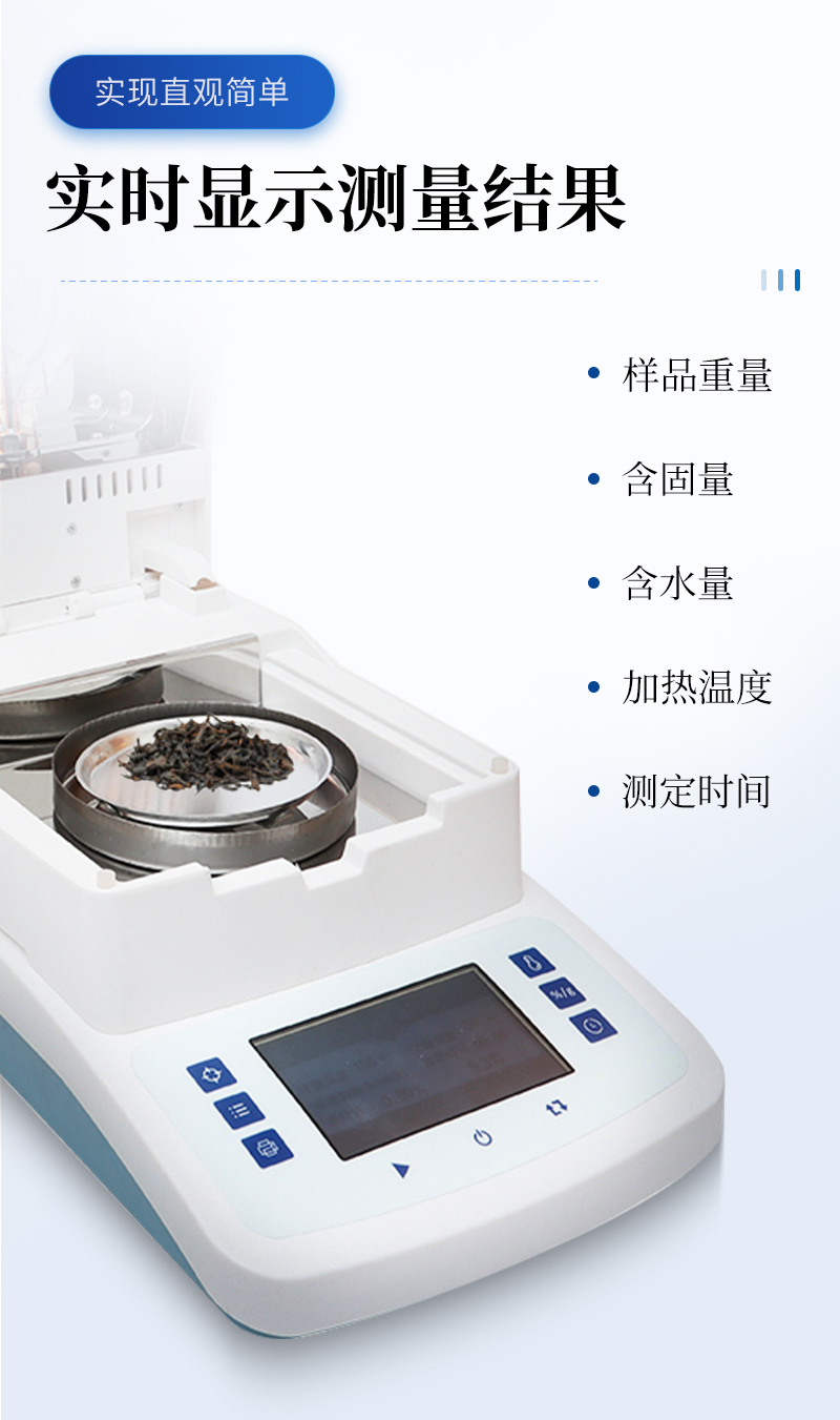 鹵素?zé)艏訜?             Halogen  light  heating不銹鋼加熱腔體          Stainless  steel  chamber溫度/時間可調(diào)           Temperature and time can be set百分比顯示水分含量      The percentage of moisture content百分比顯示干燥余量      The percentage of dry residual液晶觸摸屏              LCD  with touch scretorical  setting