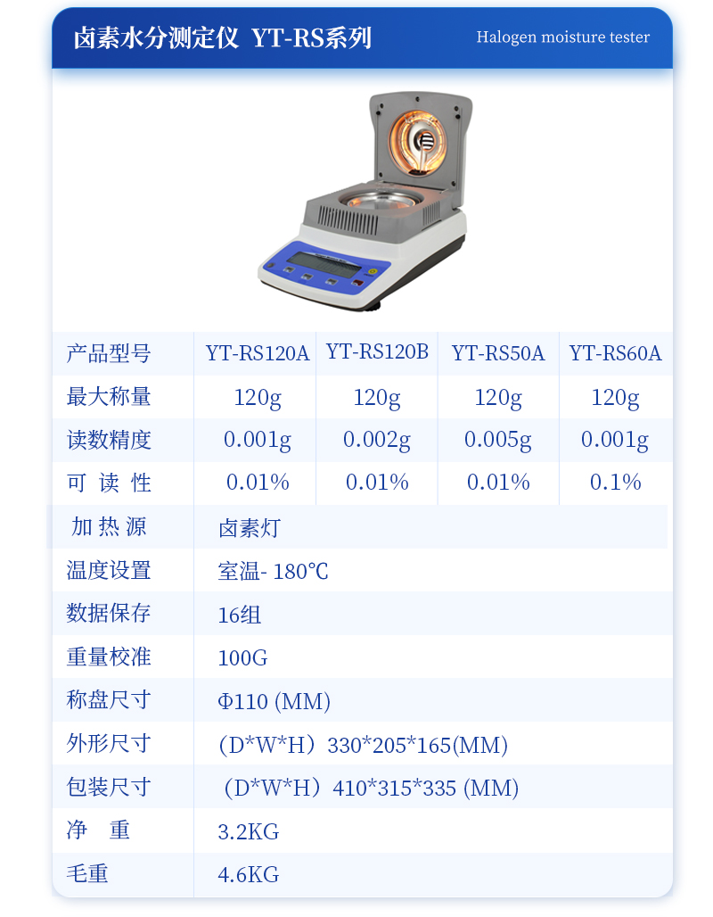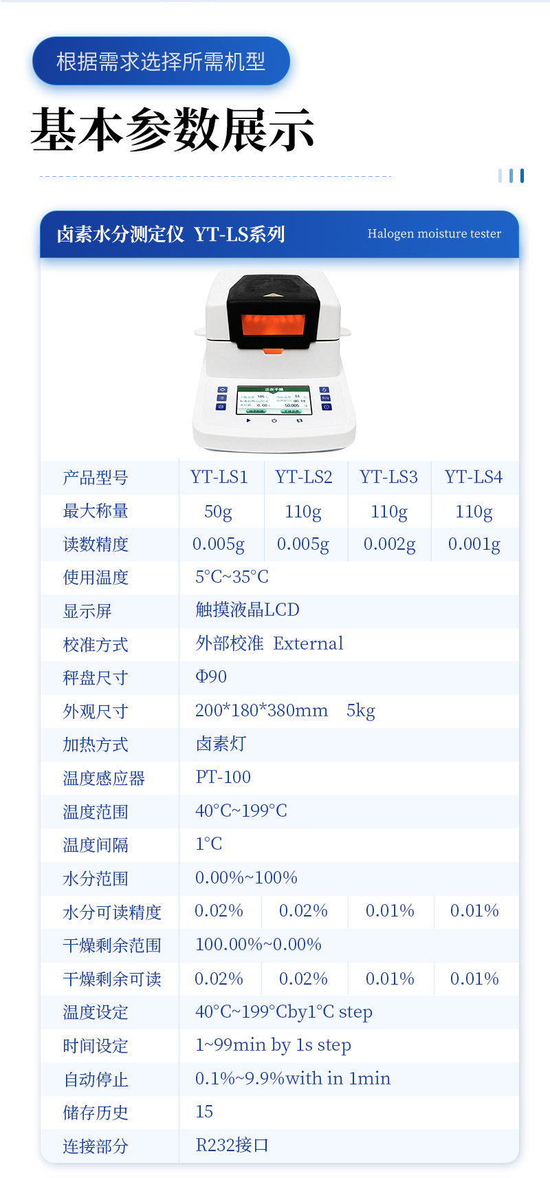 產(chǎn)品型號  Model:YT-LS1,**稱量  Range(g):50g,讀數(shù)精度  Readability(g): 0.005g,水分可讀精度  Moisturereadability:0.02%,干燥剩余可讀  Dryresidualreadability:0.02%產(chǎn)品型號  Model:YT-LS2,**稱量  Range(g):110g,讀數(shù)精度  Readability(g): 0.005g,水分可讀精度  Moisturereadability:0.02%,干燥剩余可讀  Dryresidualreadability:0.02%產(chǎn)品型號  Model:YT-LS3,**稱量  Range(g):110g,讀數(shù)精度  Readability(g): 0.002g,水分可讀精度  Moisturereadability:0.01%,干燥剩余可讀  Dryresidualreadability:0.01%產(chǎn)品型號  Model:YT-LS4,**稱量  Range(g):110g,讀數(shù)精度  Readability(g): 0.001g, 水分可讀精度  Moisturereadability :0.01%,干燥剩余可讀  Dryresidualreadability: 0.01%使用溫度  OperatingTemp.Range:5°C---35°C顯示屏  Display :觸摸液晶LCD校準(zhǔn)方式  Calibration:外部校準(zhǔn)  External秤盤尺寸  Pansize(mm): Φ90外觀尺寸  Dimensions(W*L*H) :200*180*380產(chǎn)品重量  Weight(Kg):5加熱方式  Heatsoure:鹵素?zé)? Halogenlamp溫度感應(yīng)器  Temp.sensor: PT-100溫度范圍  Temp.range:40°C---199°C溫度間隔  Temp.step:1°C水分范圍  Moisturerange :0.00%---100%干燥剩余范圍  Dryresidualrange:100.00%---0.00%ATRO:100%---999%ATRO:0%---999%溫度設(shè)定  Temperaturesetting:40°C---199°Cby1°Cstep時間設(shè)定  Timesetting:1---99min by 1s step自動停止  Autostop :0.1%---9.9%within 1min儲存歷史  Nuberofstorage:15加熱部分  Heater:220V+15% 50Hz115V+15%  400W連接部分:R232接口天平部分  Balance: External power supply  Output:9V   Lnput:220V+15%50Hz