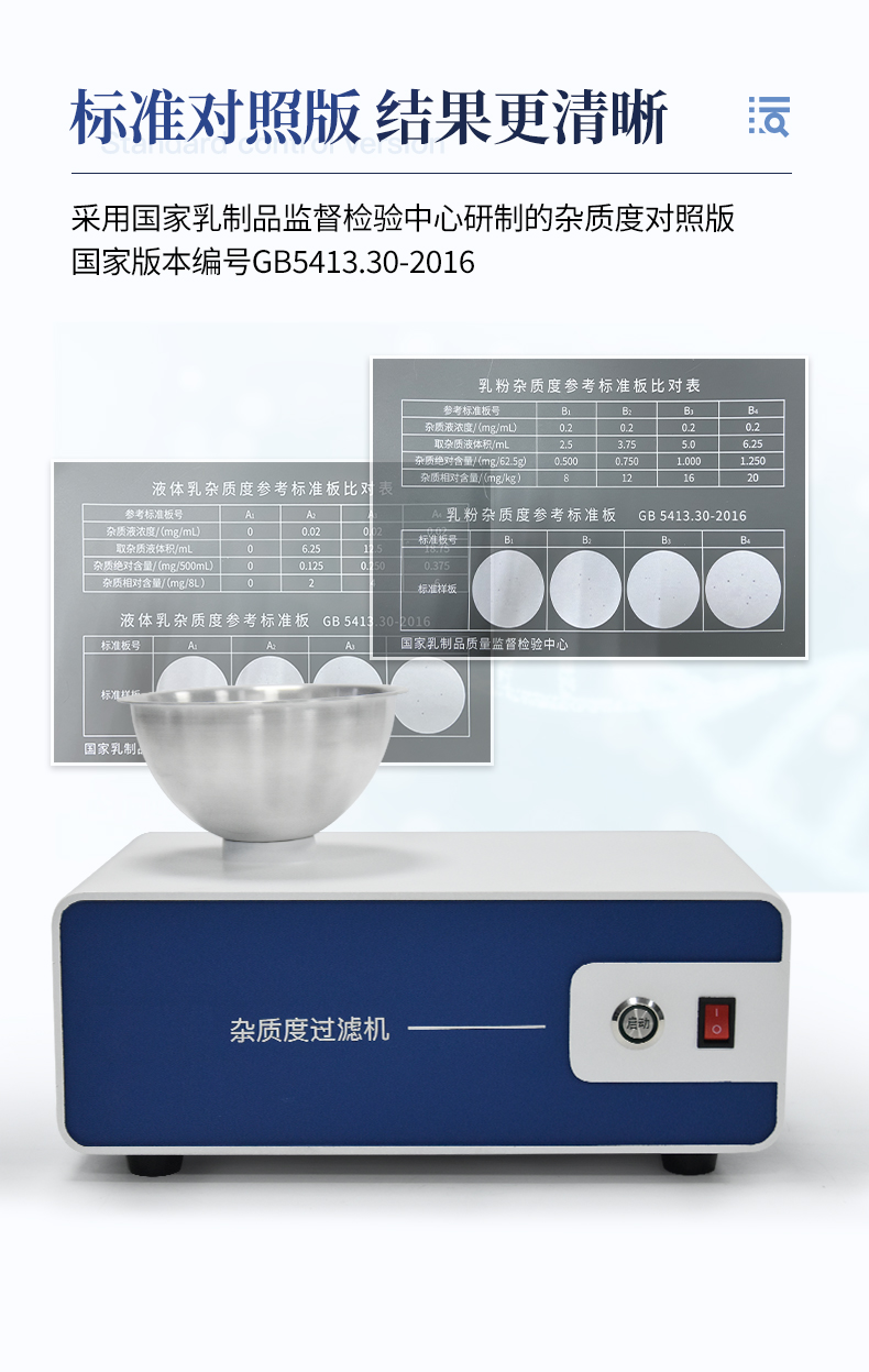 | 用途:用于乳及乳制品中雜質(zhì)度的測定。 | 標準依據(jù):符合國家標準 GB/T5413.1—5413.32,特別是 GB5413.30-2016 的要求。 |