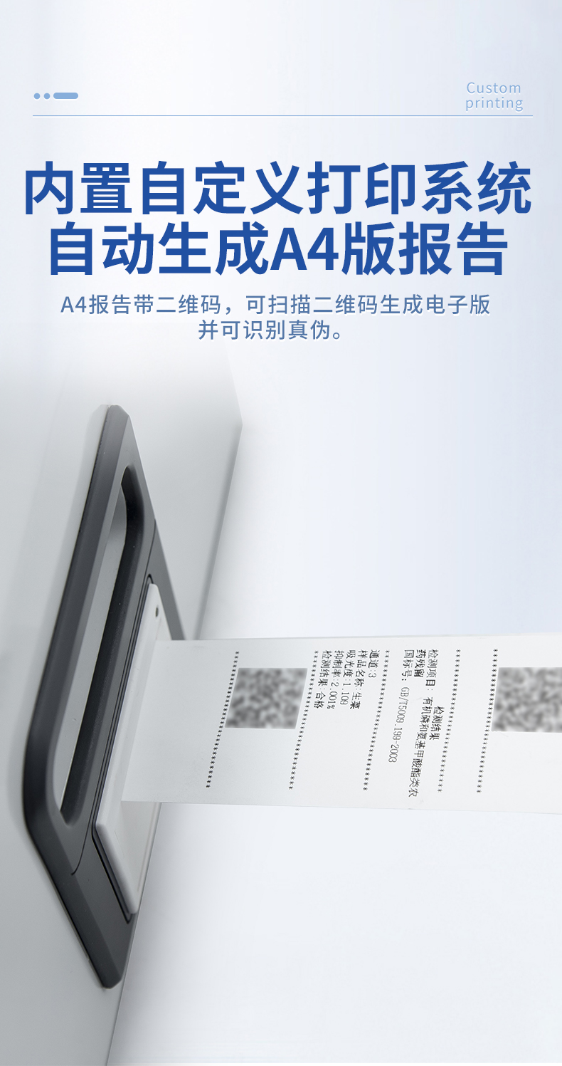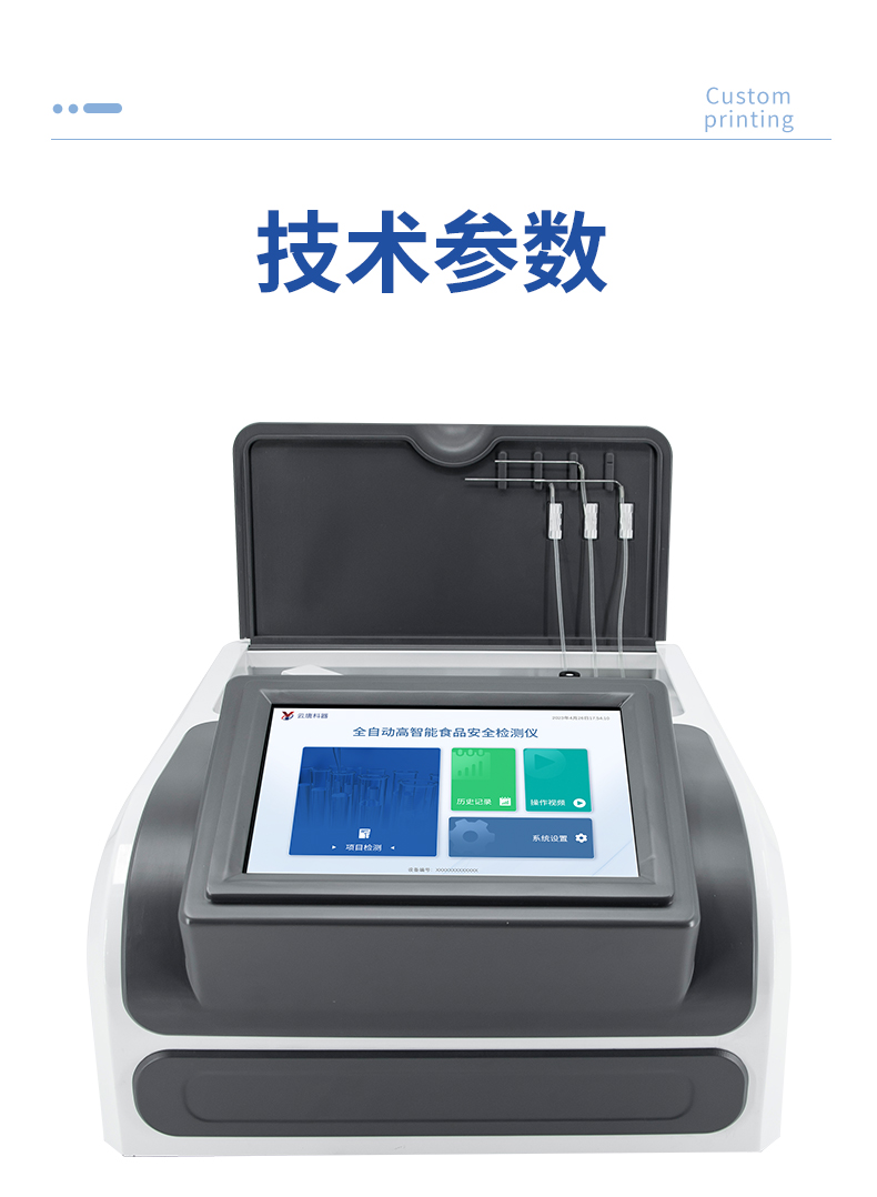 1. 試劑位置:3個(gè)2. 檢測(cè)形式:旋轉(zhuǎn)48通道比色盤,可任意選擇檢測(cè)通道,自動(dòng)對(duì)應(yīng)選擇通道。3. 系統(tǒng)配置:10.1寸高清液晶觸摸屏,采用ARM Cortex-A7,RK3288/4核處理器,運(yùn)行內(nèi)存1GB。Android7.1.1 系統(tǒng)分辨率1280×800。4.恒溫系統(tǒng):具有自動(dòng)加溫溫控系統(tǒng),精準(zhǔn)恒溫37℃,精度±0.1℃。5.添加系統(tǒng):儀器按照試劑要求自動(dòng)、按時(shí)、按量加入試劑,并且自動(dòng)對(duì)未正常放置的樣本或異常的樣本進(jìn)行檢查并提示。 6.清洗功能:儀器具備回流及自動(dòng)清洗管路功能,避免試劑污染。7.混勻功能:設(shè)備具備自動(dòng)混勻功能。8.光源校準(zhǔn):設(shè)備可自動(dòng)校準(zhǔn),確保檢測(cè)準(zhǔn)確度。9.實(shí)時(shí)監(jiān)控:儀器測(cè)試過程中屏幕顯示運(yùn)行狀態(tài),可實(shí)時(shí)查看。10.數(shù)據(jù)存儲(chǔ):內(nèi)部存儲(chǔ)16GB,可存儲(chǔ)500萬條數(shù)據(jù)。11.樣品多選功能:設(shè)備具備樣品一鍵多選功能,選擇樣品自動(dòng)匹配檢測(cè)通道。12.項(xiàng)目預(yù)設(shè):可提前設(shè)置單個(gè)及多個(gè)相同或不相同的檢測(cè)任務(wù),可單次或者多次調(diào)取,減少檢測(cè)時(shí)間。13.自定義打印系統(tǒng):內(nèi)置自定義打印系統(tǒng),可按需靈活設(shè)置開啟或關(guān)閉:產(chǎn)品合格證(國(guó)家農(nóng)業(yè)部標(biāo)準(zhǔn)),二維碼,抽樣信息、檢測(cè)信息,受檢信息等信息的打印。14.A4版本報(bào)告打印功能:設(shè)備可自動(dòng)生成A4版報(bào)告,A4報(bào)告帶二維碼,可掃描二維碼生成電子版,并可識(shí)別真?zhèn)巍?/td>15.傳輸方式:儀器配備無線通信模塊: 4G(APN)通訊模塊、Wifi模塊,藍(lán)牙傳輸模塊,同時(shí)具有USB接口以及RJ45接口能以多種方式實(shí)現(xiàn)數(shù)據(jù)保存和數(shù)據(jù)傳輸功能,設(shè)備數(shù)據(jù)可以同步上傳至平臺(tái)。16.數(shù)據(jù)監(jiān)管系統(tǒng):設(shè)備自帶監(jiān)管平臺(tái),并可同步對(duì)接監(jiān)管平臺(tái),數(shù)據(jù)可局域網(wǎng)和互聯(lián)網(wǎng)數(shù)據(jù)上傳,檢測(cè)結(jié)果可直接傳至食品安全監(jiān)管平臺(tái)。達(dá)到食品安全問題預(yù)估、預(yù)警。17.系統(tǒng)遠(yuǎn)程更新功能:無需設(shè)備返廠,即可遠(yuǎn)程實(shí)時(shí)升級(jí)全新系統(tǒng),節(jié)省時(shí)間成本及避免運(yùn)輸造成設(shè)備損。