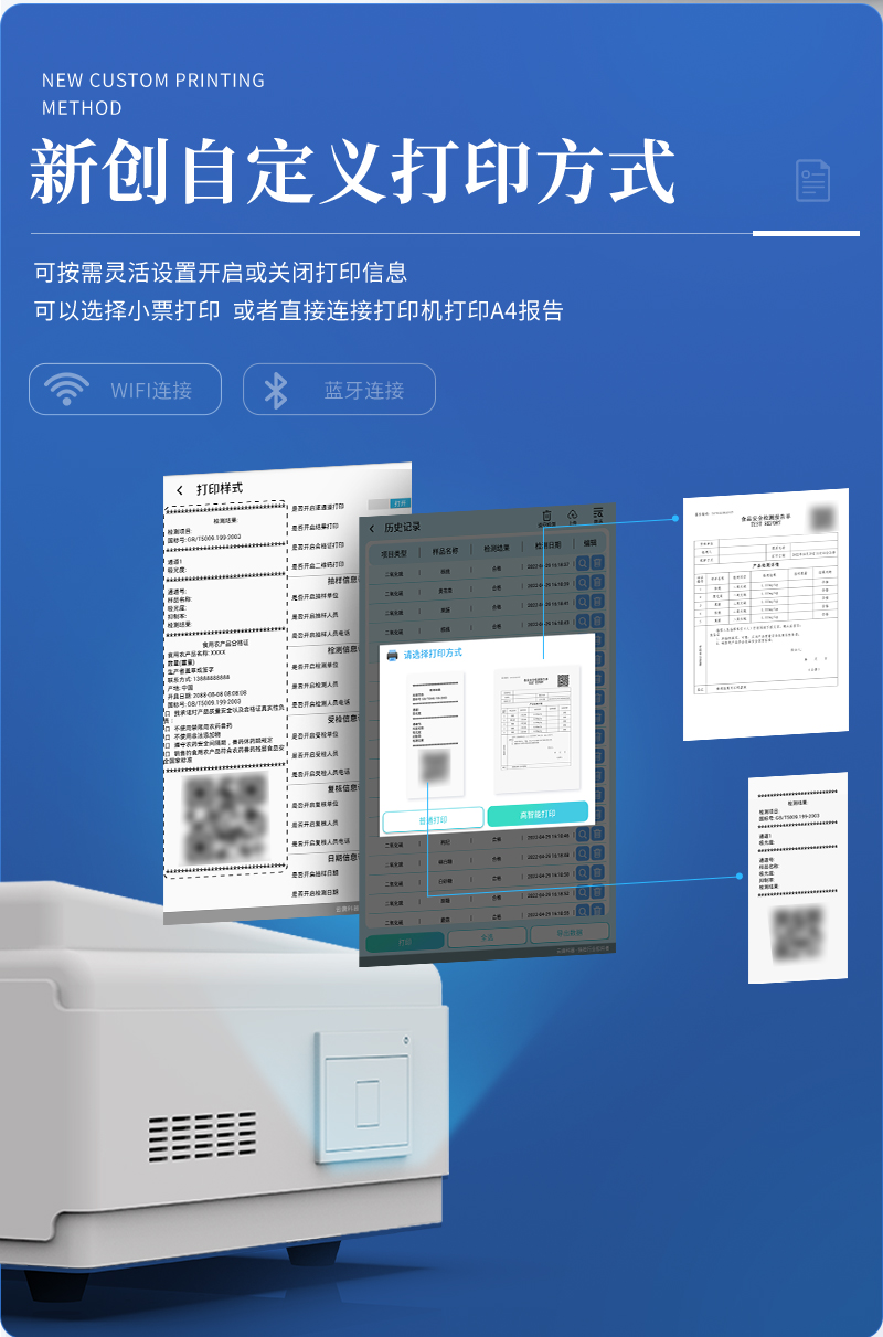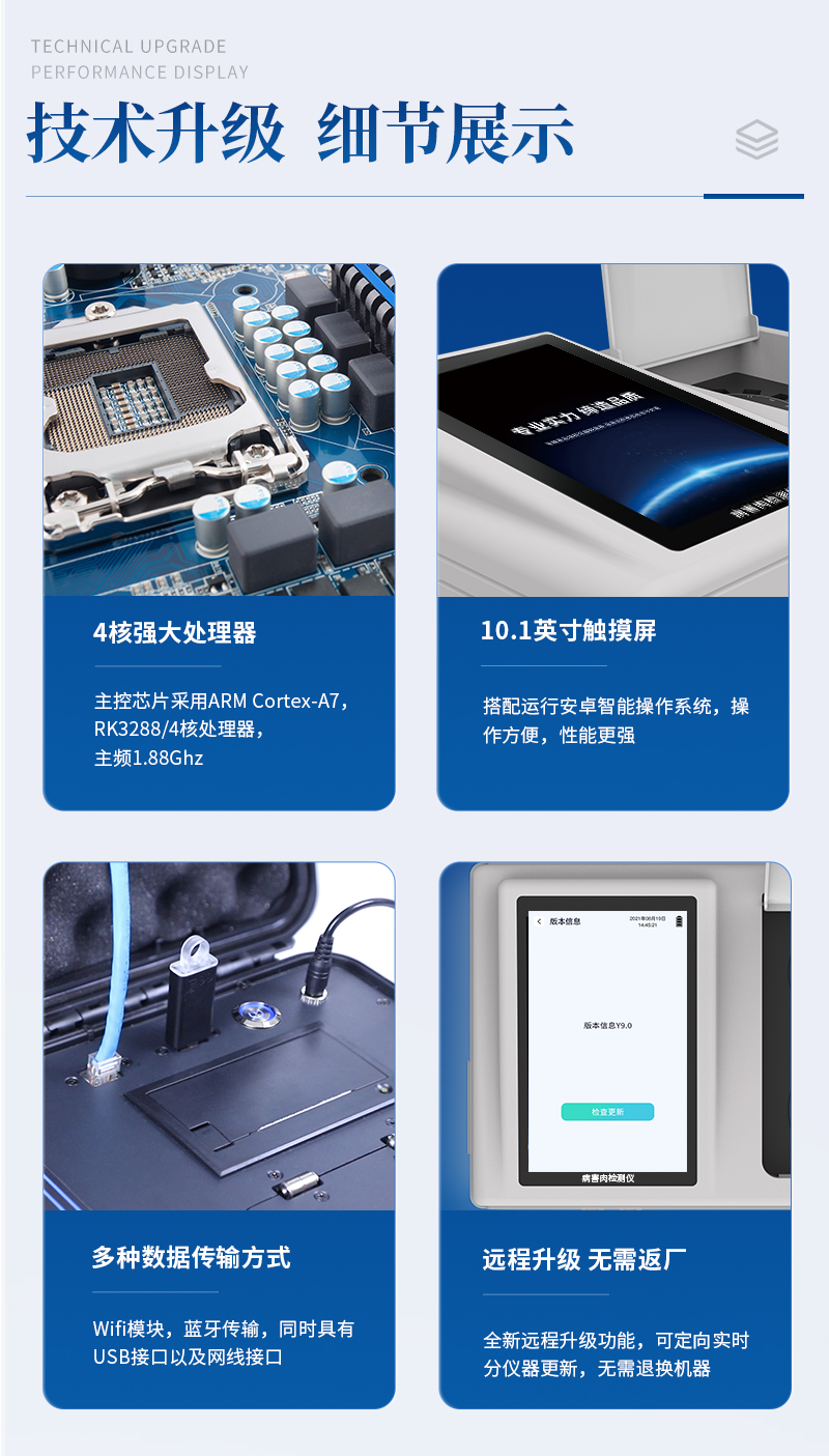 | 儀器采用臺(tái)式一體化系統(tǒng)檢測技術(shù),將分光光度模塊、數(shù)字化管理模塊、無線通訊模塊高度集成于一體,可支持檢測60種食品安全檢測項(xiàng)目,同時(shí)預(yù)留升級(jí)檢測方法。 | 儀器檢測模塊標(biāo)準(zhǔn)化、智能化,檢測項(xiàng)目可隨意自由組合。檢測箱體內(nèi)置多個(gè)標(biāo)準(zhǔn)檢測單元,檢測模塊可以調(diào)整配置。 | 顯示屏幕:儀器采用10.1英寸豎向液晶觸摸屏顯,搭配運(yùn)行安卓智能操作系統(tǒng),主控芯片采用ARM Cortex-A7,RK3288/4核處理器,主頻1.88Ghz,操作方便,性能更強(qiáng)。 | 檢測通道:≥12通道;采用精密旋轉(zhuǎn)比色池設(shè)計(jì),使用同芯片同光源校準(zhǔn)精度,解決不同光源之間的誤差值,更加準(zhǔn)確**。(1-12通道間誤差0.1%,***:**202022821055.2) | 儀器光源:高精度進(jìn)口四波長冷光源,每個(gè)通道均配置 410、520、590、630nm 波長光源,標(biāo)配**的光路切換裝置,專利光路切換功能可實(shí)現(xiàn)64波長,并且所有檢測項(xiàng)目可實(shí)現(xiàn)所有通道同時(shí)檢測。 | 設(shè)備可一鍵校準(zhǔn),自動(dòng)保存校準(zhǔn)數(shù)據(jù),自動(dòng)對(duì)比校驗(yàn),得到精準(zhǔn)光源,采用Android SP存儲(chǔ)數(shù)據(jù),光源數(shù)據(jù)永不丟失,方便每一次使用。 | 通訊接口:配備無線通信模塊、4G(APN)通訊模塊、藍(lán)牙傳輸,同時(shí)具有雙USB接口以及RJ45網(wǎng)線接口,可以多方式實(shí)現(xiàn)數(shù)據(jù)保存及數(shù)據(jù)傳輸。 | 存儲(chǔ)方式:支持U盤存儲(chǔ),標(biāo)準(zhǔn)USB接口,免驅(qū)動(dòng)安裝。檢測結(jié)果存儲(chǔ)容量20萬條以上,可生成Excel表格進(jìn)行拷貝,并具有登錄保護(hù)功能。 | 智能化操作系統(tǒng): | 1、操作系統(tǒng):儀器可在同一檢測界面自動(dòng)對(duì)應(yīng)相關(guān)檢測通道,一次性選擇1-12個(gè)樣品名稱,無需退出界面,節(jié)省操作時(shí)間。并可以對(duì)每個(gè)通道屬性和樣品信息單獨(dú)進(jìn)行編輯,例如送檢單位、人員,檢測人員等,打印時(shí)勾選打印顯示。 | 2、數(shù)據(jù)集成系統(tǒng):設(shè)備首頁自動(dòng)匯總分析檢測數(shù)據(jù),包含:周檢測數(shù)據(jù)、月檢測數(shù)據(jù),全部檢測總數(shù)量,均包含檢測總數(shù),合格數(shù),不合格數(shù),以及相關(guān)柱形分析圖,各項(xiàng)檢測數(shù)據(jù)一目了然,無需電腦查詢,更加快捷直觀。 | 3、數(shù)據(jù)庫系統(tǒng):十幾項(xiàng)數(shù)據(jù)庫分類管理儀器:包含項(xiàng)目類型、項(xiàng)目數(shù)據(jù)、檢測數(shù)據(jù)、歷史記錄、國標(biāo)信息、曲線信息、采樣信息、檢測信息、受檢信息、復(fù)核信息、圖表信息、光源校準(zhǔn)信息、打印樣式信息、樣品庫信息等等,數(shù)據(jù)庫之間互相協(xié)調(diào)聯(lián)動(dòng)保證數(shù)據(jù)的真實(shí)完整性。同時(shí)產(chǎn)品數(shù)據(jù)庫以及歷史檢測記錄支持一鍵檢索功能。 | 4、限量規(guī)判系統(tǒng):具有限量查詢、添加物質(zhì)合規(guī)判定系統(tǒng)。檢測出結(jié)果后,系統(tǒng)自動(dòng)調(diào)用系統(tǒng)數(shù)據(jù)庫中相關(guān)國標(biāo)進(jìn)行比對(duì)判定,客觀顯示判定結(jié)果是否合格。 | 5、項(xiàng)目預(yù)設(shè)系統(tǒng):儀器具有任務(wù)預(yù)設(shè)模塊,一鍵提前預(yù)設(shè),給出方便快捷的新檢測方案,每一個(gè)任務(wù)分別可以設(shè)置不同的樣品、批次、編號(hào)、來源、備注、抽樣信息、檢測信息、受檢信息、復(fù)核信息等更多信息。樣品送檢時(shí)一鍵調(diào)取保存信息,并可多次調(diào)取,大大提高檢測效率。 | 6、數(shù)據(jù)監(jiān)管系統(tǒng):同步對(duì)接監(jiān)管平臺(tái),數(shù)據(jù)可局域網(wǎng)和互聯(lián)網(wǎng)數(shù)據(jù)上傳,檢測結(jié)果可選擇直接傳至食品安全監(jiān)管平臺(tái)。進(jìn)行區(qū)域食品安全監(jiān)管及大數(shù)據(jù)分析處理與數(shù)據(jù)統(tǒng)計(jì),檢測區(qū)域食品安全長短期動(dòng)態(tài),達(dá)到食品安全問題預(yù)估、預(yù)警。 | 7.1、全新打印系統(tǒng):內(nèi)置全新打印機(jī),新創(chuàng)自定義打印方式,可按需靈活勾選控制:二維碼,抽樣信息、檢測信息,受檢信息、復(fù)核信息、抽樣日期、檢測日期等信息的打印。 | 7.2、A4紙版本報(bào)告打印功能(可選配):設(shè)備擁有兩種結(jié)果展示方式,可以自動(dòng)生成A4打印模板和小票打印模板兩種樣式,可通過WiFi及網(wǎng)線等方式鏈接外置打印機(jī)可進(jìn)行打印。 | 供電模式:儀器交直流兩用,直流12V供電,可連接車載電源,可配6ah大容量充電鋰電池,電量可實(shí)時(shí)顯示,方便戶外流動(dòng)測試。 | 儀器具備遠(yuǎn)程升級(jí)功能,可定向分客戶分儀器更新,開機(jī)后自動(dòng)更新,并可持續(xù)性免費(fèi)更新系統(tǒng)版本,無需像傳統(tǒng)產(chǎn)品返廠更新,節(jié)省時(shí)間及人力成本并避免了物流運(yùn)輸返廠升級(jí)導(dǎo)致設(shè)備損壞的潛在風(fēng)險(xiǎn)。 |