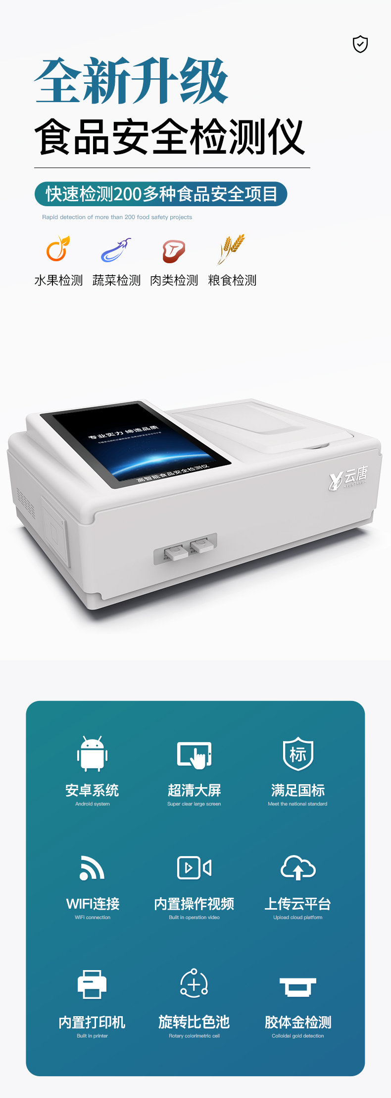 | 1、儀器采用臺式一體化系統(tǒng)檢測技術(shù),將分光光度模塊、膠體金檢測模塊、新型農(nóng)殘檢測模塊、數(shù)字化管理模塊、無線通訊模塊高度集成于一體,支持檢測200種食品安全檢測項目,同時預(yù)留升級檢測方法。 | 2、儀器檢測模塊標(biāo)準(zhǔn)化、智能化,檢測項目可隨意自由組合。檢測箱體內(nèi)置多個標(biāo)準(zhǔn)檢測單元,檢測模塊可以調(diào)整配置。 | 3、顯示屏幕:儀器采用10.1英寸豎向液晶觸摸屏顯,搭配運行安卓智能操作系統(tǒng),主控芯片采用ARM Cortex-A7,RK3288/4核處理器,主頻1.88Ghz,操作方便,性能更強。 | 4、檢測通道:≥12通道;采用精密旋轉(zhuǎn)比色池設(shè)計,使用同芯片同光源校準(zhǔn)精度,解決不同光源之間的誤差值,更加準(zhǔn)確**。(1-12通道間誤差0.1%,***:**202022821055.2) | 5、儀器光源:高精度進口四波長冷光源,每個通道均配置 410、520、590、630nm 波長光源,標(biāo)配**的光路切換裝置,專利光路切換功能可實現(xiàn)64波長,并且所有檢測項目可實現(xiàn)所有通道同時檢測。 | 6、設(shè)備可一鍵校準(zhǔn),自動保存校準(zhǔn)數(shù)據(jù),自動對比校驗,得到精準(zhǔn)光源,采用Android SP存儲數(shù)據(jù),光源數(shù)據(jù)永不丟失,方便每一次使用。 | 7、通訊接口:配備無線通信模塊、4G(APN)通訊模塊、藍牙傳輸,同時具有雙USB接口以及RJ45網(wǎng)線接口,可以多方式實現(xiàn)數(shù)據(jù)保存及數(shù)據(jù)傳輸。 | 8、存儲方式:支持U盤存儲,標(biāo)準(zhǔn)USB接口,免驅(qū)動安裝。檢測結(jié)果存儲容量20萬條以上,可生成Excel表格進行拷貝,并具有登錄保護功能。 | 9、智能化操作系統(tǒng): | 9.1、操作系統(tǒng):儀器可在同一檢測界面自動對應(yīng)相關(guān)檢測通道,一次性選擇1-12個樣品名稱,無需退出界面,節(jié)省操作時間。并可以對每個通道屬性和樣品信息單獨進行編輯,例如送檢單位、人員,檢測人員等,打印時勾選打印顯示。 | 9.2、數(shù)據(jù)集成系統(tǒng):設(shè)備首頁自動匯總分析檢測數(shù)據(jù),包含:周檢測數(shù)據(jù)、月檢測數(shù)據(jù),全部檢測總數(shù)量,均包含檢測總數(shù),合格數(shù),不合格數(shù),以及相關(guān)柱形分析圖,各項檢測數(shù)據(jù)一目了然,無需電腦查詢,更加快捷直觀。 | 9.3、數(shù)據(jù)庫系統(tǒng):十幾項數(shù)據(jù)庫分類管理儀器:包含項目類型、項目數(shù)據(jù)、檢測數(shù)據(jù)、歷史記錄、國標(biāo)信息、曲線信息、采樣信息、檢測信息、受檢信息、復(fù)核信息、圖表信息、光源校準(zhǔn)信息、打印樣式信息、樣品庫信息等等,數(shù)據(jù)庫之間互相協(xié)調(diào)聯(lián)動保證數(shù)據(jù)的真實完整性。同時產(chǎn)品數(shù)據(jù)庫以及歷史檢測記錄支持一鍵檢索功能。 | 9.4、限量規(guī)判系統(tǒng):具有限量查詢、添加物質(zhì)合規(guī)判定系統(tǒng)。檢測出結(jié)果后,系統(tǒng)自動調(diào)用系統(tǒng)數(shù)據(jù)庫中相關(guān)國標(biāo)進行比對判定,客觀顯示判定結(jié)果是否合格。 | 9.5、項目預(yù)設(shè)系統(tǒng):儀器具有任務(wù)預(yù)設(shè)模塊,一鍵提前預(yù)設(shè),給出方便快捷的新檢測方案,每一個任務(wù)分別可以設(shè)置不同的樣品、批次、編號、來源、備注、抽樣信息、檢測信息、受檢信息、復(fù)核信息等更多信息。樣品送檢時一鍵調(diào)取保存信息,并可多次調(diào)取,大大提高檢測效率。 | 9.6、數(shù)據(jù)監(jiān)管系統(tǒng):同步對接監(jiān)管平臺,數(shù)據(jù)可局域網(wǎng)和互聯(lián)網(wǎng)數(shù)據(jù)上傳,檢測結(jié)果可選擇直接傳至食品安全監(jiān)管平臺。進行區(qū)域食品安全監(jiān)管及大數(shù)據(jù)分析處理與數(shù)據(jù)統(tǒng)計,檢測區(qū)域食品安全長短期動態(tài),達到食品安全問題預(yù)估、預(yù)警。 | 9.7.1、全新打印系統(tǒng):內(nèi)置全新打印機,新創(chuàng)自定義打印方式,可按需靈活勾選控制:產(chǎn)品合格證(國家農(nóng)業(yè)部標(biāo)準(zhǔn)要求),二維碼,抽樣信息、檢測信息,受檢信息、復(fù)核信息、抽樣日期、檢測日期等信息的打印。 | 9.7.2、A4紙版本報告打印功能(選配):設(shè)備擁有兩種結(jié)果展示方式,可以自動生成A4打印模板和小票打印模板兩種樣式,可通過WiFi及網(wǎng)線等方式鏈接外置打印機可進行打印。 | 10、供電模式:儀器交直流兩用,直流12V供電,可連接車載電源,可配6ah大容量充電鋰電池,電量可實時顯示,方便戶外流動測試。 | 11、膠體金檢測模塊:采用單通道CMOS成像處理技術(shù)及膠體金免疫層析技術(shù),可讀取膠體金卡數(shù)據(jù),自動采集、處理分析,將檢測結(jié)果顯示,并可根據(jù)參考限值自動判斷檢測結(jié)果,可檢測常見的獸藥殘留、生物毒素、抗生素、違禁添加物等。 | 11.1、探測技術(shù):CMOS成像探測; | 11.2、檢測通道:1個通道; | 11.3、檢測方式:消線法和比色法; | 11.4、顯示模式:陰性或陽性; | 11.5、曲線形式:直插式掃描方式,顯示金標(biāo)卡圖像,實時生成、識別CT曲線圖,無需手動調(diào)整,完成檢測后自動退出檢測卡。兼容市場上其他金標(biāo)卡,使用耗材不受限制。 | 12、儀器具備遠程升級功能,可定向分客戶分儀器更新,開機后自動更新,并可持續(xù)性免費更新系統(tǒng)版本,無需像傳統(tǒng)產(chǎn)