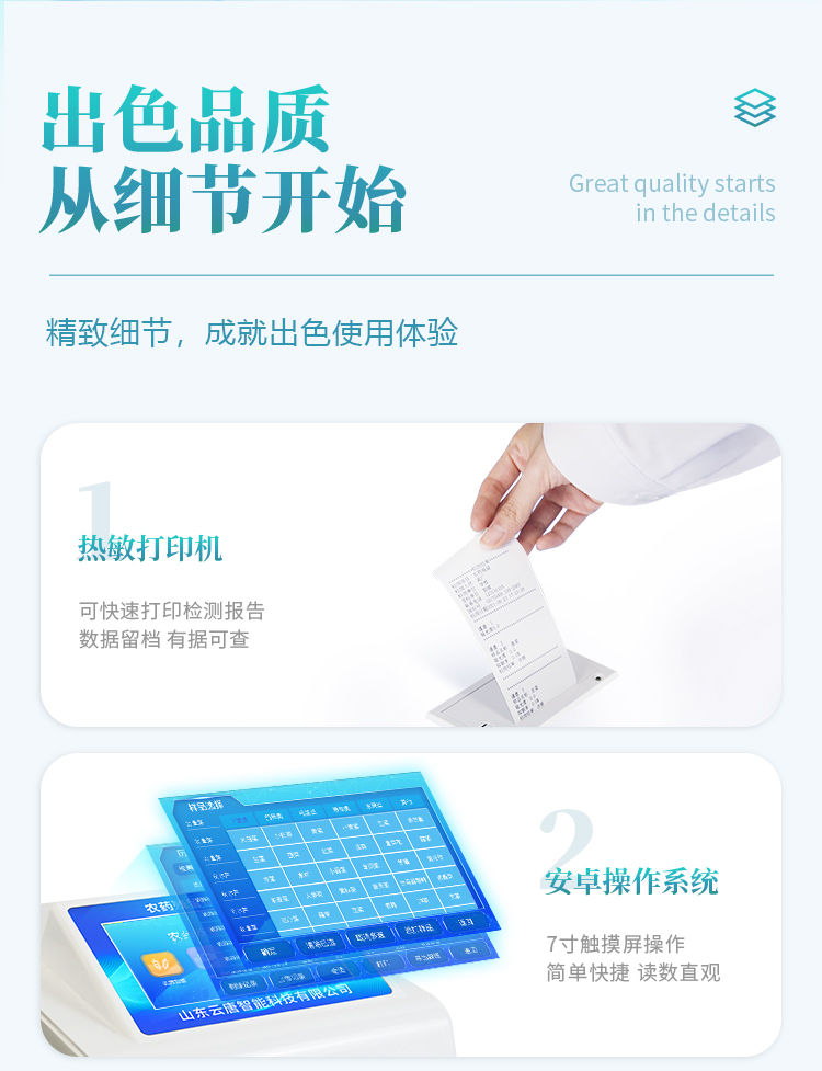 安卓智能操作系統(tǒng),采用更加**和人性化操作,儀器具有無(wú)線聯(lián)網(wǎng)上傳功能,快速上傳數(shù)據(jù),進(jìn)行數(shù)據(jù)統(tǒng)計(jì)和分析。智能化程度高,儀器具有自檢功能:具有開(kāi)機(jī)自檢和調(diào)零功能,具有自動(dòng)檢測(cè)重復(fù)性功能;同時(shí),檢測(cè)完成可自動(dòng)打印檢測(cè)報(bào)告和二維碼。手機(jī)掃碼可顯示出詳細(xì)檢測(cè)信息。儀器帶有監(jiān)管平臺(tái),數(shù)據(jù)可局域網(wǎng)和互聯(lián)網(wǎng)數(shù)據(jù)上傳,檢測(cè)結(jié)果直接傳至食品安全監(jiān)管平臺(tái)。進(jìn)行區(qū)域食品安全監(jiān)管及大數(shù)據(jù)分析處理與數(shù)據(jù)統(tǒng)計(jì),檢測(cè)區(qū)域食品安全長(zhǎng)短期動(dòng)態(tài),達(dá)到食品安全問(wèn)題預(yù)估、預(yù)警 。樣品處理簡(jiǎn)單省力,整體操作快速、安全、便捷。儀器具有自身保護(hù)功能,可設(shè)置用戶名及密碼,防止非工作人員操作等。內(nèi)置強(qiáng)大的數(shù)據(jù)庫(kù),可在儀器上直接選擇樣品名稱(chēng)、檢測(cè)指標(biāo)、送檢單位等信息,也可在儀器上直接編輯錄入樣品名稱(chēng)、檢測(cè)指標(biāo)、送檢單位等信息并保存進(jìn)樣品數(shù)據(jù)庫(kù),方便后期操作調(diào)取使用。儀器具有重新校準(zhǔn)、鎖定、恢復(fù)出廠設(shè)置功能。