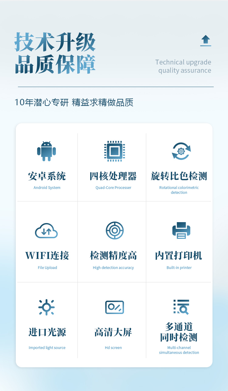 安卓智能操作系統(tǒng),采用更加**和人性化操作,儀器具有無線聯(lián)網(wǎng)上傳功能,快速上傳數(shù)據(jù),進行數(shù)據(jù)統(tǒng)計和分析。智能化程度高,儀器具有自檢功能:具有開機自檢和調(diào)零功能,具有自動檢測重復性功能;同時,檢測完成可自動打印檢測報告和二維碼。手機掃碼可顯示出詳細檢測信息。儀器帶有監(jiān)管平臺,數(shù)據(jù)可局域網(wǎng)和互聯(lián)網(wǎng)數(shù)據(jù)上傳,檢測結(jié)果直接傳至食品安全監(jiān)管平臺。進行區(qū)域食品安全監(jiān)管及大數(shù)據(jù)分析處理與數(shù)據(jù)統(tǒng)計,檢測區(qū)域食品安全長短期動態(tài),達到食品安全問題預估、預警 。樣品處理簡單省力,整體操作快速、安全、便捷。儀器具有自身保護功能,可設(shè)置用戶名及密碼,防止非工作人員操作等。內(nèi)置強大的數(shù)據(jù)庫,可在儀器上直接選擇樣品名稱、檢測指標、送檢單位等信息,也可在儀器上直接編輯錄入樣品名稱、檢測指標、送檢單位等信息并保存進樣品數(shù)據(jù)庫,方便后期操作調(diào)取使用。儀器具有重新校準、鎖定、恢復出廠設(shè)置功能。