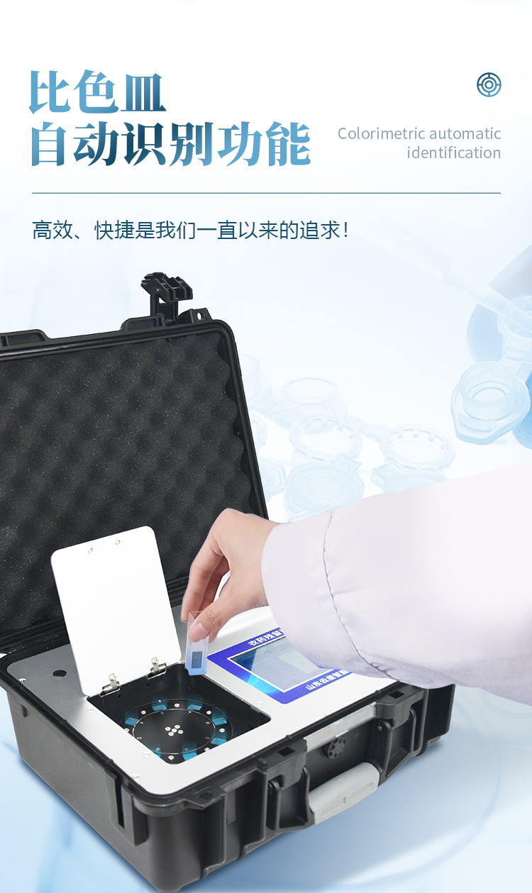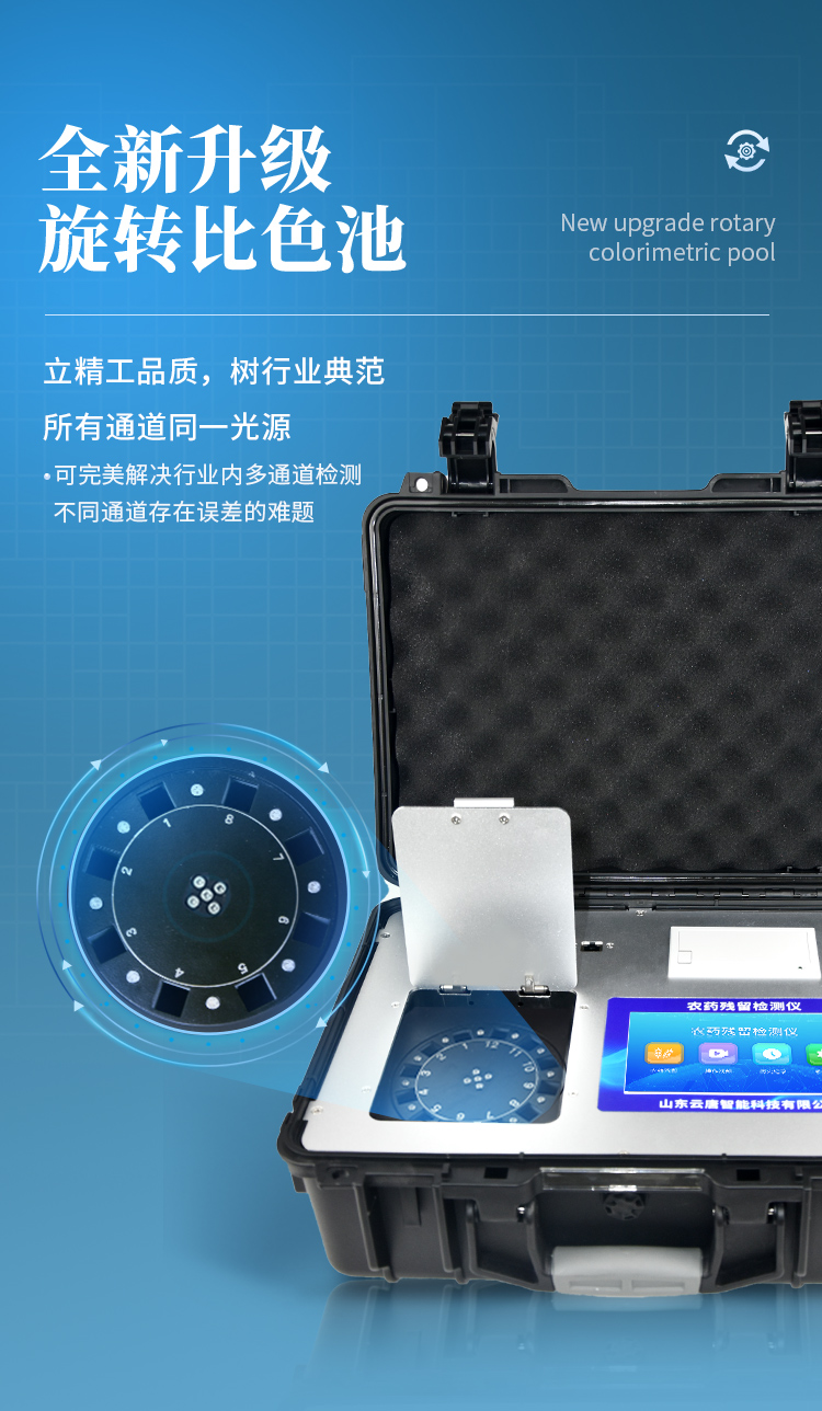 | 機器采用全新安卓智能系統(tǒng),主控芯片采用 ARM Cortex-A7,RK3288/4核處理器,主頻1.88Ghz,運轉(zhuǎn)速度更快速,穩(wěn)定性更強。 | 創(chuàng)新檢測模式: *儀器采用精密旋轉(zhuǎn)比色池設(shè)計,使用光源一致,可以解決各通道間由于光源誤差帶來的檢測結(jié)果誤差問題,檢測結(jié)果更加精準(zhǔn)。 *儀器具有自動識別比色皿檢測功能,即:將樣品比色皿放入儀器后,點擊樣品檢測,儀器自動識別比色皿進(jìn)行通道檢測。 | 供電方式:交直流兩用,直流 12V 供電,可連接車載電源,可配 6ah 大容量充電鋰電池,方便戶外流動測試。 | 顯示方式:7英寸液晶觸摸屏顯示,人性化中文操作界面,讀數(shù)直觀、簡單。 | 檢測通道:12個檢測通道,可以同時測試多個樣品,循環(huán)檢測,即放即檢,每個樣品由程序控制分別獨立工作,不會互相干擾。 | 高精光源系統(tǒng): ①儀器光源采用進(jìn)口超高亮發(fā)光二極管,光源亮度可以自動調(diào)節(jié)與校準(zhǔn) ②智能恒流穩(wěn)壓,光強自動校準(zhǔn),長時間連續(xù)工作光源無溫漂現(xiàn)象。 | 智能操作分析系統(tǒng): ①儀器具有100多種蔬菜名稱菜單庫,分類管理,并可按需添加或刪除、編輯蔬菜名稱;可在同一檢測界面自動對應(yīng)相關(guān)檢測通道一次性選擇1-24個樣品名稱,無需退出界面,節(jié)省操作時間。 ②內(nèi)置新國家限量標(biāo)準(zhǔn),與所測結(jié)果進(jìn)行現(xiàn)場比對,并持續(xù)更新標(biāo)準(zhǔn)。 | 完善的配套硬件: ①采用串口5v打印機,可選擇手動打印或者自動打印,三分鐘出打印結(jié)果,打印格式為檢測人姓名、吸光度差值、檢測時間、檢測機構(gòu)、樣品名稱及結(jié)果判定。 ②儀器具有無線上傳模塊,檢測結(jié)果可批量打印,批量上傳。 | 數(shù)據(jù)調(diào)用: ①儀器可存儲20萬條檢測結(jié)果, ②檢測結(jié)果為Excel表格,方便后期進(jìn)行數(shù)據(jù)分析與匯總報告 ③儀器采用USB2.0接口設(shè)計,支持 U 盤存儲,方便數(shù)據(jù)的存貯和移動,并可隨時與計算機直接相連,實現(xiàn)數(shù)據(jù)查詢、瀏覽、分析、統(tǒng)計、打印等。 | 后期產(chǎn)品固件可升級。 | 安全證書,放心保障:儀器具有中國計量科學(xué)研究院校準(zhǔn)證書,權(quán)威認(rèn)證,使用放心。 | 機箱采用工業(yè)級ABS工程塑料箱,方便攜帶,穩(wěn)固耐用,便于流動測試。 |