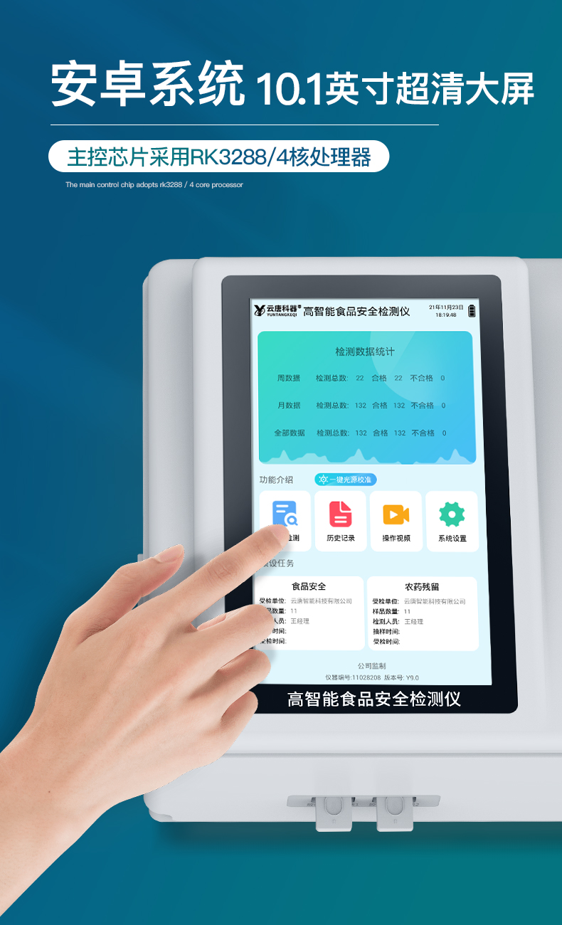 | 儀器采用臺式一體化系統(tǒng)檢測技術(shù),將分光光度模塊、新型農(nóng)殘檢測模塊、數(shù)字化管理模塊、無線通訊模塊高度集成于一體,支持檢測200種食品安全檢測項目,同時預(yù)留升級檢測方法。 | 儀器檢測模塊標(biāo)準(zhǔn)化、智能化,可隨意自由組合。檢測箱體內(nèi)置多個標(biāo)準(zhǔn)檢測單元,檢測模塊可以調(diào)整配置。 | 儀器采用全新安卓智能系統(tǒng),主控芯片采用 ARM Cortex-A7,RK3288/4核處理器,10.1寸高清液晶觸摸豎屏,更加**的UI交互界面,運轉(zhuǎn)快捷;儀器配備無線通信模塊: 4G(APN)通訊模塊、Wifi模塊,藍(lán)牙傳輸,同時具有雙USB接口以及RJ45接口能以多種方式實現(xiàn)數(shù)據(jù)保存和數(shù)據(jù)傳輸功能。 | 創(chuàng)新檢測模式: | ★檢測通道:≥12通道;采用精密旋轉(zhuǎn)比色池設(shè)計,使用同芯片同光源校準(zhǔn)精度,解決不同光源之間的誤差值。1-12通道間誤差0.1%。(***:**202022821055.2) | ★儀器具有自動識別比色皿檢測功能,即:將樣品比色皿放入儀器后,點擊樣品檢測,儀器自動識別比色皿進行通道檢測。 | 進口高精光源: | 高精度進口四波長冷光源,通道配置 410、520、590、630nm 波長光源,一個光源芯片驅(qū)動一個光源,誤差極小,每臺設(shè)備單獨**校準(zhǔn)光源,**比對,同時參照四種不同波段光源全方位覆蓋市面上99%的農(nóng)殘食品項目檢測。 | 智能化操作系統(tǒng): | 便捷操作系統(tǒng):設(shè)備檢測時可在同一檢測界面自動對應(yīng)相關(guān)檢測通道一次性選擇1-12個樣品名稱,無須退出界面,節(jié)省操作時間。 | 數(shù)據(jù)集成系統(tǒng):設(shè)備首頁自動統(tǒng)計檢測數(shù)據(jù)包含:周檢測數(shù)據(jù)、月檢測數(shù)據(jù),全部檢測總數(shù)量,均包含檢測總數(shù),合格數(shù),不合格數(shù),以及相關(guān)柱形分析圖,對各項檢測數(shù)據(jù)清晰掌握,無需電腦查詢,更加快捷直觀。 | 項目預(yù)設(shè)系統(tǒng):支持添加單個及多個相同或不相同的任務(wù)預(yù)設(shè),一鍵快速調(diào)取,每一個任務(wù)分別可以設(shè)置不同的樣品、批次、編號、來源、備注、抽樣信息、檢測信息、受檢信息、復(fù)核信息等更多信息。無縫鏈接平臺和APP實時查看下發(fā)任務(wù)。 | 數(shù)據(jù)監(jiān)管系統(tǒng):同步對接監(jiān)管平臺,數(shù)據(jù)可局域網(wǎng)和互聯(lián)網(wǎng)數(shù)據(jù)上傳,檢測結(jié)果可選擇直接傳至食品安全監(jiān)管平臺。集成OSS輸出存儲服務(wù)、區(qū)分設(shè)備定向管理應(yīng)用,進行區(qū)域食品安全監(jiān)管及大數(shù)據(jù)分析處理與數(shù)據(jù)統(tǒng)計,檢測區(qū)域食品安全長短期動態(tài),達(dá)到食品安全問題預(yù)估、預(yù)警。 | 自定義打印系統(tǒng):內(nèi)置全新打印系統(tǒng),新創(chuàng)自定義打印方式,可按需靈活設(shè)置開啟或關(guān)閉:產(chǎn)品合格證(國家農(nóng)業(yè)部標(biāo)準(zhǔn)要求),二維碼,抽樣信息、檢測信息,受檢信息、復(fù)核信息、抽樣日期、檢測日期等信息的打印。 | 系統(tǒng)遠(yuǎn)程更新功能:可定向分客戶分儀器更新系統(tǒng),按照不同客戶后期實際需求添加項目,無需機器返廠,即可遠(yuǎn)程實時升級全新系統(tǒng),節(jié)省時間成本及避免運輸造成設(shè)備損壞。 | 儀器主機采用一體化防水、抗壓、防撞擊、防腐蝕箱體設(shè)計,同時配備交直流供電,可連接車載電源,可選配大容量充電鋰電池,滿足現(xiàn)場野外檢測需求。 | 安全證書,放心保障:儀器具有中國計量科學(xué)研究院校準(zhǔn)證書,權(quán)威認(rèn)證。 |