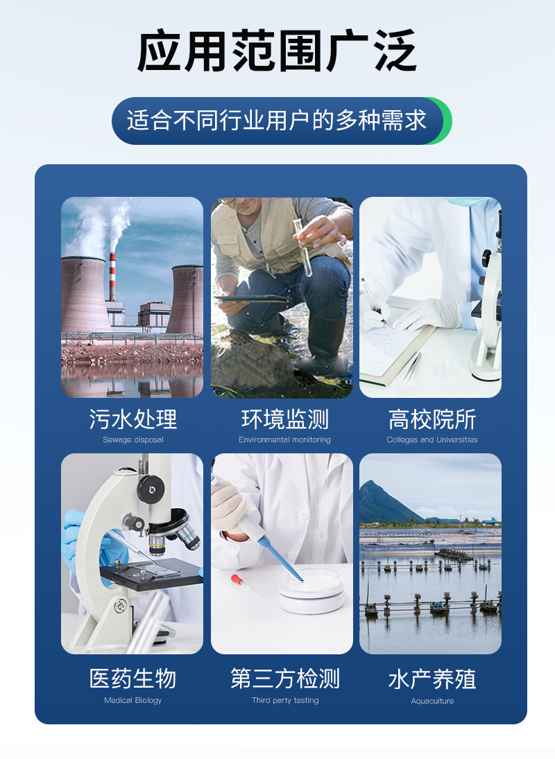適用于游泳場館、戶內外游泳池、水上樂園、溫泉浴池、純凈水廠、自來水廠、生活污水處理廠、工業(yè)污水、水產養(yǎng)殖、河流監(jiān)測、水源保護、生產監(jiān)測、科研實驗等。