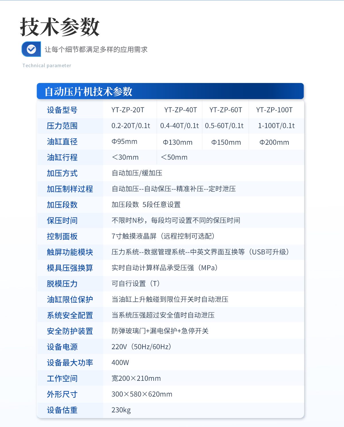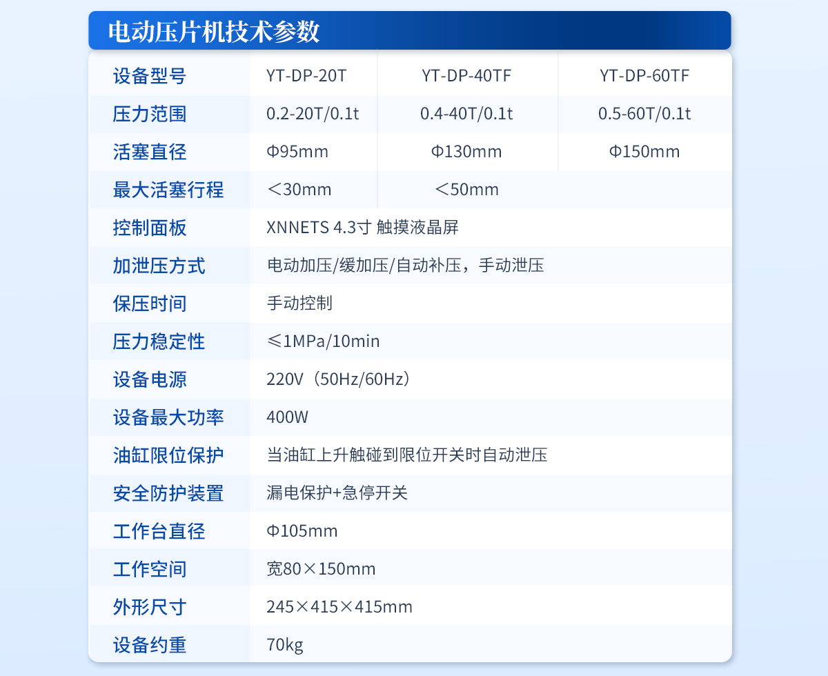 | 設(shè)備型號(hào):YT-DP-65TFZ | 壓力范圍:0.5-65T/0.1t | 油缸直徑:Φ160mm | 油缸行程 :<50mm | 加壓方式:自動(dòng)加壓/緩加壓 | 加壓制樣過(guò)程:自動(dòng)加壓--自動(dòng)保壓--精準(zhǔn)補(bǔ)壓--定時(shí)泄壓 | 加壓段數(shù):5段任意設(shè)置 | 保壓時(shí)間:不限時(shí)N秒,每段均可設(shè)置不同的保壓時(shí)間 | 控制面板:XNNETS 7寸 觸摸液晶屏(遠(yuǎn)程控制可選配) | 觸屏功能模塊:壓力系統(tǒng)--數(shù)據(jù)管理系統(tǒng)--中英文界面互換等(USB可升級(jí)) | 模具壓強(qiáng)換算:實(shí)時(shí)自動(dòng)計(jì)算樣品承受壓強(qiáng)(MPa) | 脫模壓力:可自行設(shè)置(T) | 油缸限位保護(hù):當(dāng)油缸上升觸碰到限位開(kāi)關(guān)時(shí)自動(dòng)泄壓 | 系統(tǒng)安全配置:當(dāng)系統(tǒng)壓強(qiáng)超過(guò)安全值時(shí)自動(dòng)泄壓 | 安全防護(hù)裝置:防彈玻璃門+漏電保護(hù)+急停開(kāi)關(guān) | 設(shè)備電源:220V(50Hz/60Hz) | 設(shè)備**功率:700W | 工作空間:寬220×220mm | 主機(jī)外形尺寸:330×420×680mm | 控制箱尺寸:280×400×400mm | 設(shè)備約重 :260kg | 配置說(shuō)明:主機(jī)1臺(tái),控制箱1臺(tái)!模具選配!可根據(jù)需求定制壓片機(jī)或模具 |