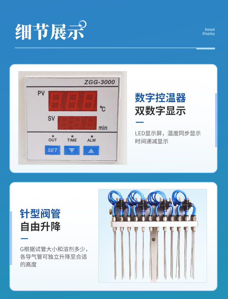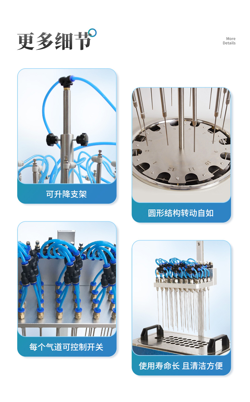 每個吹針都可以獨立控制,避免引起交叉污染。儀器氣腔高度可以自行調(diào)節(jié),配備標準氣針長度為15厘米。氮吹儀有36個氣道控制開關(guān),節(jié)約氣體,每根吹氣針的位置可獨立改變吹掃位置,使之適用不同的樣品容器及不同的樣品位置在濃縮有毒溶劑時,整個系統(tǒng)可置于通風(fēng)柜中,降低危險。內(nèi)置超溫保護裝置,自動故障檢測及報警功能,方便實用。儀器有LED顯示屏,溫度同步顯示、時間遞減顯示,可時時觀察溫度變化。具有整體溫度更均勻,加熱速度快本產(chǎn)品還可以作為普通的干式恒溫器使用使用起來更簡便,而且溫度也可以達到150℃,可以更好濃縮樣品