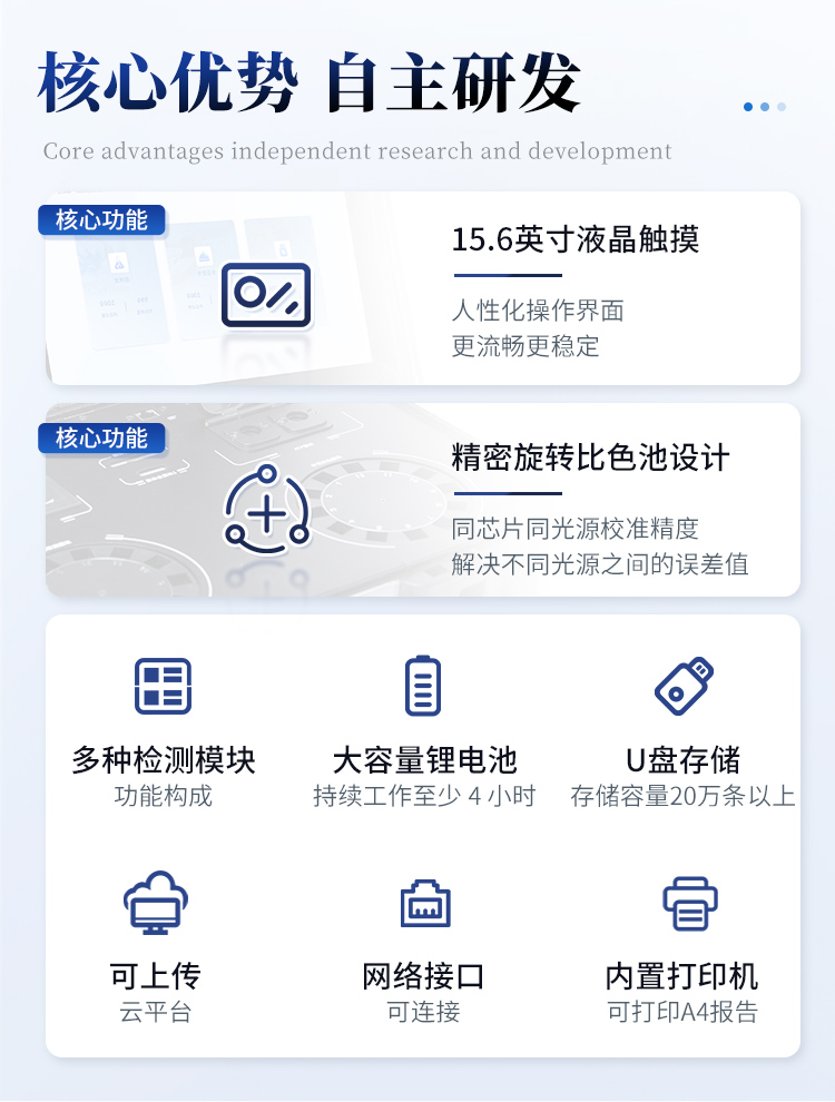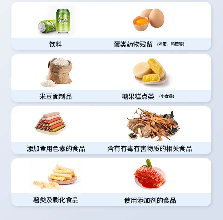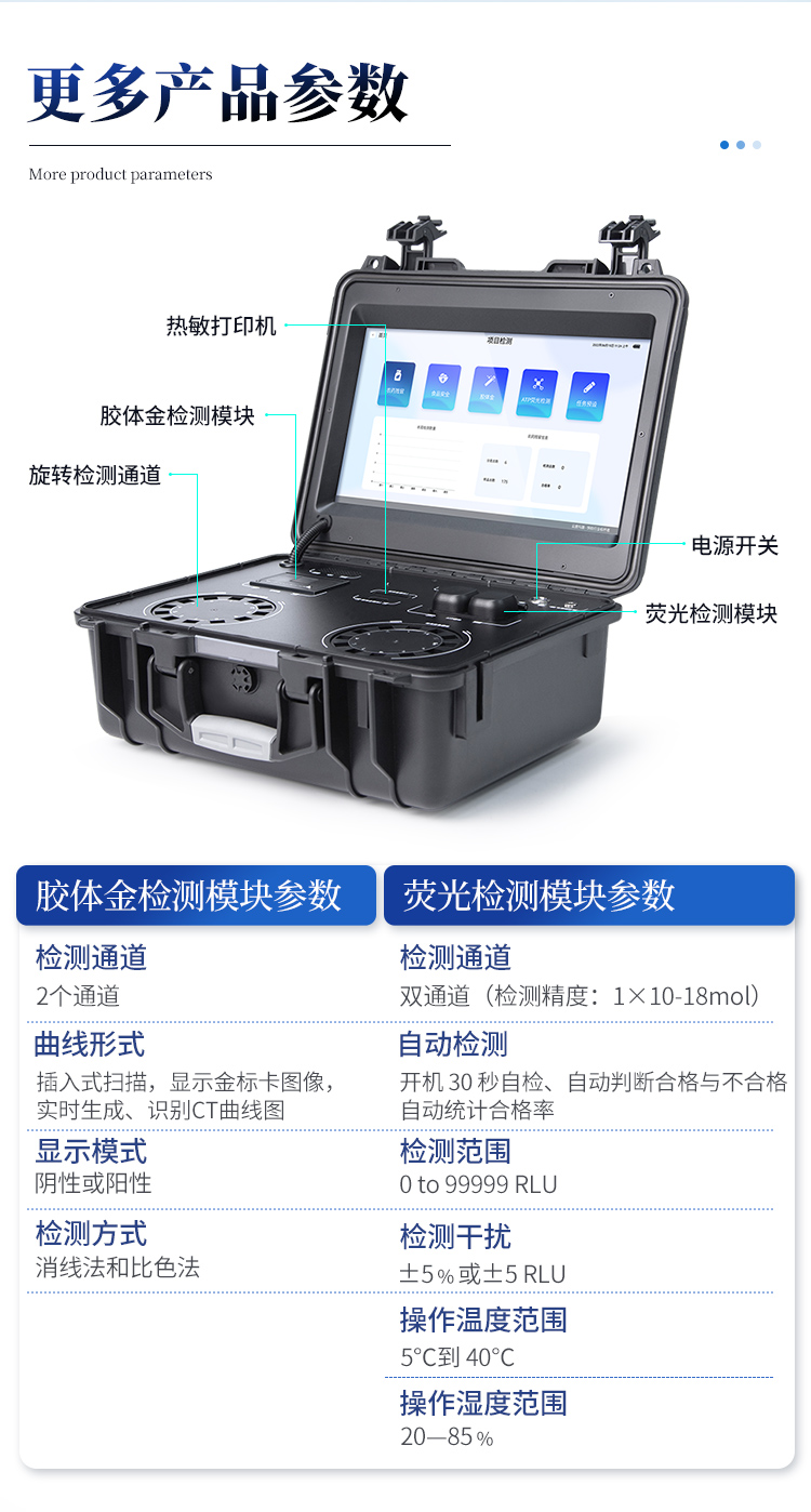 | 1. 功能構(gòu)成:主要包括分光光度模塊、新型農(nóng)殘檢測模塊、膠體金檢測模塊、熒光檢測模塊、數(shù)字化管理模塊等,所有模塊集成一體,可快速檢測200多種食品安全項(xiàng)目,如獸藥殘留、農(nóng)藥殘留、非法添加劑、細(xì)菌數(shù)值等指標(biāo)。 | 2. 檢測樣品種類:餐具及廚房用品、瓜果蔬菜及其制品、水產(chǎn)品及其制品、畜禽產(chǎn)品及其制品、嬰幼兒乳品及奶粉制品、蜂蜜、糧油及其制品、調(diào)味品(食醋、醬油、味精、鹽等)、酒類茶葉及其制品、食用菌、飲料、蛋類藥物殘留(雞蛋,鴨蛋等)、米豆面制品、糖果糕點(diǎn)類(小食品)、薯類及膨化食品、瓶(桶)裝飲用水、添加食用色素的食品、使用添加劑的食品、含有有毒有害物質(zhì)的相關(guān)食品。 | 3、顯示屏幕:儀器采用15.6英寸液晶觸摸屏顯,搭配運(yùn)行安卓智能操作系統(tǒng),主控芯片采用ARM Cortex-A7,RK3288/4核處理器,主頻1.88Ghz,操作方便,性能更強(qiáng)。 | 4、供電模式:儀器交直流兩用,直流12V供電,可連接車載電源,配18ah大容量充電鋰電池,電量可實(shí)時(shí)顯示,無外部電源條件下可持續(xù)工作至少 4 小時(shí)。 | 5、檢測通道:≥24通道;采用精密旋轉(zhuǎn)比色池設(shè)計(jì),使用同芯片同光源校準(zhǔn)精度,解決不同光源之間的誤差值,更加準(zhǔn)確**,采用高精度進(jìn)口四波長冷光源,每個(gè)通道均配置 410、520、590、630nm 波長光源,標(biāo)配**的光路切換裝置,專利光路切換功能可實(shí)現(xiàn)64波長,并且所有檢測項(xiàng)目可實(shí)現(xiàn)所有通道同時(shí)檢測. | 6、通訊接口:配備無線通信模塊、4G(APN)通訊模塊、藍(lán)牙傳輸,同時(shí)具有雙USB接口以及RJ45網(wǎng)線接口,可以多方式實(shí)現(xiàn)數(shù)據(jù)保存及數(shù)據(jù)傳輸。 | 7、存儲方式:支持U盤存儲,兩個(gè)標(biāo)準(zhǔn)USB接口,免驅(qū)動(dòng)安裝。檢測結(jié)果存儲容量20萬條以上,可生成Excel表格進(jìn)行拷貝,并具有登錄保護(hù)功能。 | 8、操作系統(tǒng):儀器可在同一檢測界面自動(dòng)對應(yīng)相關(guān)檢測通道,一次性選擇不少于11個(gè)樣品名稱,無需退出界面,節(jié)省操作時(shí)間。并可以對每個(gè)通道屬性和樣品信息單獨(dú)進(jìn)行編輯,例如送檢單位、人員,檢測人員等,打印時(shí)勾選打印顯示。 | 9、數(shù)據(jù)集成系統(tǒng):設(shè)備首頁自動(dòng)匯總分析檢測數(shù)據(jù),包含:周檢測數(shù)據(jù)、月檢測數(shù)據(jù),全部檢測總數(shù)量,包含檢測總數(shù),合格數(shù),不合格數(shù),以及相關(guān)柱形分析圖,各項(xiàng)檢測數(shù)據(jù)一目了然,無需電腦查詢,更加快捷直觀。 | 10、數(shù)據(jù)庫系統(tǒng):十幾項(xiàng)數(shù)據(jù)庫分類管理儀器:包含項(xiàng)目類型、項(xiàng)目數(shù)據(jù)、檢測數(shù)據(jù)、歷史記錄、國標(biāo)信息、曲線信息、采樣信息、檢測信息、受檢信息、復(fù)核信息、圖表信息、光源校準(zhǔn)信息、打印樣式信息、樣品庫信息等等,數(shù)據(jù)庫之間互相協(xié)調(diào)聯(lián)動(dòng)保證數(shù)據(jù)的真實(shí)完整性。同時(shí)產(chǎn)品數(shù)據(jù)庫以及歷史檢測記錄支持一鍵檢索功能。 | 11、限量規(guī)判系統(tǒng):具有限量查詢、添加物質(zhì)合規(guī)判定系統(tǒng)。檢測出結(jié)果后,系統(tǒng)自動(dòng)調(diào)用系統(tǒng)數(shù)據(jù)庫中相關(guān)國標(biāo)進(jìn)行比對判定,客觀顯示判定結(jié)果是否合格。 | 12、項(xiàng)目預(yù)設(shè)系統(tǒng):儀器具有任務(wù)預(yù)設(shè)模塊,一鍵提前預(yù)設(shè),給出方便快捷的新檢測方案,每一個(gè)任務(wù)分別可以設(shè)置不同的樣品、批次、編號、來源、備注、抽樣信息、檢測信息、受檢信息、復(fù)核信息等更多信息。樣品送檢時(shí)一鍵調(diào)取保存信息,并可多次調(diào)取,適用于大批量檢測業(yè)務(wù),可以大大提高檢測效率。 | 13、數(shù)據(jù)監(jiān)管系統(tǒng):同步對接監(jiān)管平臺,數(shù)據(jù)可局域網(wǎng)和互聯(lián)網(wǎng)數(shù)據(jù)上傳,檢測結(jié)果可直接傳至食品安全監(jiān)管平臺。進(jìn)行區(qū)域食品安全監(jiān)管及大數(shù)據(jù)分析處理與數(shù)據(jù)統(tǒng)計(jì),監(jiān)測區(qū)域食品安全長短期動(dòng)態(tài)及問題預(yù)估、預(yù)警。 | 14.1、全新打印系統(tǒng):內(nèi)置全新打印機(jī),新創(chuàng)自定義打印方式,可按需靈活勾選控制:產(chǎn)品合格證(國家農(nóng)業(yè)部標(biāo)準(zhǔn)要求),二維碼,抽樣信息、檢測信息,受檢信息、復(fù)核信息、抽樣日期、檢測日期等信息的打印。 | 14.2、A4紙版本報(bào)告打印功能:設(shè)備擁有兩種結(jié)果展示方式,可以自動(dòng)生成A4打印模板和小票打印模板兩種樣式,可通過WiFi及網(wǎng)線等方式連接外置打印機(jī)可進(jìn)行打印。 | 15、膠體金檢測模塊:采用單通道CMOS成像處理技術(shù)及膠體金免疫層析技術(shù),可讀取膠體金卡數(shù)據(jù),自動(dòng)采集、處理分析,將檢測結(jié)果顯示,并可根據(jù)參考限值自動(dòng)判斷檢測結(jié)果,可檢測常見的獸藥殘留、生物毒素、抗生素、違禁添加物等。 | 15.1、可即時(shí)檢測單聯(lián)卡及三聯(lián)卡; | 15.2、檢測通道:2個(gè)通道; | 15.3、檢測方式:消線法和比色法; 