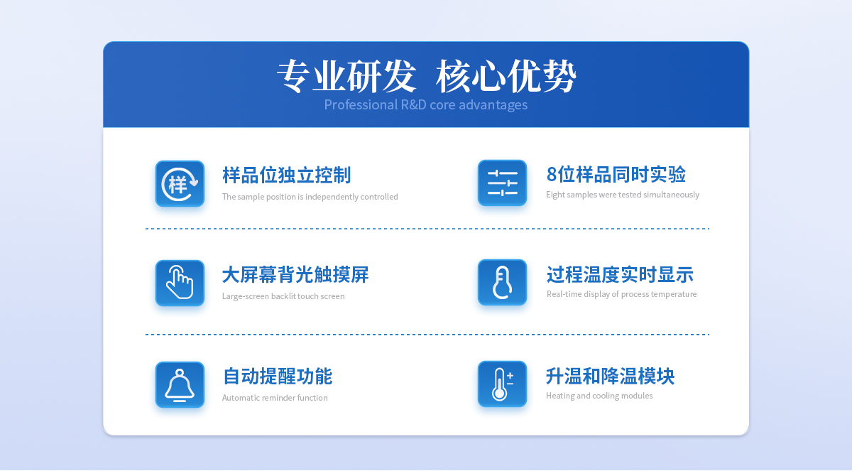 | ◆ 全樣品位:28位, | ◆ 可同時(shí)滿(mǎn)足制膠過(guò)程和冰水浴操作。制膠和冰水浴可在屏上獨(dú)立操控,互不影響。 | ◆ 制膠控制,通過(guò)無(wú)級(jí)控溫旋鈕控制加熱功率,安全制膠。 | ◆ 水位自動(dòng)檢測(cè)功能:自動(dòng)檢測(cè)水位,缺水自動(dòng)停止。 | ◆ 自動(dòng)進(jìn)排水:自動(dòng)進(jìn)排水。 | ◆ 控溫精度:±0.1℃ | ◆ 沸點(diǎn)自動(dòng)檢測(cè) 不同地區(qū)不同大氣壓下自動(dòng)檢測(cè)當(dāng)下環(huán)境的沸點(diǎn),提醒加樣。 | ◆ 提醒功能: 沸水浴停止自動(dòng)提醒 靜置結(jié)束自動(dòng)提醒 冰水浴冷卻結(jié)束自動(dòng)提醒 冰水浴溫度過(guò)高加冰提醒 沸水到溫提醒制膠開(kāi)始。 | ◆ 大屏幕背光觸摸屏,方便直觀(guān)操作。 |