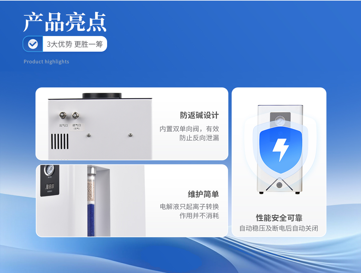 1. 壓力、流量自動顯示,自動恒壓、恒流,氮?dú)饬髁靠筛鶕?jù)用量實現(xiàn)全自動調(diào)節(jié)。 2. 不銹鋼過濾器,儀器內(nèi)部采用硅橡膠圈(含硫量低),有效提高氣體質(zhì)量,保證色譜基線平穩(wěn)。 3. 配有安全裝置,靈敏可靠,自動防返堿。