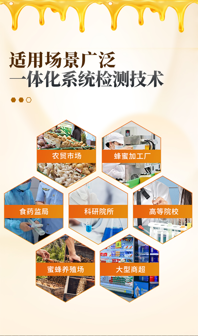 蜂蜜蔗糖、蜂蜜還原糖(葡萄糖和果糖)、蜂蜜羥甲基糠醛、蜂蜜酸度、蜂蜜中農(nóng)藥殘留、蜂蜜淀粉酶值、蜂蜜中脯氨酸、蜂蜜水分、蜂蜜糖分、蜂蜜中重金屬(鉛、鎘、汞)、蜂蜜中抗生素(氯霉素、四環(huán)素、磺胺類、呋喃類、喹諾酮類)、蜂蜜中灰分,應(yīng)用范圍:應(yīng)用于現(xiàn)場(chǎng)檢測(cè)蜂蜜蔗糖、葡萄糖和果糖、羥甲基糠醛、酸度、農(nóng)殘、淀粉酶、脯氨酸、水分、糖分、重金屬、抗生素、灰分含量的蜂蜜快速檢測(cè)儀,可廣泛應(yīng)用于各類蜂蜜品質(zhì)的快速定量檢測(cè)。