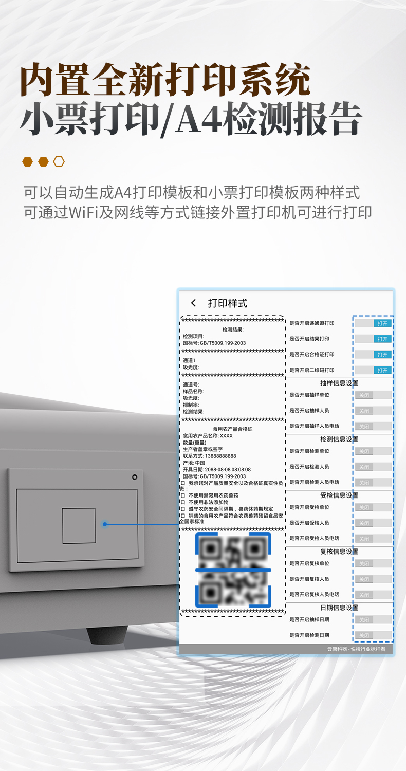 | 儀器采用臺(tái)式一體化系統(tǒng)檢測(cè)技術(shù),將分光光度模塊、膠體金檢測(cè)模塊、新型農(nóng)殘檢測(cè)模塊、數(shù)字化管理模塊、無(wú)線通訊模塊高度集成于一體,支持檢測(cè)200種食品安全檢測(cè)項(xiàng)目,同時(shí)預(yù)留升級(jí)檢測(cè)方法。 | 儀器檢測(cè)模塊標(biāo)準(zhǔn)化、智能化,檢測(cè)項(xiàng)目可隨意自由組合。檢測(cè)箱體內(nèi)置多個(gè)標(biāo)準(zhǔn)檢測(cè)單元,檢測(cè)模塊可以調(diào)整配置。 | 顯示屏幕:儀器采用10.1英寸豎向液晶觸摸屏顯,搭配運(yùn)行安卓智能操作系統(tǒng),主控芯片采用ARM Cortex-A7,RK3288/4核處理器,主頻1.88Ghz,操作方便,性能更強(qiáng)。 | 檢測(cè)通道:≥12通道;采用精密旋轉(zhuǎn)比色池設(shè)計(jì),使用同芯片同光源校準(zhǔn)精度,解決不同光源之間的誤差值,更加準(zhǔn)確**。(1-12通道間誤差0.1%,***:**202022821055.2) | 儀器光源:高精度進(jìn)口四波長(zhǎng)冷光源,每個(gè)通道均配置 410、520、590、630nm 波長(zhǎng)光源,標(biāo)配**的光路切換裝置,專利光路切換功能可實(shí)現(xiàn)64波長(zhǎng),并且所有檢測(cè)項(xiàng)目可實(shí)現(xiàn)所有通道同時(shí)檢測(cè)。 | 設(shè)備可一鍵校準(zhǔn),自動(dòng)保存校準(zhǔn)數(shù)據(jù),自動(dòng)對(duì)比校驗(yàn),得到精準(zhǔn)光源,采用Android SP存儲(chǔ)數(shù)據(jù),光源數(shù)據(jù)永不丟失,方便每一次使用。 | 通訊接口:配備無(wú)線通信模塊、4G(APN)通訊模塊、藍(lán)牙傳輸,同時(shí)具有雙USB接口以及RJ45網(wǎng)線接口,可以多方式實(shí)現(xiàn)數(shù)據(jù)保存及數(shù)據(jù)傳輸 | 存儲(chǔ)方式:支持U盤存儲(chǔ),標(biāo)準(zhǔn)USB接口,免驅(qū)動(dòng)安裝。檢測(cè)結(jié)果存儲(chǔ)容量20萬(wàn)條以上,可生成Excel表格進(jìn)行拷貝,并具有登錄保護(hù)功能。 | 智能化操作系統(tǒng): | 1)操作系統(tǒng):儀器可在同一檢測(cè)界面自動(dòng)對(duì)應(yīng)相關(guān)檢測(cè)通道,一次性選擇1-12個(gè)樣品名稱,無(wú)需退出界面,節(jié)省操作時(shí)間。并可以對(duì)每個(gè)通道屬性和樣品信息單獨(dú)進(jìn)行編輯,例如送檢單位、人員,檢測(cè)人員等,打印時(shí)勾選打印顯示。 | 2)數(shù)據(jù)集成系統(tǒng):設(shè)備首頁(yè)自動(dòng)匯總分析檢測(cè)數(shù)據(jù),包含:周檢測(cè)數(shù)據(jù)、月檢測(cè)數(shù)據(jù),全部檢測(cè)總數(shù)量,均包含檢測(cè)總數(shù),合格數(shù),不合格數(shù),以及相關(guān)柱形分析圖,各項(xiàng)檢測(cè)數(shù)據(jù)一目了然,無(wú)需電腦查詢,更加快捷直觀。 | 3)數(shù)據(jù)庫(kù)系統(tǒng):十幾項(xiàng)數(shù)據(jù)庫(kù)分類管理儀器:包含項(xiàng)目類型、項(xiàng)目數(shù)據(jù)、檢測(cè)數(shù)據(jù)、歷史記錄、國(guó)標(biāo)信息、曲線信息、采樣信息、檢測(cè)信息、受檢信息、復(fù)核信息、圖表信息、光源校準(zhǔn)信息、打印樣式信息、樣品庫(kù)信息等等,數(shù)據(jù)庫(kù)之間互相協(xié)調(diào)聯(lián)動(dòng)保證數(shù)據(jù)的真實(shí)完整性。同時(shí)產(chǎn)品數(shù)據(jù)庫(kù)以及歷史檢測(cè)記錄支持一鍵檢索功能。 | 4)限量規(guī)判系統(tǒng):具有限量查詢、添加物質(zhì)合規(guī)判定系統(tǒng)。檢測(cè)出結(jié)果后,系統(tǒng)自動(dòng)調(diào)用系統(tǒng)數(shù)據(jù)庫(kù)中相關(guān)國(guó)標(biāo)進(jìn)行比對(duì)判定,客觀顯示判定結(jié)果是否合格。 | 5)項(xiàng)目預(yù)設(shè)系統(tǒng):儀器具有任務(wù)預(yù)設(shè)模塊,一鍵提前預(yù)設(shè),給出方便快捷的新檢測(cè)方案,每一個(gè)任務(wù)分別可以設(shè)置不同的樣品、批次、編號(hào)、來(lái)源、備注、抽樣信息、檢測(cè)信息、受檢信息、復(fù)核信息等更多信息。樣品送檢時(shí)一鍵調(diào)取保存信息,并可多次調(diào)取,大大提高檢測(cè)效率。 | 6)數(shù)據(jù)監(jiān)管系統(tǒng):同步對(duì)接監(jiān)管平臺(tái),數(shù)據(jù)可局域網(wǎng)和互聯(lián)網(wǎng)數(shù)據(jù)上傳,檢測(cè)結(jié)果可選擇直接傳至食品安全監(jiān)管平臺(tái)。進(jìn)行區(qū)域食品安全監(jiān)管及大數(shù)據(jù)分析處理與數(shù)據(jù)統(tǒng)計(jì),檢測(cè)區(qū)域食品安全長(zhǎng)短期動(dòng)態(tài),達(dá)到食品安全問(wèn)題預(yù)估、預(yù)警。 | 7)1.全新打印系統(tǒng):內(nèi)置全新打印機(jī),新創(chuàng)自定義打印方式,可按需靈活勾選控制:產(chǎn)品合格證(國(guó)家農(nóng)業(yè)部標(biāo)準(zhǔn)要求),二維碼,抽樣信息、檢測(cè)信息,受檢信息、復(fù)核信息、抽樣日期、檢測(cè)日期等信息的打印。 2.A4紙版本報(bào)告打印功能(可選配):設(shè)備擁有兩種結(jié)果展示方式,可以自動(dòng)生成A4打印模板和小票打印模板兩種樣式,可通過(guò)WiFi及網(wǎng)線等方式鏈接外置打印機(jī)可進(jìn)行打印。 | 供電模式:儀器交直流兩用,直流12V供電,可連接車載電源,可配6ah大容量充電鋰電池,電量可實(shí)時(shí)顯示,方便戶外流動(dòng)測(cè)試。 | 膠體金檢測(cè)模塊:采用雙通道CMOS成像處理技術(shù)及膠體金免疫層析技術(shù),可同時(shí)讀取雙膠體金卡數(shù)據(jù),自動(dòng)采集、處理分析,將檢測(cè)結(jié)果顯示,并可根據(jù)參考限值自動(dòn