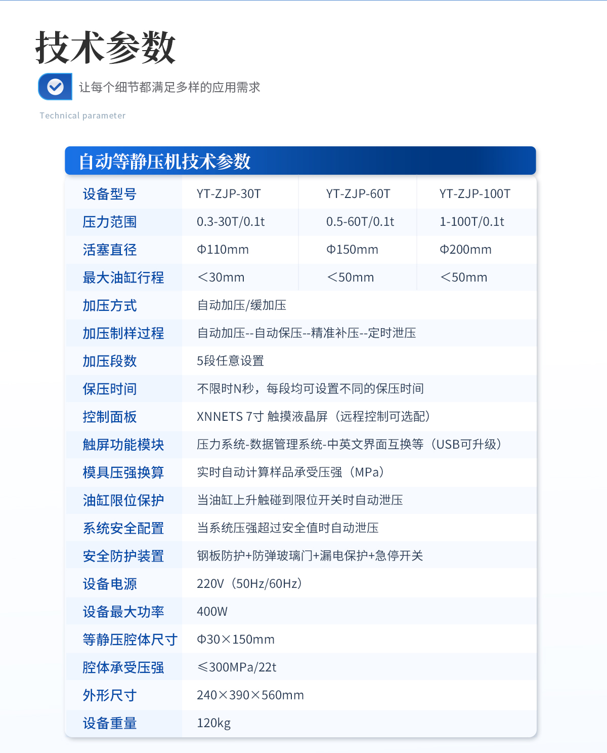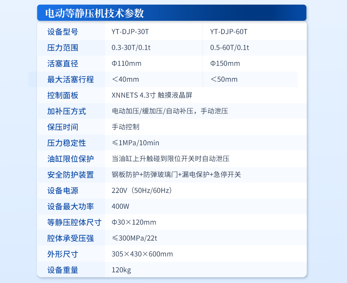 規(guī)格型號:YT-ZJP-30T壓力范圍:0.3-30T/0.1t活塞直徑 :Φ110mm**油缸行程:<30mm加壓方式:自動加壓/緩加壓加壓制樣過程:自動加壓--自動保壓--精準(zhǔn)補(bǔ)壓--定時泄壓加壓段數(shù):5段任意設(shè)置保壓時間 :不限時N秒,每段均可設(shè)置不同的保壓時間控制面板:XNNETS 7寸 觸摸液晶屏(遠(yuǎn)程控制可選配)觸屏功能模塊:壓力系-統(tǒng)-數(shù)據(jù)管理系統(tǒng)--中英文界面互換等(USB可升級)模具壓強(qiáng)換算:實時自動計算樣品承受壓強(qiáng)(MPa)油缸限位保護(hù):當(dāng)油缸上升觸碰到限位開關(guān)時自動泄壓系統(tǒng)安全配置:當(dāng)系統(tǒng)壓強(qiáng)超過安全值時自動泄壓安全防護(hù)裝置:鋼板防護(hù)+防彈玻璃門+漏電保護(hù)+急停開關(guān)設(shè)備電源:220V(50Hz/60Hz)設(shè)備**功率:400W等靜壓腔體尺寸:Φ30×150mm腔體承受壓強(qiáng):≤300MPa/22t外形尺寸:240×390×560mm設(shè)備重量:120kg配置說明:等靜壓機(jī)1臺!可根據(jù)需求定制500MPa等靜壓機(jī)或橡膠模具