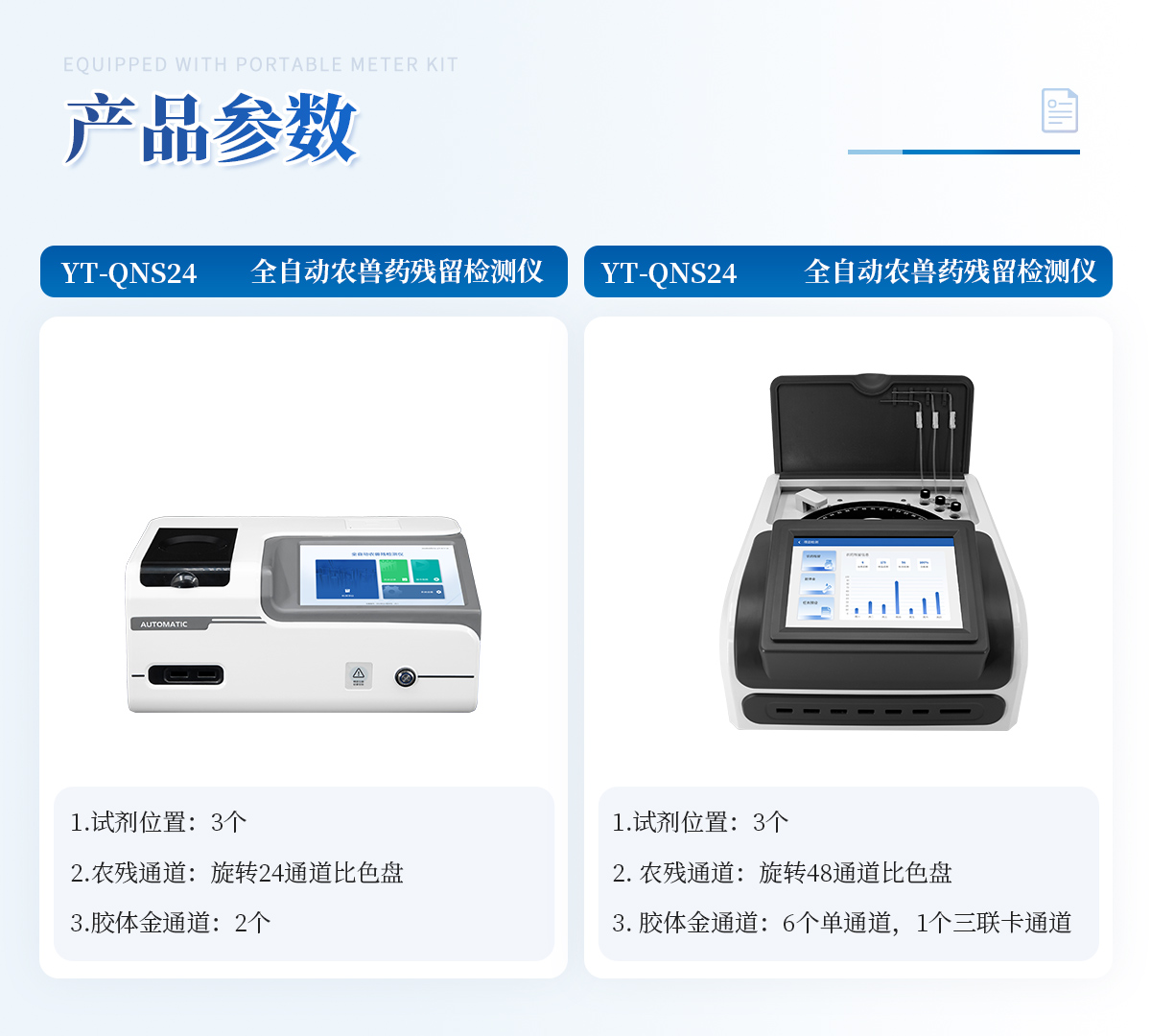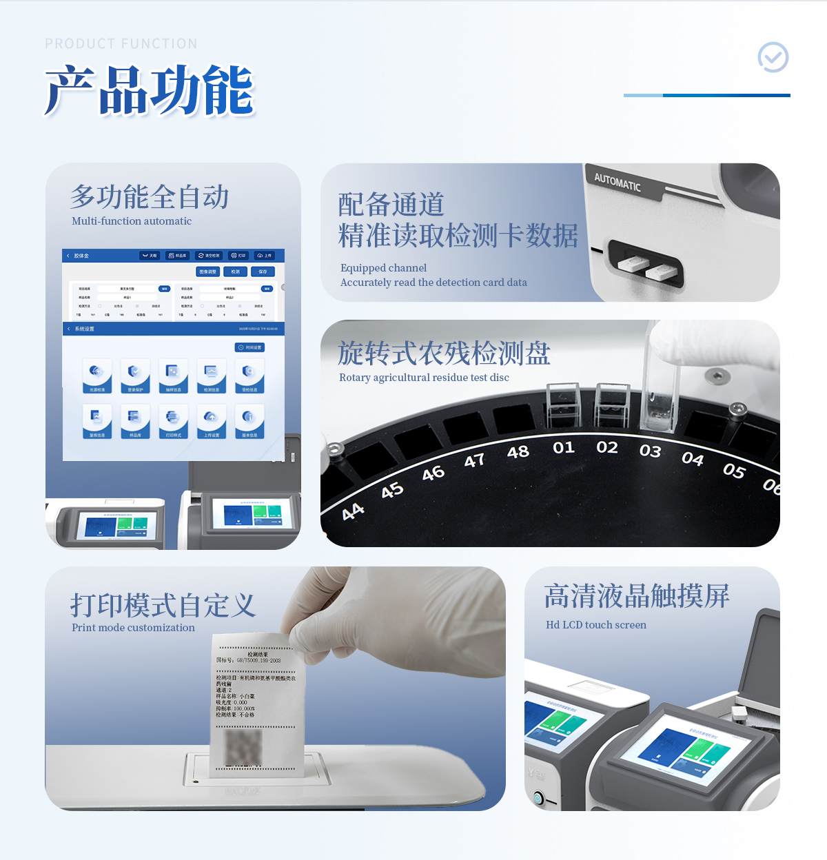 | 1. 試劑位置:3個(gè) | 2. 農(nóng)殘檢測(cè)盤(pán):旋轉(zhuǎn)48通道比色盤(pán),可任意選擇檢測(cè)通道,自動(dòng)對(duì)應(yīng)選擇通道。 | 3. 膠體金通道:6個(gè)單通道,1個(gè)三聯(lián)卡通道,可讀取檢測(cè)卡結(jié)果,自動(dòng)采集、處理分析,自動(dòng)判斷檢測(cè)結(jié)果,并具備自動(dòng)判空功能。 | 4.系統(tǒng)配置:10.1寸高清液晶觸摸屏,采用ARM Cortex-A7,RK3288/4核處理器,運(yùn)行內(nèi)存1GB。Android7.1.1 系統(tǒng)分辨率1280×800。 | 5.恒溫系統(tǒng):具有自動(dòng)加溫溫控系統(tǒng),精準(zhǔn)恒溫37℃,精度±0.1℃。 | 6.添加系統(tǒng):儀器按照試劑要求自動(dòng)、按時(shí)、按量加入試劑,并且自動(dòng)對(duì)未正常放置的樣本或異常的樣本進(jìn)行檢查并提示。 | 7.清洗功能:儀器具備回流及自動(dòng)清洗管路功能,避免試劑污染。 | 8.混勻功能:設(shè)備具備自動(dòng)混勻功能。 | 9.光源校準(zhǔn):設(shè)備可自動(dòng)校準(zhǔn),確保檢測(cè)準(zhǔn)確度。 | 10.實(shí)時(shí)監(jiān)控:儀器測(cè)試過(guò)程中屏幕顯示運(yùn)行狀態(tài),可實(shí)時(shí)查看。 | 11.數(shù)據(jù)存儲(chǔ):內(nèi)部存儲(chǔ)16GB,可存儲(chǔ)500萬(wàn)條數(shù)據(jù)。 | 12.樣品多選功能:設(shè)備具備樣品一鍵多選功能,選擇樣品自動(dòng)匹配檢測(cè)通道。 | 13.項(xiàng)目預(yù)設(shè):可提前設(shè)置單個(gè)及多個(gè)相同或不相同的檢測(cè)任務(wù),可單次或者多次調(diào)取,減少檢測(cè)時(shí)間。 | 14.自定義打印系統(tǒng):內(nèi)置自定義打印系統(tǒng),可按需靈活設(shè)置開(kāi)啟或關(guān)閉:產(chǎn)品合格證(國(guó)家農(nóng)業(yè)部標(biāo)準(zhǔn)),二維碼,抽樣信息、檢測(cè)信息,受檢信息等信息的打印。 | 15.A4版本報(bào)告打印功能:設(shè)備可自動(dòng)生成A4版報(bào)告,A4報(bào)告帶二維碼,可掃描二維碼生成電子版,并可識(shí)別真?zhèn)巍?/td> | 16.傳輸方式:儀器配備無(wú)線通信模塊: 4G(APN)通訊模塊、Wifi模塊,藍(lán)牙傳輸模塊,同時(shí)具有USB接口以及RJ45接口能以多種方式實(shí)現(xiàn)數(shù)據(jù)保存和數(shù)據(jù)傳輸功能,設(shè)備數(shù)據(jù)可以同步上傳至平臺(tái)。 | 17.數(shù)據(jù)監(jiān)管系統(tǒng):設(shè)備自帶監(jiān)管平臺(tái),并可同步對(duì)接監(jiān)管平臺(tái),數(shù)據(jù)可局域網(wǎng)和互聯(lián)網(wǎng)數(shù)據(jù)上傳,檢測(cè)結(jié)果可直接傳至食品安全監(jiān)管平臺(tái)。達(dá)到食品安全問(wèn)題預(yù)估、預(yù)警。 | 18.系統(tǒng)遠(yuǎn)程更新功能:無(wú)需設(shè)備返廠,即可遠(yuǎn)程實(shí)時(shí)升級(jí)全新系統(tǒng),節(jié)省時(shí)間成本及避免運(yùn)輸造成設(shè)備損。 |