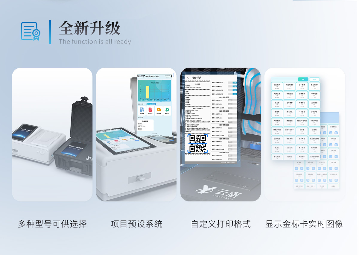 | 儀器采用10.1英寸液晶觸摸屏顯,搭配運行安卓智能操作系統(tǒng),主控芯片采用ARM Cortex-A7,RK3288/4核處理器,主頻1.88Ghz,運轉(zhuǎn)速度更快速,性能更強。 | 儀器功能包括:膠體金檢測模塊、數(shù)字化管理模塊、無線通訊模塊等,可以滿足同一軟件下實現(xiàn)所有檢測項目的檢測,并在同一窗口展示檢測結(jié)果。 | 一體化臺式快檢設(shè)備,采用交直流兩用供電方式,可連接車載電源,配備6ah大容量充電鋰電池,可以滿足現(xiàn)場及流動檢測使用的需求。儀器尺寸:43×35×20cm, 主機凈重:5.1kg | 系統(tǒng)自帶數(shù)據(jù)集成模塊,設(shè)備首頁自動統(tǒng)計檢測數(shù)據(jù)包含:周檢測數(shù)據(jù)、月檢測數(shù)據(jù),全部檢測總數(shù)量,均包含檢測總數(shù),合格數(shù),不合格數(shù),以及相關(guān)柱形分析圖,對各項檢測數(shù)據(jù)清晰掌握,無需電腦查詢,更加快捷直觀。 | 儀器具有任務(wù)預(yù)設(shè)模塊,可在樣品送檢前提前預(yù)設(shè)樣品名稱、檢測指標、送檢單位等信息,樣品送檢時一鍵調(diào)取保存信息,檢測更加方便快捷。 | 直插式自動傳輸掃描方式,可實時顯示金標卡實時圖像,系統(tǒng)自動分析并呈現(xiàn)出CT曲線圖,CT線自動識別,無需手動調(diào)整,完成檢測后自動退出檢測卡。 | 結(jié)果判定線可修改,對照值標定值可保存,斷電不丟失數(shù)據(jù)。 | 兼容市場上其他膠體金卡,使用耗材不受限制,極大增強用戶使用體驗。 | 儀器檢測系統(tǒng)擁有龐大數(shù)據(jù)庫,并且構(gòu)建了完善的檢索、修訂功能。食品庫涵蓋多種樣品名稱,可按需添加或刪除、編輯樣品名稱;產(chǎn)品數(shù)據(jù)庫以及歷史檢測記錄支持一鍵檢索功能。 | 系統(tǒng)打印自定義化,打印格式多樣化,產(chǎn)品合格證(國家標準要求),二維碼,抽樣信息、檢測信息,受檢信息、復(fù)核信息、抽樣日期、檢測日期等信息結(jié)果,可按需求自行設(shè)置打印內(nèi)容。 | A4紙版本報告打印功能(可選配):設(shè)備擁有兩種結(jié)果展示方式,可以自動生成A4打印模板和小票打印模板兩種樣式,可通過WiFi及網(wǎng)線等方式鏈接外置打印機可進行打印 | 儀器具有 wifi 聯(lián)網(wǎng)上傳、RJ45網(wǎng)線連接功能,可以快速上傳數(shù)據(jù)。同步對接監(jiān)管平臺,數(shù)據(jù)可局域網(wǎng)和互聯(lián)網(wǎng)數(shù)據(jù)上傳,檢測結(jié)果直接傳至食品安全監(jiān)管平臺。進行區(qū)域食品安全監(jiān)管及大數(shù)據(jù)分析處理與數(shù)據(jù)統(tǒng)計,檢測區(qū)域食品安全長短期動態(tài),達到食品安全問題預(yù)估、預(yù)警。 | 設(shè)備支持U盤存儲,標準USB接口,免驅(qū)動安裝。檢測結(jié)果存儲容量20萬條以上,可生成Excel表格,進行一鍵拷貝,并具有登錄保護功能,可設(shè)置用戶名及密碼,規(guī)范不同人員操作權(quán)限,防止非工作人員操作,并且可以進行重新校準、鎖定、恢復(fù)出廠設(shè)置功能。儀器固件可升級,后期檢測項目可擴充。 | 儀器具有重新校準、鎖定、恢復(fù)出廠設(shè)置功能。 | 儀器具備遠程升級功能,可定向分客戶分儀器更新,開機后自動更新,并可持續(xù)性免費更新系統(tǒng)版本,無需像傳統(tǒng)產(chǎn)品返廠更新,節(jié)省時間及人力成本并避免了物流運輸返廠升級導(dǎo)致設(shè)備損壞的潛在風險。 |
