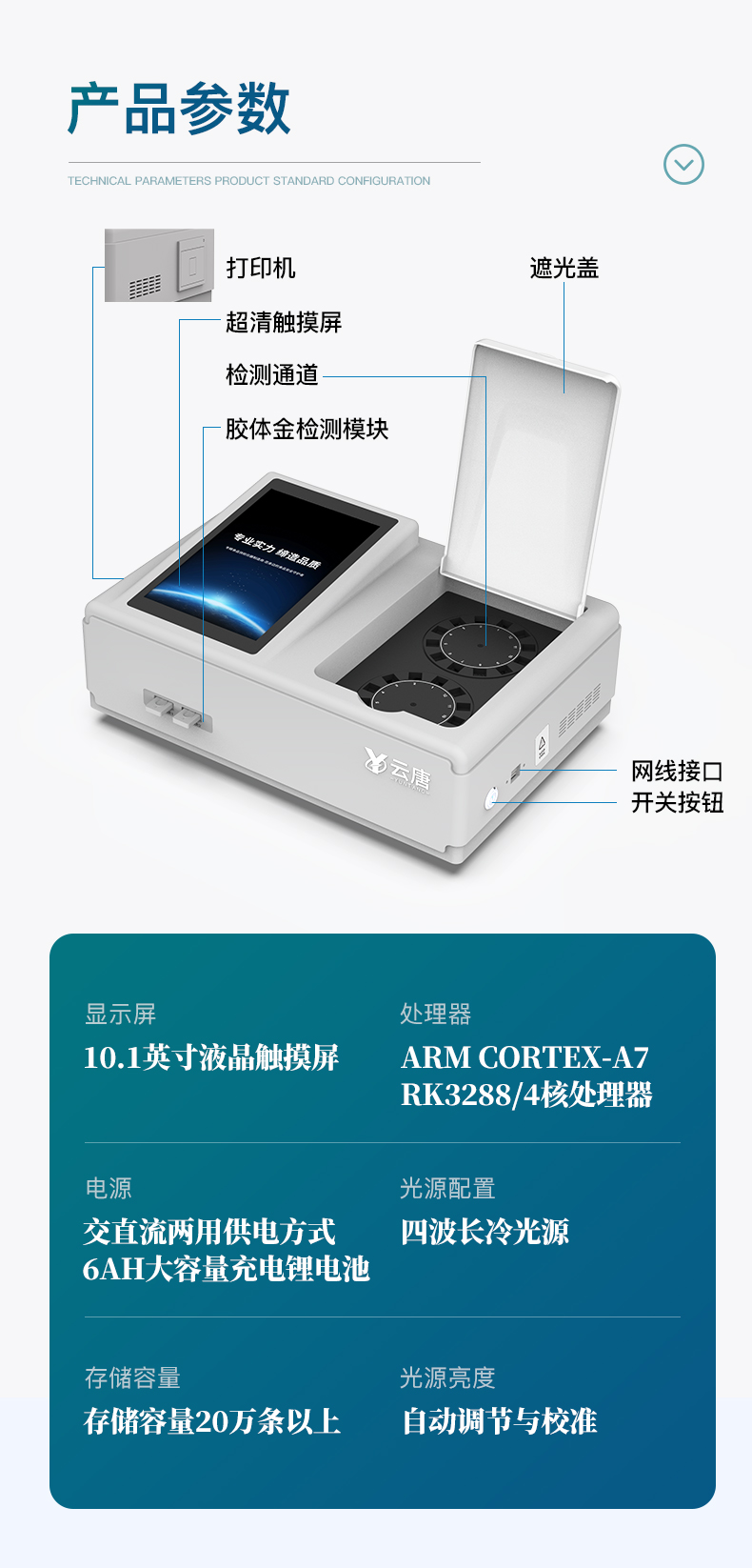 | 1、儀器采用臺式一體化系統(tǒng)檢測技術(shù),將分光光度模塊、膠體金檢測模塊、新型農(nóng)殘檢測模塊、數(shù)字化管理模塊、無線通訊模塊高度集成于一體,支持檢測200種食品安全檢測項目,同時預(yù)留升級檢測方法。 | 2、儀器檢測模塊標(biāo)準(zhǔn)化、智能化,檢測項目可隨意自由組合。檢測箱體內(nèi)置多個標(biāo)準(zhǔn)檢測單元,檢測模塊可以調(diào)整配置。 | 3、顯示屏幕:儀器采用10.1英寸豎向液晶觸摸屏顯,搭配運行安卓智能操作系統(tǒng),主控芯片采用ARM Cortex-A7,RK3288/4核處理器,主頻1.88Ghz,操作方便,性能更強。 | 4、檢測通道:≥12通道;采用精密旋轉(zhuǎn)比色池設(shè)計,使用同芯片同光源校準(zhǔn)精度,解決不同光源之間的誤差值,更加準(zhǔn)確**。(1-12通道間誤差0.1%,***:**202022821055.2) | 5、儀器光源:高精度進口四波長冷光源,每個通道均配置 410、520、590、630nm 波長光源,標(biāo)配**的光路切換裝置,專利光路切換功能可實現(xiàn)64波長,并且所有檢測項目可實現(xiàn)所有通道同時檢測。 | 6、設(shè)備可一鍵校準(zhǔn),自動保存校準(zhǔn)數(shù)據(jù),自動對比校驗,得到精準(zhǔn)光源,采用Android SP存儲數(shù)據(jù),光源數(shù)據(jù)永不丟失,方便每一次使用。 | 7、通訊接口:配備無線通信模塊、4G(APN)通訊模塊、藍牙傳輸,同時具有雙USB接口以及RJ45網(wǎng)線接口,可以多方式實現(xiàn)數(shù)據(jù)保存及數(shù)據(jù)傳輸。 | 8、存儲方式:支持U盤存儲,標(biāo)準(zhǔn)USB接口,免驅(qū)動安裝。檢測結(jié)果存儲容量20萬條以上,可生成Excel表格進行拷貝,并具有登錄保護功能。 | 9、智能化操作系統(tǒng): | 9.1、操作系統(tǒng):儀器可在同一檢測界面自動對應(yīng)相關(guān)檢測通道,一次性選擇1-12個樣品名稱,無需退出界面,節(jié)省操作時間。并可以對每個通道屬性和樣品信息單獨進行編輯,例如送檢單位、人員,檢測人員等,打印時勾選打印顯示。 | 9.2、數(shù)據(jù)集成系統(tǒng):設(shè)備首頁自動匯總分析檢測數(shù)據(jù),包含:周檢測數(shù)據(jù)、月檢測數(shù)據(jù),全部檢測總數(shù)量,均包含檢測總數(shù),合格數(shù),不合格數(shù),以及相關(guān)柱形分析圖,各項檢測數(shù)據(jù)一目了然,無需電腦查詢,更加快捷直觀。 | 9.3、數(shù)據(jù)庫系統(tǒng):十幾項數(shù)據(jù)庫分類管理儀器:包含項目類型、項目數(shù)據(jù)、檢測數(shù)據(jù)、歷史記錄、國標(biāo)信息、曲線信息、采樣信息、檢測信息、受檢信息、復(fù)核信息、圖表信息、光源校準(zhǔn)信息、打印樣式信息、樣品庫信息等等,數(shù)據(jù)庫之間互相協(xié)調(diào)聯(lián)動保證數(shù)據(jù)的真實完整性。同時產(chǎn)品數(shù)據(jù)庫以及歷史檢測記錄支持一鍵檢索功能。 | 9.4、限量規(guī)判系統(tǒng):具有限量查詢、添加物質(zhì)合規(guī)判定系統(tǒng)。檢測出結(jié)果后,系統(tǒng)自動調(diào)用系統(tǒng)數(shù)據(jù)庫中相關(guān)國標(biāo)進行比對判定,客觀顯示判定結(jié)果是否合格。 | 9.5、項目預(yù)設(shè)系統(tǒng):儀器具有任務(wù)預(yù)設(shè)模塊,一鍵提前預(yù)設(shè),給出方便快捷的新檢測方案,每一個任務(wù)分別可以設(shè)置不同的樣品、批次、編號、來源、備注、抽樣信息、檢測信息、受檢信息、復(fù)核信息等更多信息。樣品送檢時一鍵調(diào)取保存信息,并可多次調(diào)取,大大提高檢測效率。 | 9.6、數(shù)據(jù)監(jiān)管系統(tǒng):同步對接監(jiān)管平臺,數(shù)據(jù)可局域網(wǎng)和互聯(lián)網(wǎng)數(shù)據(jù)上傳,檢測結(jié)果可選擇直接傳至食品安全監(jiān)管平臺。進行區(qū)域食品安全監(jiān)管及大數(shù)據(jù)分析處理與數(shù)據(jù)統(tǒng)計,檢測區(qū)域食品安全長短期動態(tài),達到食品安全問題預(yù)估、預(yù)警。 | 9.7.1、全新打印系統(tǒng):內(nèi)置全新打印機,新創(chuàng)自定義打印方式,可按需靈活勾選控制:產(chǎn)品合格證(國家農(nóng)業(yè)部標(biāo)準(zhǔn)要求),二維碼,抽樣信息、檢測信息,受檢信息、復(fù)核信息、抽樣日期、檢測日期等信息的打印。 | 9.7.2、A4紙版本報告打印功能(選配):設(shè)備擁有兩種結(jié)果展示方式,可以自動生成A4打印模板和小票打印模板兩種樣式,可通過WiFi及網(wǎng)線等方式鏈接外置打印機可進行打印。 | 10、供電模式:儀器交直流兩用,直流12V供電,可連接車載電源,可配6ah大容量充電鋰電池,電量可實時顯示,方便戶外流動測試。 | 11、膠體金檢測模塊:采用單通道CMOS成像處理技術(shù)及膠體金免疫層析技術(shù),可讀取膠體金卡數(shù)據(jù),自動采集、處理分析,將檢測結(jié)果顯示,并可根據(jù)參考限值自動判斷檢測結(jié)果,可檢測常見的獸藥殘留、生物毒素、抗生素、違禁添加物等。 | 11.1、探測技術(shù):CMOS成像探測; | 11.2、檢測通道:1個通道; | 11.3、檢測方式:消線法和比色法; | 11.4、顯示模式:陰性或陽性; | 11.5、曲線形式:直插式掃描方式,顯示金標(biāo)卡圖像,實時生成、識別CT曲線圖,無需手動調(diào)整,完成檢測后自動退出檢測卡。兼容市場上其他金標(biāo)卡,使用耗材不受限制。 | 12、儀器具備遠程升級功能,可定向分客戶分儀器更新,開機后自動更新,并可持續(xù)性免費更新系統(tǒng)版本,無需像傳統(tǒng)產(chǎn)