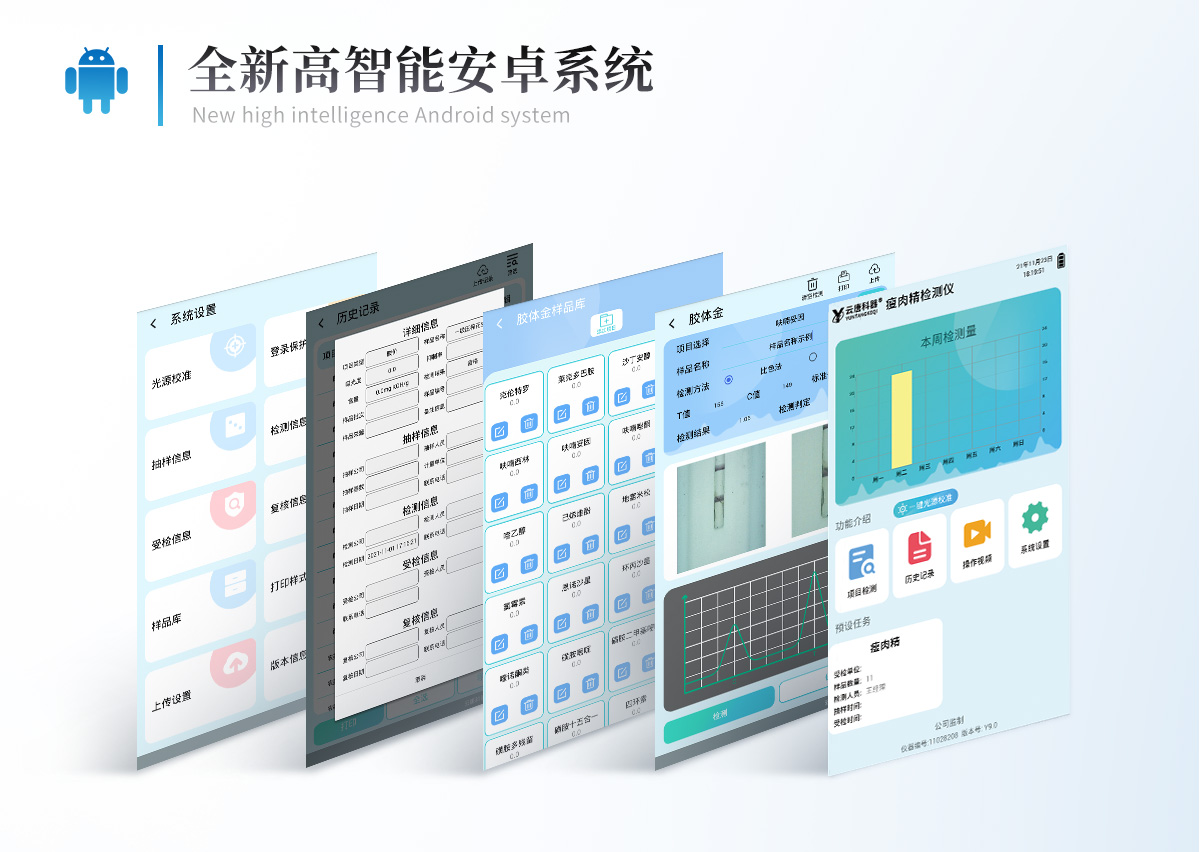 | 儀器采用10.1英寸液晶觸摸屏顯,搭配運行安卓智能操作系統(tǒng),主控芯片采用ARM Cortex-A7,RK3288/4核處理器,主頻1.88Ghz,運轉(zhuǎn)速度更快速,性能更強。 | 儀器功能包括:膠體金檢測模塊、數(shù)字化管理模塊、無線通訊模塊等,可以滿足同一軟件下實現(xiàn)所有檢測項目的檢測,并在同一窗口展示檢測結(jié)果。 | 一體化便攜式快檢設(shè)備,采用交直流兩用供電方式,可連接車載電源,配備6ah大容量充電鋰電池,可以滿足現(xiàn)場及流動檢測使用的需求。儀器尺寸:43×35×20cm, 主機凈重:5.1kg | 系統(tǒng)自帶數(shù)據(jù)集成模塊,設(shè)備首頁自動統(tǒng)計檢測數(shù)據(jù)包含:周檢測數(shù)據(jù)、月檢測數(shù)據(jù),全部檢測總數(shù)量,均包含檢測總數(shù),合格數(shù),不合格數(shù),以及相關(guān)柱形分析圖,對各項檢測數(shù)據(jù)清晰掌握,無需電腦查詢,更加快捷直觀。 | 儀器具有任務(wù)預(yù)設(shè)模塊,可在樣品送檢前提前預(yù)設(shè)樣品名稱、檢測指標(biāo)、送檢單位等信息,樣品送檢時一鍵調(diào)取保存信息,檢測更加方便快捷。 | 軌道式自動傳輸掃描方式,可實時顯示金標(biāo)卡實時圖像,系統(tǒng)自動分析并呈現(xiàn)出CT曲線圖,CT線自動識別,無需手動調(diào)整,完成檢測后自動退出檢測卡。 | 膠體金模塊檢測方式:軌道式自動傳輸掃描,檢測完成后自動退出檢測卡。 | 儀器檢測系統(tǒng)擁有龐大數(shù)據(jù)庫,并且構(gòu)建了完善的檢索、修訂功能。食品庫涵蓋多種樣品名稱,可按需添加或刪除、編輯樣品名稱;產(chǎn)品數(shù)據(jù)庫以及歷史檢測記錄支持一鍵檢索功能。 | 系統(tǒng)打印自定義化,打印格式多樣化,產(chǎn)品合格證(國家標(biāo)準(zhǔn)要求),二維碼,抽樣信息、檢測信息,受檢信息、復(fù)核信息、抽樣日期、檢測日期等信息結(jié)果,可按需求自行設(shè)置打印內(nèi)容。 | A4紙版本報告打印功能(可選配):設(shè)備擁有兩種結(jié)果展示方式,可以自動生成A4打印模板和小票打印模板兩種樣式,可通過WiFi及網(wǎng)線等方式鏈接外置打印機可進(jìn)行打印 | 儀器具有 wifi 聯(lián)網(wǎng)上傳、RJ45網(wǎng)線連接功能,可以快速上傳數(shù)據(jù)。同步對接監(jiān)管平臺,數(shù)據(jù)可局域網(wǎng)和互聯(lián)網(wǎng)數(shù)據(jù)上傳,檢測結(jié)果直接傳至食品安全監(jiān)管平臺。進(jìn)行區(qū)域食品安全監(jiān)管及大數(shù)據(jù)分析處理與數(shù)據(jù)統(tǒng)計,檢測區(qū)域食品安全長短期動態(tài),達(dá)到食品安全問題預(yù)估、預(yù)警。 | 設(shè)備支持U盤存儲,標(biāo)準(zhǔn)USB接口,免驅(qū)動安裝。檢測結(jié)果存儲容量20萬條以上,可生成Excel表格,進(jìn)行一鍵拷貝,并具有登錄保護(hù)功能,可設(shè)置用戶名及密碼,規(guī)范不同人員操作權(quán)限,防止非工作人員操作,并且可以進(jìn)行重新校準(zhǔn)、鎖定、恢復(fù)出廠設(shè)置功能。儀器固件可升級,后期檢測項目可擴(kuò)充。 | 儀器具備遠(yuǎn)程升級功能,可定向分客戶分儀器更新,開機后自動更新,并可持續(xù)性免費更新系統(tǒng)版本,無需像傳統(tǒng)產(chǎn)品返廠更新,節(jié)省時間及人力成本并避免了物流運輸返廠升級導(dǎo)致設(shè)備損壞的潛在風(fēng)險。 |