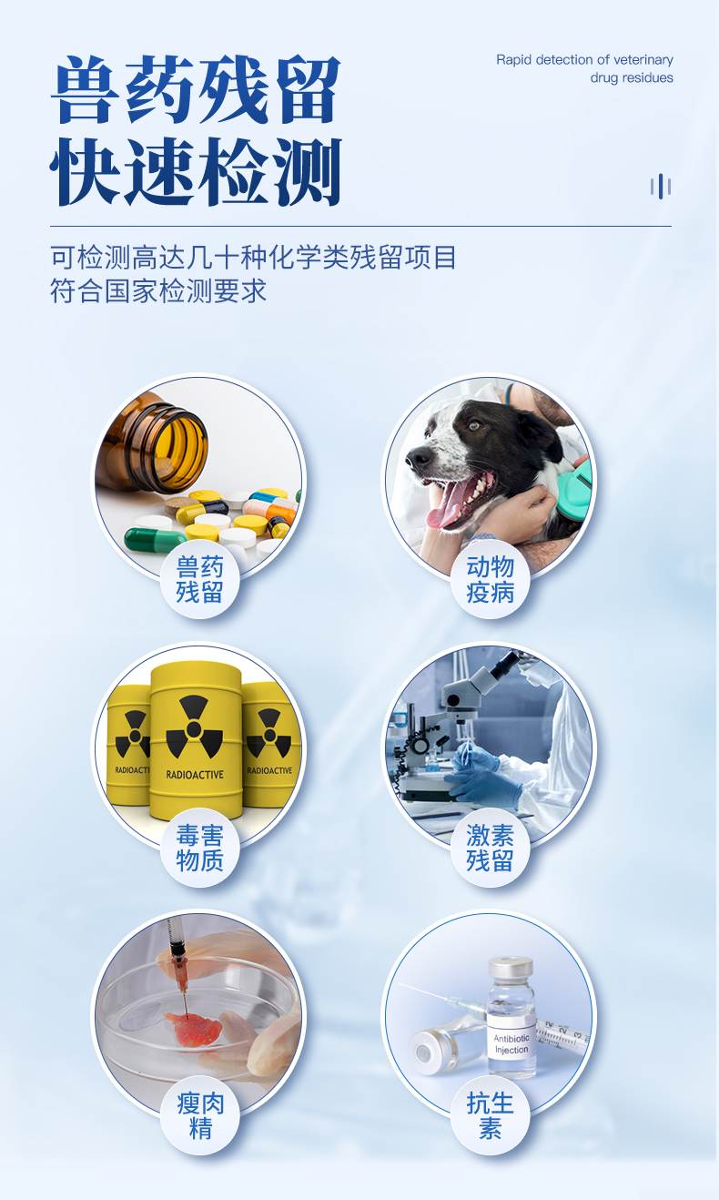 山東云唐智能科技有限公司生產(chǎn)的瘦肉精檢測儀可現(xiàn)場快速檢測鹽酸克倫特羅、萊克多巴胺、沙丁胺醇、己烯雌酚、喹乙醇等。儀器預(yù)留其他項目檢測程序和端口,根據(jù)日后需求可進行遠程設(shè)備升級。日后可升級為檢測抗生素、獸藥殘留、動物疫病等檢測項目的綜合類型儀器。