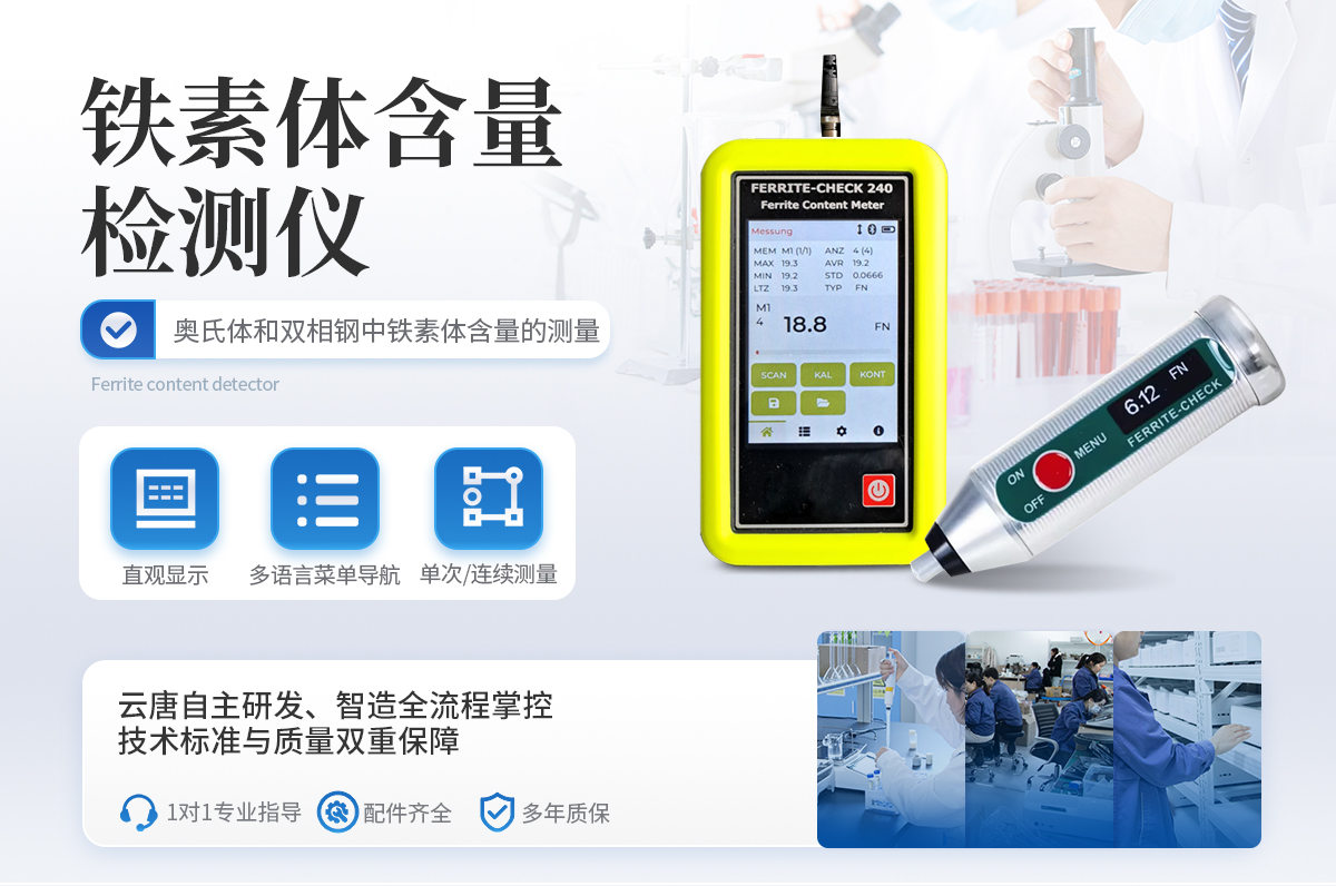 鐵素體含量檢測儀操作簡單 List-Magnetik公司 FERRITE-CHECK 140鐵素體含量檢測儀是一款設計緊湊、使用方便的便攜儀器,儀器配有集成探頭,儀器符合Basel標準DIN EN ISO 8249,使用磁感應法測量奧氏體鋼和雙相鋼中的鐵素體含量。 高亮OLED顯示鐵素體含量 FERRITE-CHECK 140鐵素體含量檢測儀只有一個按鈕,并配有多語言菜單導航,非常易于使用。高亮度OLED屏顯示FN或Fe%的測量結果。 測量焊縫中的鐵素體含量 特別是對于焊接的雙相鋼,重要的是要知道焊縫是否有足夠的鐵素體含量來保證焊縫的強度。鐵素體含量低的話,焊縫受熱后較容易產生裂紋,但如果鐵素體含量過高,焊縫的韌性和延展性將會喪失。 快速連續(xù)鐵素體含量測量 使用FERRITE-CHECK 140鐵素體含量檢測儀,可以非常準確和快速地測定鐵素體含量。檢測光滑或拋光表面上的焊縫時,可以將儀器切換到快速連續(xù)測量模式。當探頭放置在表面上并沿表面移動時,測量值將連續(xù)存儲,在提起探頭后,屏幕將顯示的*小值、**值和平均值組成的統(tǒng)計信息。 校準鐵素體含量檢測儀 FERRITE-CHECK 140鐵素體含量檢測儀配有3個校準標準片,可追溯到NIST 管理和發(fā)送測量數(shù)據(jù)與免費的應用程序 為了進一步處理測量數(shù)據(jù),您可以將FERRITE-CHECK 140鐵素體含量檢測儀與移動Android和iOS設備配對。或者與一臺Windows電腦通信。這是由低功耗藍牙技術(BLE)實現(xiàn)的。使用Lima Connect應用程序,您可以管理項目并在照片上分配測量點。測量結果可以統(tǒng)計評估和圖形顯示。這款應用適用于安卓、iOS和Windows系統(tǒng),軟件免費的。