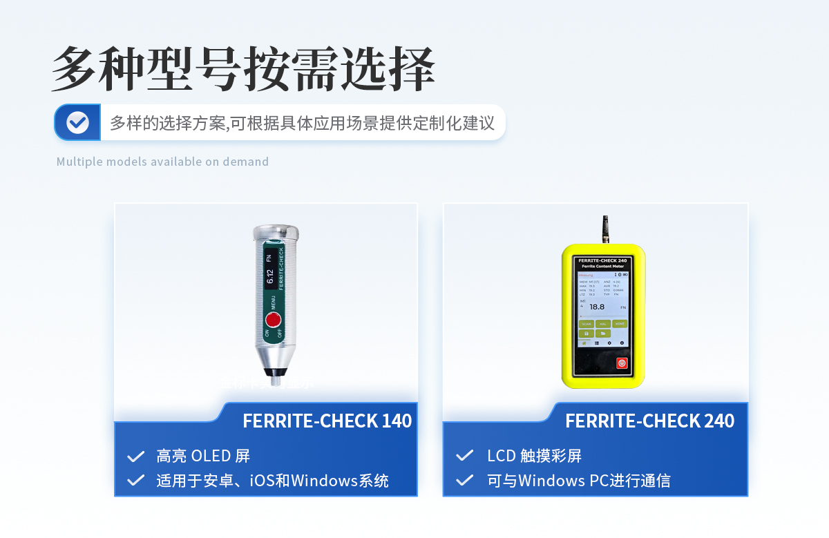 FERRITE-CHECK 240鐵素體含量檢測儀采用分體式的設計,使用方便,儀器符合Basel標準DIN EN ISO 8249,使用磁感應法測量奧氏體鋼和雙相鋼中的鐵素體含量。 全新測頭