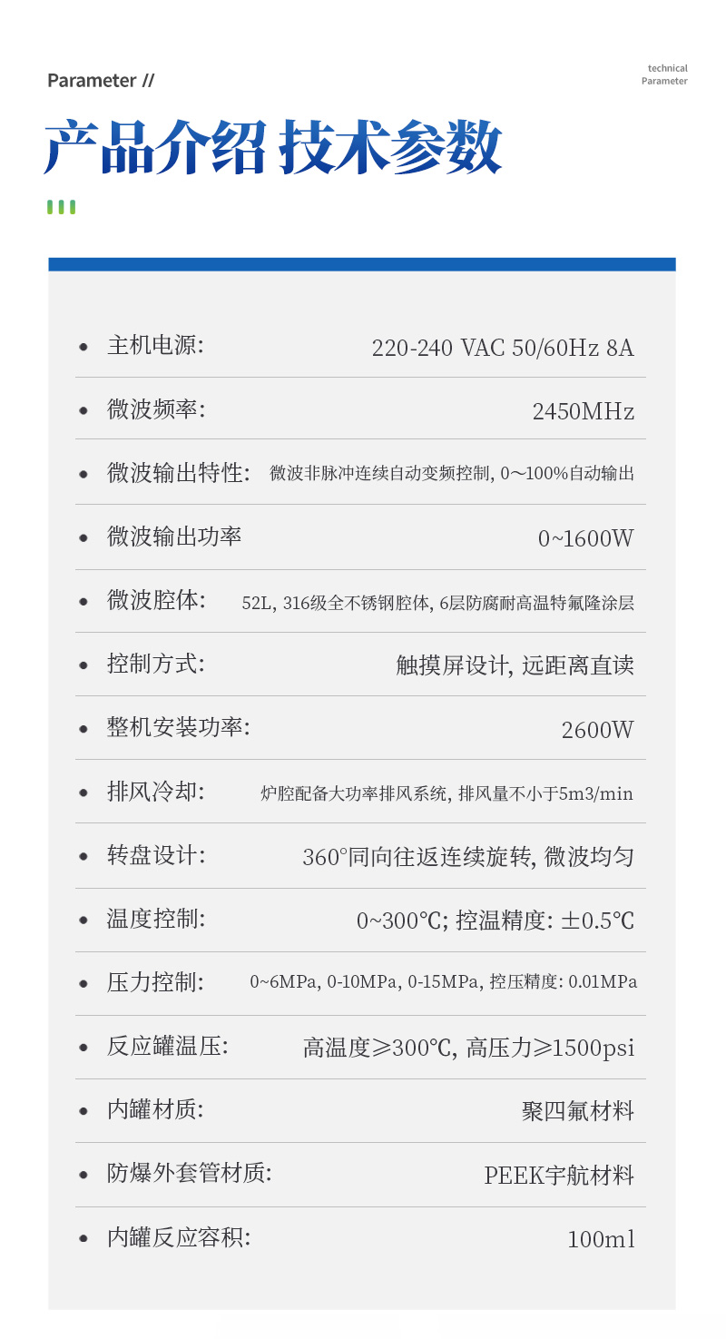 主機(jī)參數(shù);1.1電 源:220-240 VAC 50/60Hz 8A ;微波頻率:2450MHz;整機(jī)安裝功率:2600W;(1)電源要求:220 VAC 50 Hz 15A;(2)微波源:(3)微波輸出功率 :0~1600W;(4)微波輸出特性:微波非脈沖連續(xù)自動(dòng)變頻控制,0~100%自動(dòng)輸出;(5)微波均勻性:垂直雙向波導(dǎo)設(shè)計(jì),三維輸出技術(shù),匹配諧波功頻實(shí)現(xiàn)了高度的場均勻性;(6)微波腔體:52L,316級全不銹鋼腔體,6層防腐耐高溫特氟隆涂層;(7)自鎖式緩沖防爆爐門,在危險(xiǎn)出現(xiàn)時(shí)能自動(dòng)提前釋放橫向壓力沖擊,確保操作人員人身安全和爐門結(jié)構(gòu)  完整無損;(8)排風(fēng)和冷卻系統(tǒng):爐腔配備大功率排風(fēng)系統(tǒng),各種反應(yīng)可在通風(fēng),安全和易于觀察的環(huán)境下長時(shí)間連續(xù)進(jìn)行。爐腔通風(fēng)采用耐酸蝕,大風(fēng)量離心式風(fēng)機(jī),排風(fēng)量不小于5m3/min;爐腔內(nèi)具有風(fēng)冷功能,持續(xù)為反應(yīng)罐降溫,溫度和壓力實(shí)時(shí)顯示。(9)轉(zhuǎn)盤設(shè)計(jì):360°同向往返連續(xù)旋轉(zhuǎn),微波均勻,保證各個(gè)樣品微波環(huán)境相同,提高實(shí)驗(yàn)結(jié)果的一致性。(10)控制方式:觸摸屏設(shè)計(jì),8寸TFT-LED(800X480彩)大屏幕顯示,遠(yuǎn)距離直讀反應(yīng)進(jìn)程,實(shí)時(shí)顯示密閉反應(yīng)罐溫度、壓力,并可實(shí)時(shí)顯示溫壓曲線;(11)操作語言:中文簡體(12)自動(dòng)保護(hù)功能:具有故障自檢系統(tǒng);當(dāng)控溫和控壓中某一系統(tǒng)失靈時(shí),儀器會(huì)自動(dòng)切斷微波發(fā)射,并且報(bào)警;