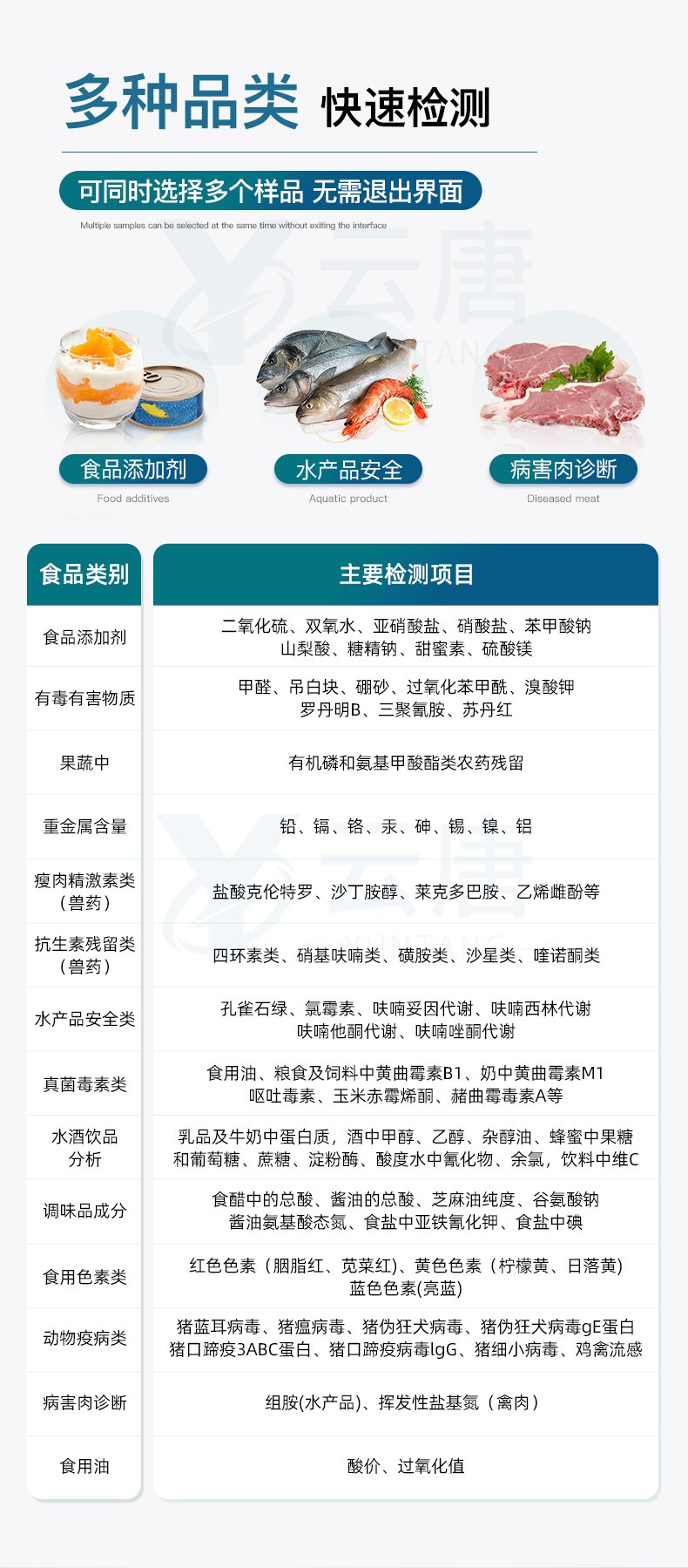 山東云唐智能科技有限公司生產(chǎn)的高智能食品安全檢測儀為集成化食品安全快速檢測分析設(shè)備,采用臺式一體化設(shè)計(jì),可快速檢測200多種食品安全項(xiàng)目,包含非食用化學(xué)物質(zhì)、濫用食品添加劑、農(nóng)藥殘留、獸藥殘留、重金屬、病害肉、營養(yǎng)強(qiáng)化劑、抗生素類殘留、激素類殘留、真菌毒素類殘留、化學(xué)類殘留等項(xiàng)目的定性定量檢測。目前廣泛應(yīng)用于市場監(jiān)管局、檢測中心、衛(wèi)生監(jiān)督部門、農(nóng)業(yè)部門、院校及各單位食堂、食品肉產(chǎn)品深加工企業(yè)、商超市場、司法部門、餐飲機(jī)構(gòu)、養(yǎng)殖場、屠宰場、檢驗(yàn)檢疫部門等單位。
