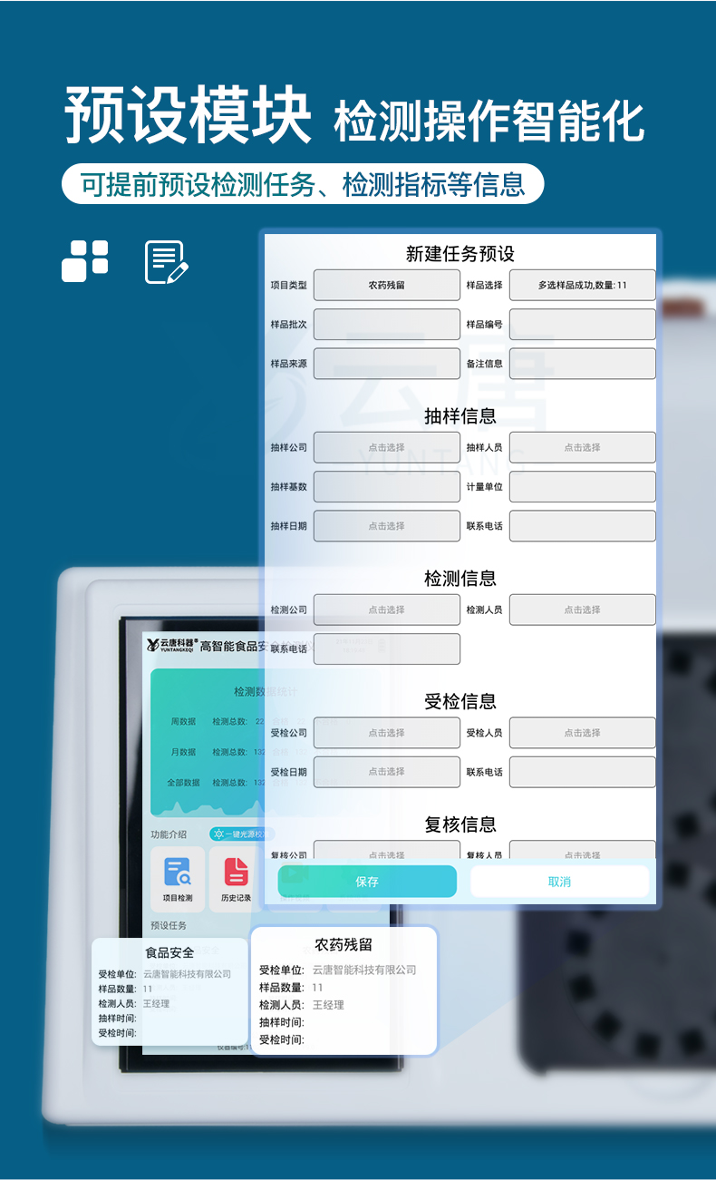 山東云唐智能科技有限公司生產(chǎn)的高智能食品安全檢測(cè)儀為集成化食品安全快速檢測(cè)分析設(shè)備,采用臺(tái)式一體化設(shè)計(jì),可快速檢測(cè)200多種食品安全項(xiàng)目,包含非食用化學(xué)物質(zhì)、濫用食品添加劑、農(nóng)藥殘留、獸藥殘留、重金屬、病害肉、營(yíng)養(yǎng)強(qiáng)化劑、抗生素類殘留、激素類殘留、真菌毒素類殘留、化學(xué)類殘留等項(xiàng)目的定性定量檢測(cè)。目前廣泛應(yīng)用于市場(chǎng)監(jiān)管局、檢測(cè)中心、衛(wèi)生監(jiān)督部門、農(nóng)業(yè)部門、院校及各單位食堂、食品肉產(chǎn)品深加工企業(yè)、商超市場(chǎng)、司法部門、餐飲機(jī)構(gòu)、養(yǎng)殖場(chǎng)、屠宰場(chǎng)、檢驗(yàn)檢疫部門等單位。