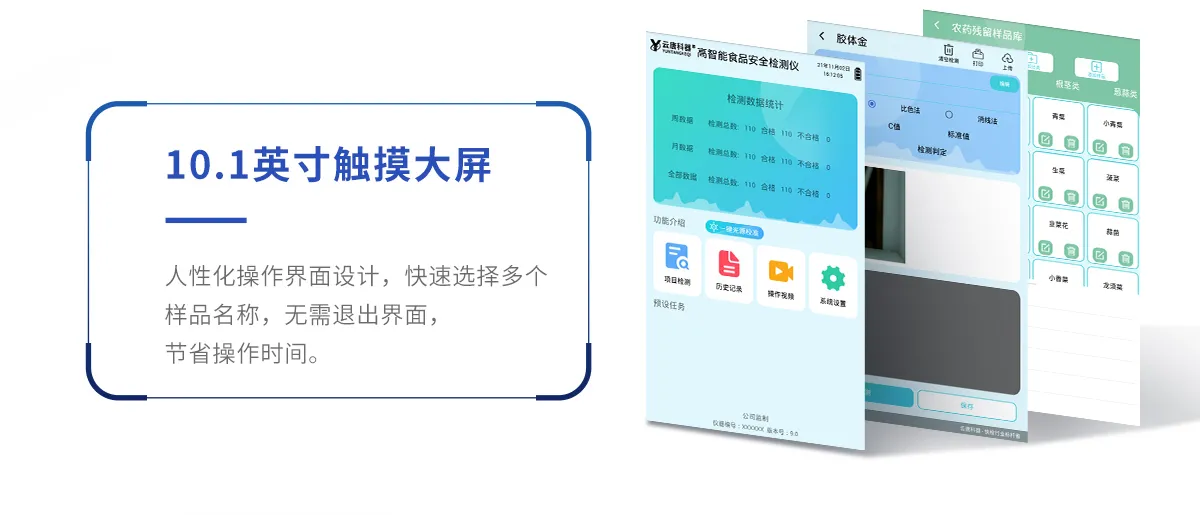 儀器采用手提式一體化系統(tǒng)檢測技術(shù),將分光光度模塊、膠體金檢測模塊、新型農(nóng)殘檢測模塊、數(shù)字化管理模塊、無線通訊模塊高度集成于一體,支持檢測200種食品安全檢測項(xiàng)目,同時(shí)預(yù)留升級(jí)檢測方法。儀器檢測模塊標(biāo)準(zhǔn)化、智能化,檢測項(xiàng)目可隨意自由組合。檢測箱體內(nèi)置多個(gè)標(biāo)準(zhǔn)檢測單元,檢測模塊可以調(diào)整配置。 顯示屏幕:儀器采用10.1英寸豎向液晶觸摸屏顯,搭配運(yùn)行安卓智能操作系統(tǒng),主控芯片采用ARM Cortex-A7,RK3288/4核處理器,主頻1.88Ghz,操作方便,性能更強(qiáng)。檢測通道:≥12通道;采用精密旋轉(zhuǎn)比色池設(shè)計(jì),使用同芯片同光源校準(zhǔn)精度,解決不同光源之間的誤差值,更加準(zhǔn)確**。(1-12通道間誤差0.1%,***:**202022821055.2)儀器光源:高精度進(jìn)口四波長冷光源,每個(gè)通道均配置 410、520、590、630nm 波長光源,標(biāo)配**的光路切換裝置,專利光路切換功能可實(shí)現(xiàn)64波長,并且所有檢測項(xiàng)目可實(shí)現(xiàn)所有通道同時(shí)檢測。設(shè)備可一鍵校準(zhǔn),自動(dòng)保存校準(zhǔn)數(shù)據(jù),自動(dòng)對(duì)比校驗(yàn),得到精準(zhǔn)光源,采用Android SP存儲(chǔ)數(shù)據(jù),光源數(shù)據(jù)永不丟失,方便每一次使用。通訊接口:配備無線通信模塊、4G(APN)通訊模塊、藍(lán)牙傳輸,同時(shí)具有雙USB接口以及RJ45網(wǎng)線接口,可以多方式實(shí)現(xiàn)數(shù)據(jù)保存及數(shù)據(jù)傳輸。 存儲(chǔ)方式:支持U盤存儲(chǔ),標(biāo)準(zhǔn)USB接口,免驅(qū)動(dòng)安裝。檢測結(jié)果存儲(chǔ)容量20萬條以上,可生成Excel表格進(jìn)行拷貝,并具有登錄保護(hù)功能。智能化操作系統(tǒng):: ★操作系統(tǒng):儀器可在同一檢測界面自動(dòng)對(duì)應(yīng)相關(guān)檢測通道,一次性選擇1-12個(gè)樣品名稱,無需退出界面,節(jié)省操作時(shí)間。并可以對(duì)每個(gè)通道屬性和樣品信息單獨(dú)進(jìn)行編輯,例如送檢單位、人員,檢測人員等,打印時(shí)勾選打印顯示。★數(shù)據(jù)集成系統(tǒng):設(shè)備首頁自動(dòng)匯總分析檢測數(shù)據(jù),包含:周檢測數(shù)據(jù)、月檢測數(shù)據(jù),全部檢測總數(shù)量,均包含檢測總數(shù),合格數(shù),不合格數(shù),以及相關(guān)柱形分析圖,各項(xiàng)檢測數(shù)據(jù)一目了然,無需電腦查詢,更加快捷直觀。★數(shù)據(jù)庫系統(tǒng):十幾項(xiàng)數(shù)據(jù)庫分類管理儀器:包含項(xiàng)目類型、項(xiàng)目數(shù)據(jù)、檢測數(shù)據(jù)、歷史記錄、國標(biāo)信息、曲線信息、采樣信息、檢測信息、受檢信息、復(fù)核信息、圖表信息、光源校準(zhǔn)信息、打印樣式信息、樣品庫信息等等,數(shù)據(jù)庫之間互相協(xié)調(diào)聯(lián)動(dòng)保證數(shù)據(jù)的真實(shí)完整性。同時(shí)產(chǎn)品數(shù)據(jù)庫以及歷史檢測記錄支持一鍵檢索功能。★限量規(guī)判系統(tǒng):具有限量查詢、添加物質(zhì)合規(guī)判定系統(tǒng)。檢測出結(jié)果后,系統(tǒng)自動(dòng)調(diào)用系統(tǒng)數(shù)據(jù)庫中相關(guān)國標(biāo)進(jìn)行比對(duì)判定,客觀顯示判定結(jié)果是否合格★項(xiàng)目預(yù)設(shè)系統(tǒng):儀器具有任務(wù)預(yù)設(shè)模塊,一鍵提前預(yù)設(shè),給出方便快捷的新檢測方案,每一個(gè)任務(wù)分別可以設(shè)置不同的樣品、批次、編號(hào)、來源、備注、抽樣信息、檢測信息、受檢信息、復(fù)核信息等更多信息。樣品送檢時(shí)一鍵調(diào)取保存信息,并可多次調(diào)取,大大提高檢測效率。★數(shù)據(jù)監(jiān)管系統(tǒng):同步對(duì)接監(jiān)管平臺(tái),數(shù)據(jù)可局域網(wǎng)和互聯(lián)網(wǎng)數(shù)據(jù)上傳,檢測結(jié)果可選擇直接傳至食品安全監(jiān)管平臺(tái)。進(jìn)行區(qū)域食品安全監(jiān)管及大數(shù)據(jù)分析處理與數(shù)據(jù)統(tǒng)計(jì),檢測區(qū)域食品安全長短期動(dòng)態(tài),達(dá)到食品安全問題預(yù)估、預(yù)警。★打印系統(tǒng):內(nèi)置全新打印機(jī),新創(chuàng)自定義打印方式,可按需靈活勾選控制:產(chǎn)品合格證(國家農(nóng)業(yè)部標(biāo)準(zhǔn)要求),二維碼,抽樣信息、檢測信息,受檢信息、復(fù)核信息、抽樣日期、檢測日期等信息的打印。供電模式:儀器交直流兩用,直流12V供電,可連接車載電源,可配6ah大容量充電鋰電池,電量可實(shí)時(shí)顯示,方便戶外流動(dòng)測試。膠體金檢測模塊:采用雙通道CMOS成像處理技術(shù)及膠體金免疫層析技術(shù),可同時(shí)讀取雙膠體金卡數(shù)據(jù),自動(dòng)采集、處理分析,將檢測結(jié)果顯示,并可根據(jù)參考限值自動(dòng)判斷檢測結(jié)果,可檢測常見的獸藥殘留、生物毒素、抗生素、違禁添加物等。★探測技術(shù):CMOS成像探測;★檢測通道:1個(gè)通道;★檢測方式:消線法和比色法;★顯示模式:陰性或陽性;★曲線形式:軌道式掃描方式,顯示金標(biāo)卡圖像,實(shí)時(shí)生成、識(shí)別CT曲線圖,無需手動(dòng)調(diào)整,完成檢測后自動(dòng)退出檢測卡。兼容市場上其他金標(biāo)卡,使用耗材不受限制。儀器加入遠(yuǎn)程升級(jí)功能,可定向分客戶分儀器更新,開機(jī)后自動(dòng)更新,客戶無