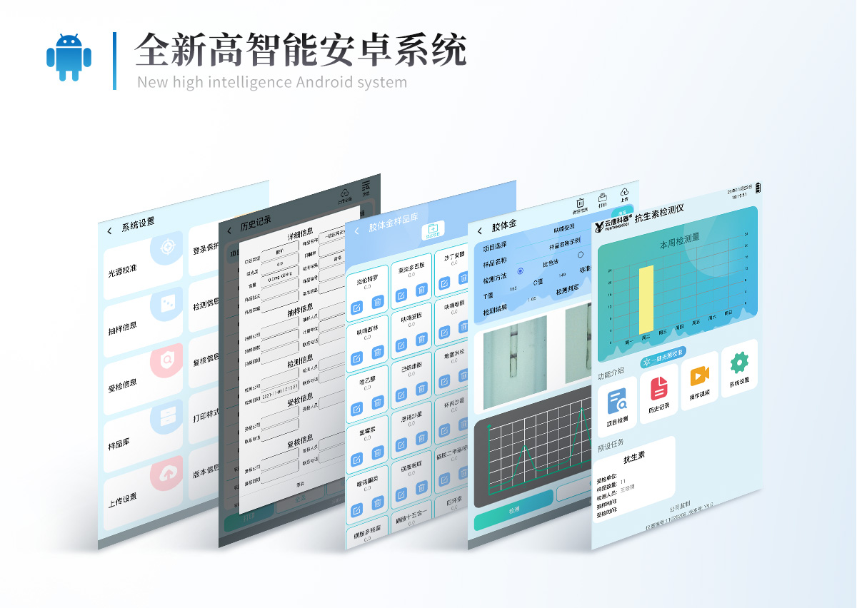 儀器采用10.1英寸液晶觸摸屏顯,搭配運行安卓智能操作系統(tǒng),主控芯片采用ARM Cortex-A7,RK3288/4核處理器,主頻1.88Ghz,運轉(zhuǎn)速度更快速,性能更強。儀器功能包括:膠體金檢測模塊、數(shù)字化管理模塊、無線通訊模塊等,可以滿足同一軟件下實現(xiàn)所有檢測項目的檢測,并在同一窗口展示檢測結(jié)果。一體化便攜式快檢設備,采用交直流兩用供電方式,可連接車載電源,配備6ah大容量充電鋰電池,可以滿足現(xiàn)場及流動檢測使用的需求。儀器尺寸:43×35×20cm,   主機凈重:5.1kg系統(tǒng)自帶數(shù)據(jù)集成模塊,設備首頁自動統(tǒng)計檢測數(shù)據(jù)包含:周檢測數(shù)據(jù)、月檢測數(shù)據(jù),全部檢測總數(shù)量,均包含檢測總數(shù),合格數(shù),不合格數(shù),以及相關柱形分析圖,對各項檢測數(shù)據(jù)清晰掌握,無需電腦查詢,更加快捷直觀。儀器具有任務預設模塊,可在樣品送檢前提前預設樣品名稱、檢測指標、送檢單位等信息,樣品送檢時一鍵調(diào)取保存信息,檢測更加方便快捷。軌道式自動傳輸掃描方式,可實時顯示金標卡實時圖像,系統(tǒng)自動分析并呈現(xiàn)出CT曲線圖,CT線自動識別,無需手動調(diào)整,完成檢測后自動退出檢測卡。結(jié)果判定線可修改,對照值標定值可保存,斷電不丟失數(shù)據(jù)。兼容市場上其他膠體金卡,使用耗材不受限制,極大增強用戶使用體驗。儀器檢測系統(tǒng)擁有龐大數(shù)據(jù)庫,并且構(gòu)建了完善的檢索、修訂功能。食品庫涵蓋多種樣品名稱,可按需添加或刪除、編輯樣品名稱;產(chǎn)品數(shù)據(jù)庫以及歷史檢測記錄支持一鍵檢索功能。系統(tǒng)打印自定義化,打印格式多樣化,產(chǎn)品合格證(國家標準要求),二維碼,抽樣信息、檢測信息,受檢信息、復核信息、抽樣日期、檢測日期等信息結(jié)果,可按需求自行設置打印內(nèi)容。A4紙版本報告打印功能(可選配):設備擁有兩種結(jié)果展示方式,可以自動生成A4打印模板和小票打印模板兩種樣式,可通過WiFi及網(wǎng)線等方式鏈接外置打印機可進行打印儀器具有 wifi 聯(lián)網(wǎng)上傳、RJ45網(wǎng)線連接功能,可以快速上傳數(shù)據(jù)。同步對接監(jiān)管平臺,數(shù)據(jù)可局域網(wǎng)和互聯(lián)網(wǎng)數(shù)據(jù)上傳,檢測結(jié)果直接傳至食品安全監(jiān)管平臺。進行區(qū)域食品安全監(jiān)管及大數(shù)據(jù)分析處理與數(shù)據(jù)統(tǒng)計,檢測區(qū)域食品安全長短期動態(tài),達到食品安全問題預估、預警。設備支持U盤存儲,標準USB接口,免驅(qū)動安裝。檢測結(jié)果存儲容量20萬條以上,可生成Excel表格,進行一鍵拷貝,并具有登錄保護功能,可設置用戶名及密碼,規(guī)范不同人員操作權(quán)限,防止非工作人員操作,并且可以進行重新校準、鎖定、恢復出廠設置功能。儀器固件可升級,后期檢測項目可擴充。儀器具有重新校準、鎖定、恢復出廠設置功能。儀器具備遠程升級功能,可定向分客戶分儀器更新,開機后自動更新,并可持續(xù)性免費更新系統(tǒng)版本,無需像傳統(tǒng)產(chǎn)品返廠更新,節(jié)省時間及人力成本并避免了物流運輸返廠升級導致設備損壞的潛在風險。