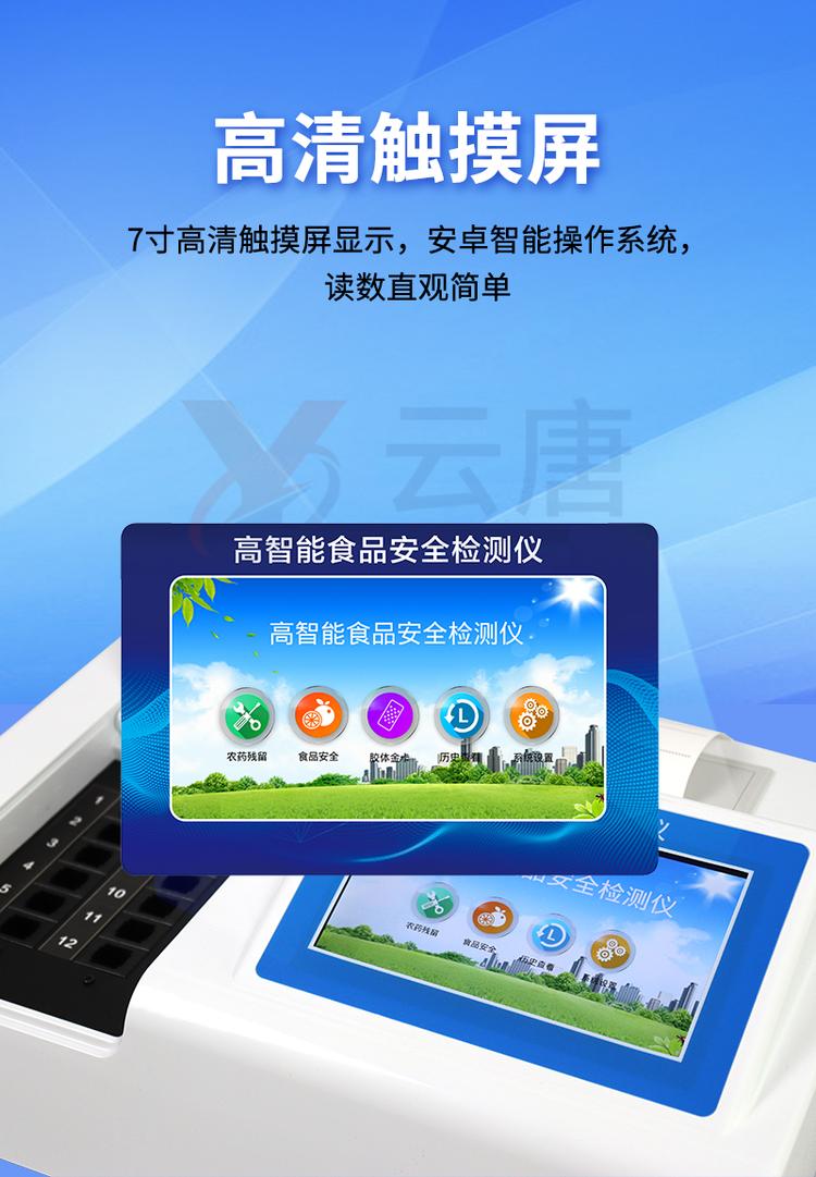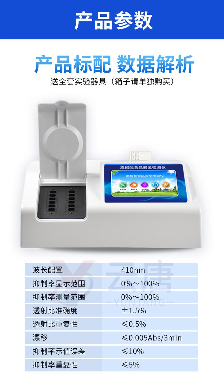 | 儀器采用臺式一體化系統(tǒng)檢測技術(shù),將分光光度模塊、新型農(nóng)殘檢測模塊、數(shù)字化管理模塊、無線通訊模塊高度集成于一體,支持檢測200種食品安全檢測項目,同時預(yù)留升級檢測方法。 | 儀器檢測模塊標(biāo)準(zhǔn)化、智能化,可隨意自由組合。檢測箱體內(nèi)置多個標(biāo)準(zhǔn)檢測單元,檢測模塊可以調(diào)整配置。 | 儀器采用全新安卓智能系統(tǒng),主控芯片采用 ARM Cortex-A7,RK3288/4核處理器,10.1寸高清液晶觸摸豎屏,更加**的UI交互界面,運轉(zhuǎn)快捷;儀器配備無線通信模塊: 4G(APN)通訊模塊、Wifi模塊,藍(lán)牙傳輸,同時具有雙USB接口以及RJ45接口能以多種方式實現(xiàn)數(shù)據(jù)保存和數(shù)據(jù)傳輸功能。 | 創(chuàng)新檢測模式: | ★檢測通道:≥12通道;采用精密旋轉(zhuǎn)比色池設(shè)計,使用同芯片同光源校準(zhǔn)精度,解決不同光源之間的誤差值。1-12通道間誤差0.1%。(***:**202022821055.2) | ★儀器具有自動識別比色皿檢測功能,即:將樣品比色皿放入儀器后,點擊樣品檢測,儀器自動識別比色皿進(jìn)行通道檢測。 | 進(jìn)口高精光源: | 高精度進(jìn)口四波長冷光源,通道配置 410、520、590、630nm 波長光源,一個光源芯片驅(qū)動一個光源,誤差極小,每臺設(shè)備單獨**校準(zhǔn)光源,**比對,同時參照四種不同波段光源全方位覆蓋市面上99%的農(nóng)殘食品項目檢測。 | 智能化操作系統(tǒng): | 便捷操作系統(tǒng):設(shè)備檢測時可在同一檢測界面自動對應(yīng)相關(guān)檢測通道一次性選擇1-12個樣品名稱,無須退出界面,節(jié)省操作時間。 | 數(shù)據(jù)集成系統(tǒng):設(shè)備首頁自動統(tǒng)計檢測數(shù)據(jù)包含:周檢測數(shù)據(jù)、月檢測數(shù)據(jù),全部檢測總數(shù)量,均包含檢測總數(shù),合格數(shù),不合格數(shù),以及相關(guān)柱形分析圖,對各項檢測數(shù)據(jù)清晰掌握,無需電腦查詢,更加快捷直觀。 | 項目預(yù)設(shè)系統(tǒng):支持添加單個及多個相同或不相同的任務(wù)預(yù)設(shè),一鍵快速調(diào)取,每一個任務(wù)分別可以設(shè)置不同的樣品、批次、編號、來源、備注、抽樣信息、檢測信息、受檢信息、復(fù)核信息等更多信息。無縫鏈接平臺和APP實時查看下發(fā)任務(wù)。 | 數(shù)據(jù)監(jiān)管系統(tǒng):同步對接監(jiān)管平臺,數(shù)據(jù)可局域網(wǎng)和互聯(lián)網(wǎng)數(shù)據(jù)上傳,檢測結(jié)果可選擇直接傳至食品安全監(jiān)管平臺。集成OSS輸出存儲服務(wù)、區(qū)分設(shè)備定向管理應(yīng)用,進(jìn)行區(qū)域食品安全監(jiān)管及大數(shù)據(jù)分析處理與數(shù)據(jù)統(tǒng)計,檢測區(qū)域食品安全長短期動態(tài),達(dá)到食品安全問題預(yù)估、預(yù)警。 | 自定義打印系統(tǒng):內(nèi)置全新打印系統(tǒng),新創(chuàng)自定義打印方式,可按需靈活設(shè)置開啟或關(guān)閉:產(chǎn)品合格證(國家農(nóng)業(yè)部標(biāo)準(zhǔn)要求),二維碼,抽樣信息、檢測信息,受檢信息、復(fù)核信息、抽樣日期、檢測日期等信息的打印。 | 系統(tǒng)遠(yuǎn)程更新功能:可定向分客戶分儀器更新系統(tǒng),按照不同客戶后期實際需求添加項目,無需機(jī)器返廠,即可遠(yuǎn)程實時升級全新系統(tǒng),節(jié)省時間成本及避免運輸造成設(shè)備損壞。 | 儀器主機(jī)采用一體化防水、抗壓、防撞擊、防腐蝕箱體設(shè)計,同時配備交直流供電,可連接車載電源,可選配大容量充電鋰電池,滿足現(xiàn)場野外檢測需求。 | 安全證書,放心保障:儀器具有中國計量科學(xué)研究院校準(zhǔn)證書,權(quán)威認(rèn)證。 |