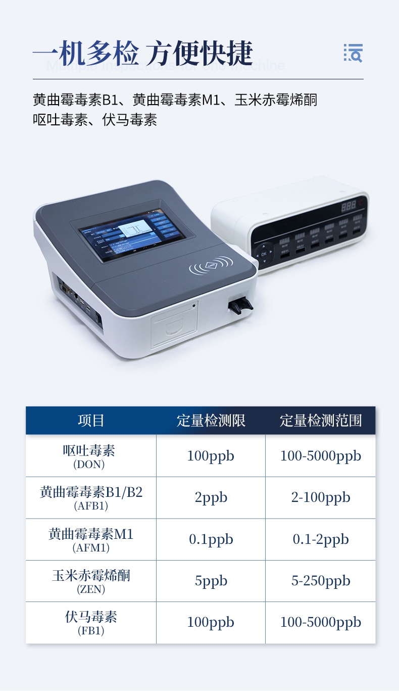 真菌毒素?zé)晒舛糠治鰞x可快速檢測(cè)糧食、飼料、谷物、食用油、調(diào)味品中如玉米、大米、小麥、大麥、糙米、麩皮、稻谷、豆粕、米糠、飼料中的黃曲霉毒素B1、黃曲霉毒素M1、玉米赤霉烯酮、嘔吐毒素、伏馬毒素,杜絕毒素污染,維護(hù)食品安全。