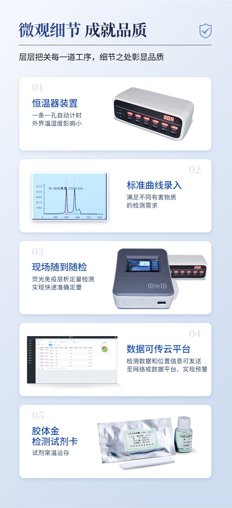 1、儀器自動(dòng)識(shí)別檢測(cè)卡條形碼上的檢測(cè)項(xiàng)目、樣本類型、檢測(cè)限、標(biāo)準(zhǔn)曲線,形成完整的檢測(cè)數(shù)據(jù)信息鏈。一卡一控,插卡后儀器自動(dòng)讀取檢測(cè)卡顯示的C、T線的熒光信號(hào),依據(jù)檢測(cè)卡內(nèi)置的標(biāo)準(zhǔn)曲線,自動(dòng)計(jì)算結(jié)果;用戶可根據(jù)自身需求,選擇設(shè)定檢測(cè)限/定量限(內(nèi)控或國(guó)家標(biāo)準(zhǔn)限量)。2、檢測(cè)數(shù)據(jù)信息采集項(xiàng)目(包括但不限于):儀器至少支持以下檢測(cè)數(shù)據(jù)采集:①檢測(cè)項(xiàng)目;②樣本類型;③檢測(cè)樣本;④?chē)?guó)家限量;⑤檢測(cè)者;⑥檢測(cè)單位;⑦檢測(cè)時(shí)間;⑧檢測(cè)線/定量限;⑨檢測(cè)編號(hào);⑩內(nèi)控限量 樣本來(lái)源等,并支持?jǐn)?shù)據(jù)采集項(xiàng)目遠(yuǎn)程擴(kuò)展升級(jí)。3、檢測(cè)數(shù)據(jù)采集方式:檢測(cè)數(shù)據(jù)信息采集項(xiàng)目中載明的:①-⑨項(xiàng)為儀器自動(dòng)識(shí)別采集,⑩項(xiàng)為手寫(xiě)輸入。4、檢測(cè)數(shù)據(jù)上傳方式:完成檢測(cè)后,儀器能自動(dòng)將檢測(cè)數(shù)據(jù)信息采集項(xiàng)目載明的全部檢測(cè)數(shù)據(jù)信息上傳至檢測(cè)監(jiān)管系統(tǒng)平臺(tái)。5、接口:藍(lán)牙通訊接口;內(nèi)置無(wú)線WIFI,檢測(cè)數(shù)據(jù)實(shí)時(shí)傳輸?shù)綌?shù)據(jù)監(jiān)管平臺(tái),客戶可通過(guò)賬號(hào)登陸在網(wǎng)絡(luò)上實(shí)時(shí)查看檢測(cè)數(shù)據(jù)6、存儲(chǔ)空間:存儲(chǔ)空間16GB。7、信息輸入:支持中英文手寫(xiě)輸入。8、本機(jī)數(shù)據(jù)管理:具有檢測(cè)數(shù)據(jù)存儲(chǔ)、查詢,批量數(shù)據(jù)刪除和打印等功能。9、檢測(cè)項(xiàng)目管理:儀器支持檢測(cè)項(xiàng)目及對(duì)應(yīng)國(guó)家限量遠(yuǎn)程增加、刪除等維護(hù)管理。10、操作權(quán)限管理:儀器支持檢測(cè)操作人員使用賬號(hào)、密碼登陸儀器的功能,支持賬號(hào)、密碼在監(jiān)管系統(tǒng)平臺(tái)進(jìn)行驗(yàn)證。11、在線學(xué)習(xí):內(nèi)置檢測(cè)項(xiàng)目操作流程簡(jiǎn)圖,教學(xué)軟件可實(shí)時(shí)在線更新。12、工作溫度:5-40℃,相對(duì)濕度:10%-90%。電源電壓220V±22V,頻率50Hz±1Hz,額定功率40W,與電源的連接方式:可拆卸電源線。13、恒溫孵育器(1)適用于定量膠體金試紙卡和反應(yīng)液體準(zhǔn)確控溫反應(yīng),以提高準(zhǔn)確性;(2)孵育器卡槽數(shù)6個(gè),每個(gè)卡槽時(shí)間獨(dú)立控制;(3)插入卡條后自動(dòng)倒計(jì)時(shí),倒計(jì)時(shí)結(jié)束自動(dòng)報(bào)警,并記錄超時(shí)時(shí)間;(4)內(nèi)部恒溫控制,控溫溫度:37℃,控溫精度≤0.5℃,升溫速度≤8min,溫度均勻性≤0.3℃,實(shí)時(shí)溫度顯示精度:0.1℃。